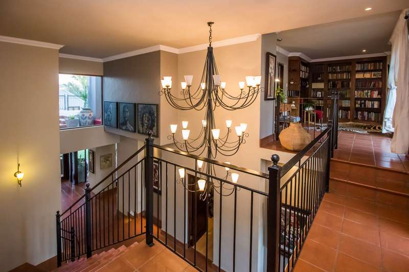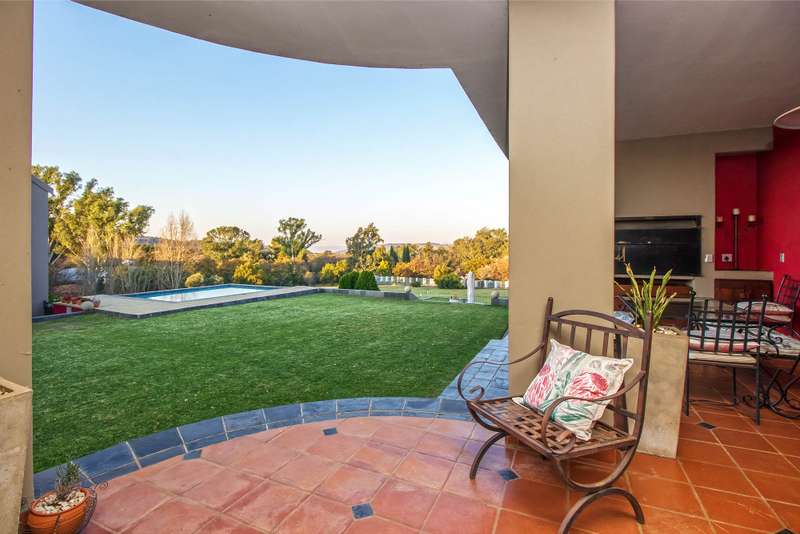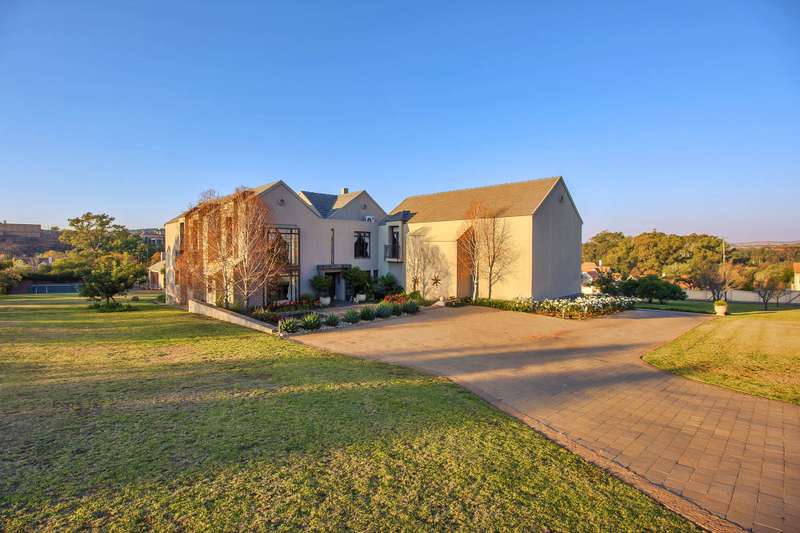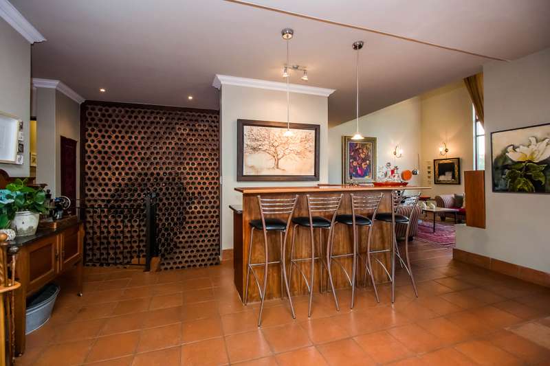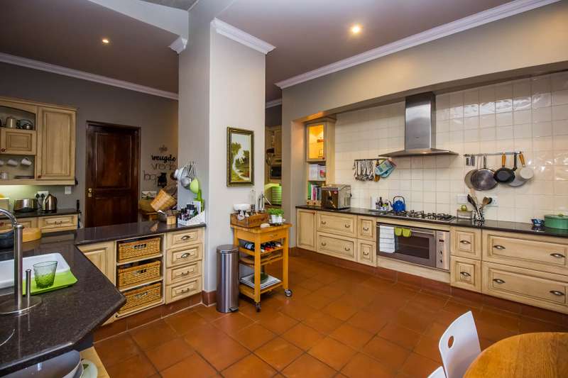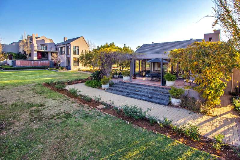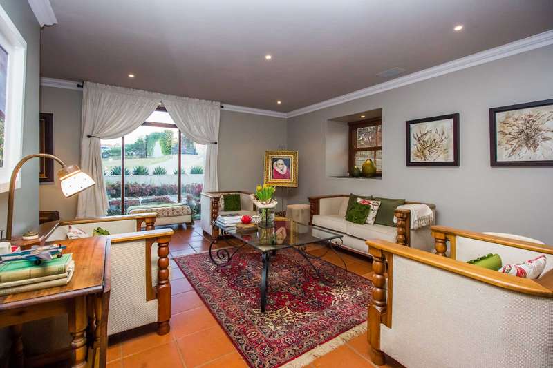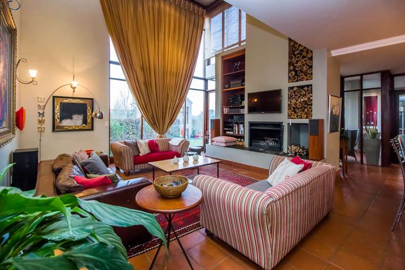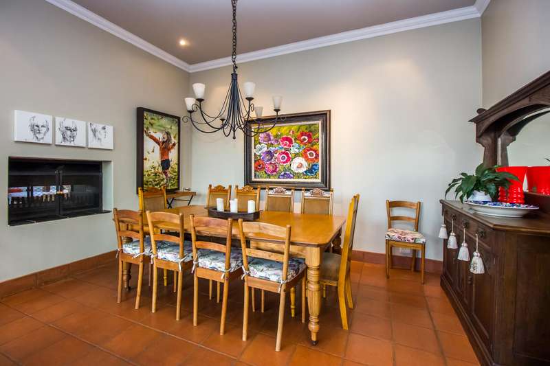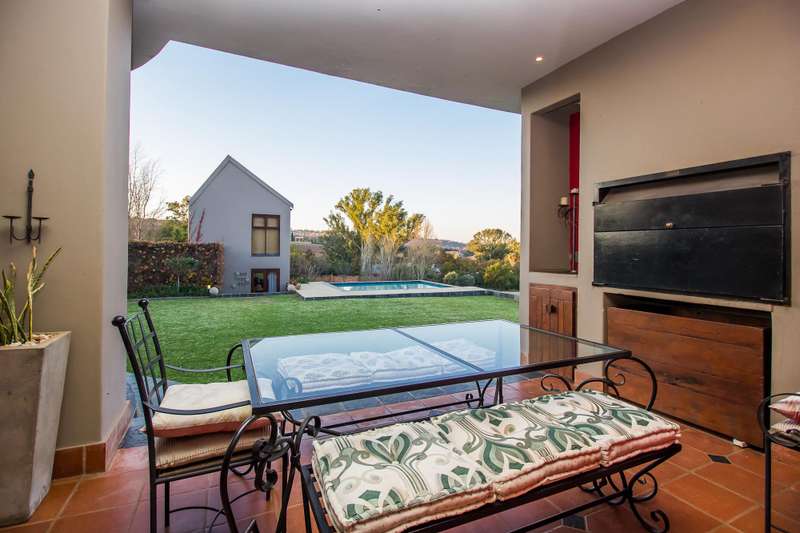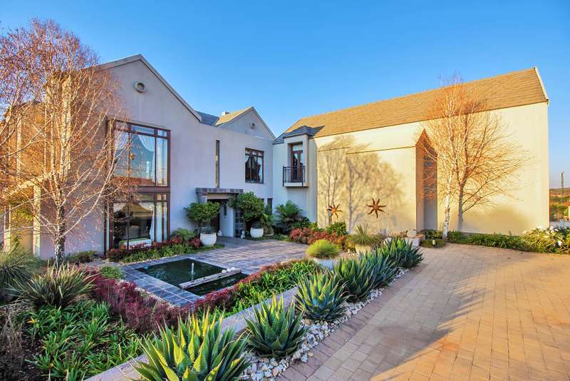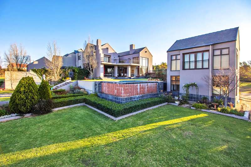 Tranquility and serenity in a secure Estate ideal for a family to grow and play. Built in a modern yet classical style this home offers a double storey with 4 bedrooms, a wine cellar and separate guest cottage. (PLEASE NOTE: THE HOUSE IS CURRENTLY UNFURNISHED and the photo's were taken at a prior date.) Huge inter flowing living spaces with double volume windows allowing unsurpassed views and a natural flow of light in to the house. The kitchen is the heart of the home with its corner window seats, built in fireplace and gas stove with granite tops. The bedrooms have ample space with built in cupboards and work stations while the master suite boast interesting architectural features such as a rounded dividing walls and lifted ceilings. The dressing room and en suite bathrooms with huge walk in shower and separate loo make the space even more lovely. The outside is as much a treasure as the interior with an open courtyard braai area, beautiful lifted pool and tennis court with adjacent playroom with built in braai / bar area and pool table. 3 garages and parking space for more cars in front of the house. Extras include: Solar / 3 phase power and water storage
