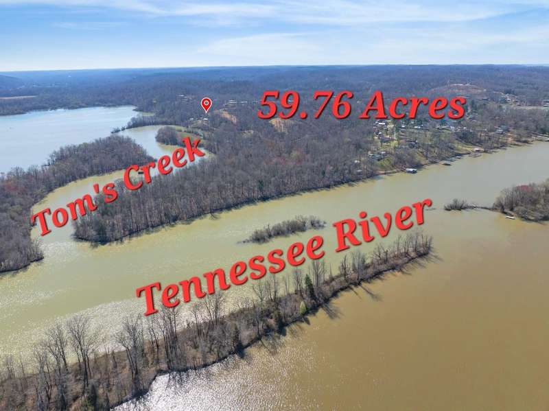 59.76 HIDDEN ACRES w/7000' WATER FRONTAGE! Nestled off a resort road, lies a rustic private drive leading to a pristine & hidden 59.76 acre tract of land surrounded by over 7000 feet of Tom's Creek waterfront-with access straight out to the Tennessee River! Newly cut roads criss cross the diverse land with 2 gated access entries from the county roads. Multiple building locations outside of floodplain with majestic views! This is an outdoor enthusiast paradise with its lush forest foliage, open fields, surrounded by water-providing excellent food, water source, & cover for the plentiful wildlife. Eagles frequent the lands, deers thrive here, plus the fishing & duck hunting is excellent! A rustic boat launch is located in front of the 2 rustic cabins which are in need of repair-or can be removed for new projects. Excellent opportunity for a private river estate,development of building & camping sites or possible marina!! Located just mins off I-40 between Nashville & Memphis.