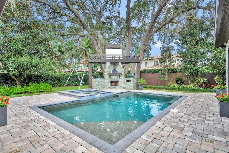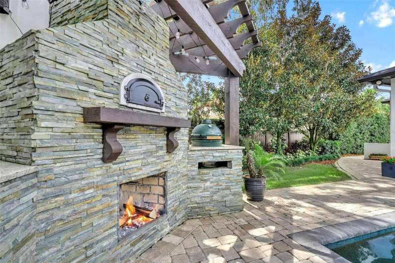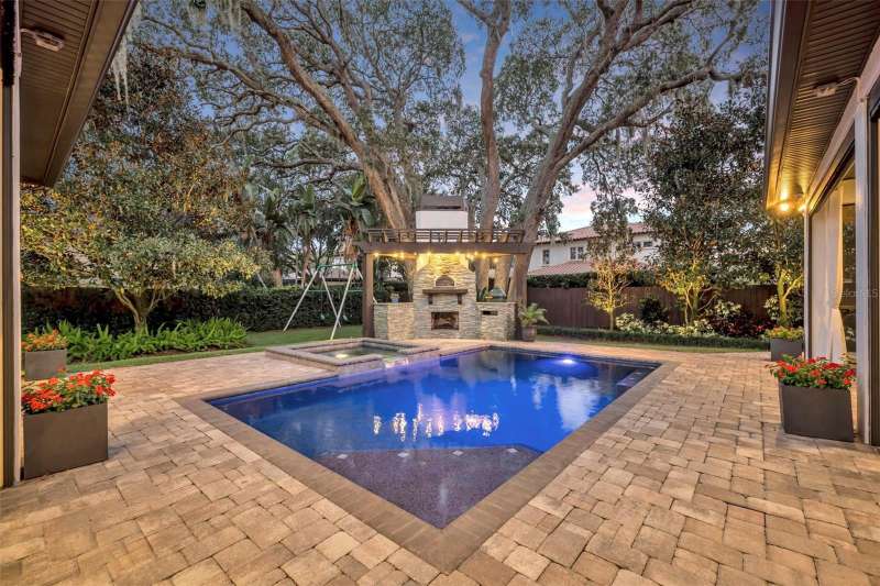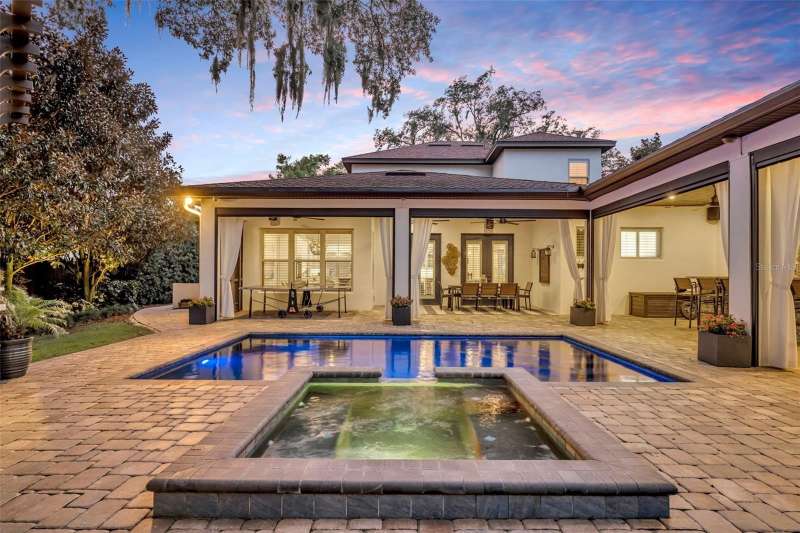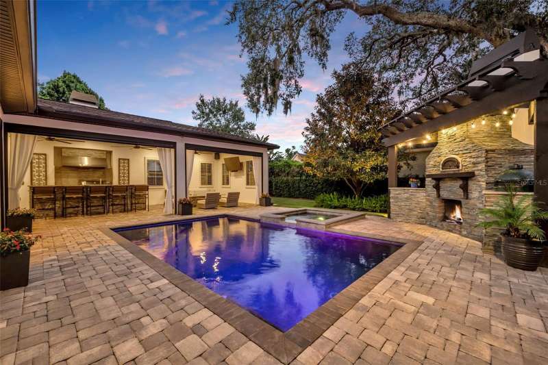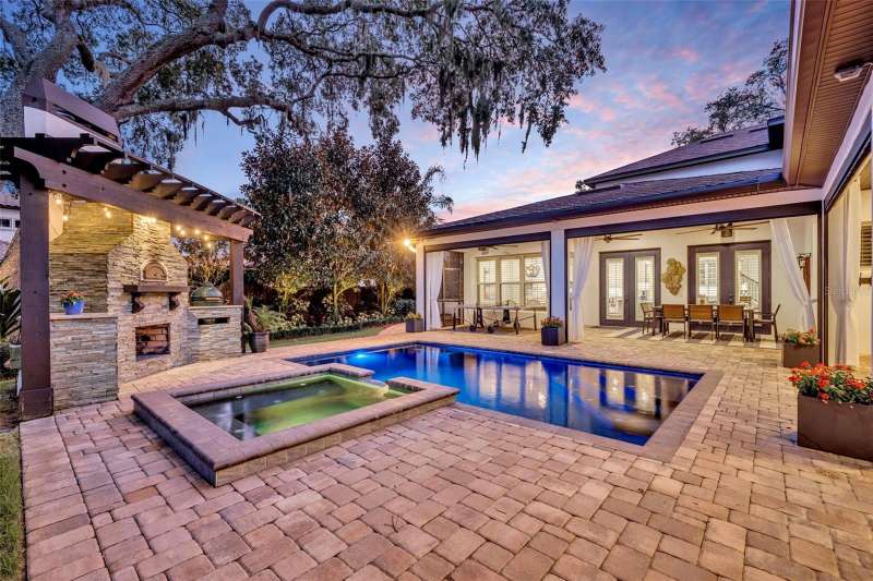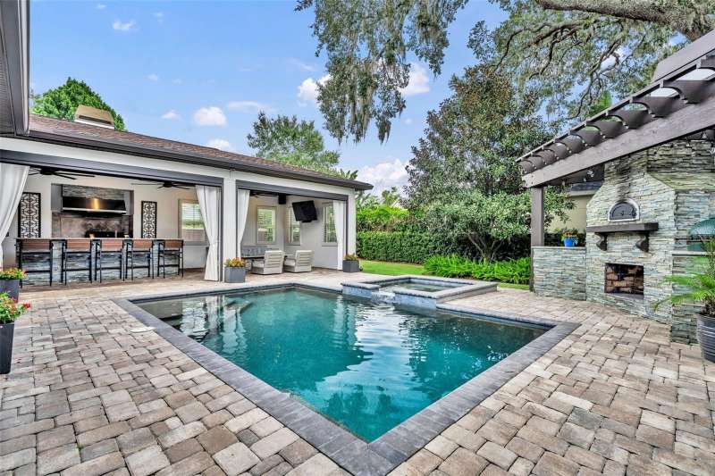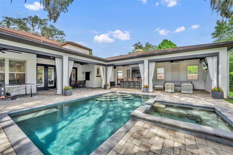 This stunning LunDev-built pool home has been meticulously maintained and thoughtfully updated, blending timeless craftsmanship with modern style. The ideal floorplan features a first-floor primary suite, a private office, and an open kitchen and family room that flow effortlessly to the home’s exceptional outdoor living space. Outside, the spacious backyard is a private retreat complete with an oversized covered patio, gas firepit, and a fully equipped summer kitchen with a pizza oven, all surrounding a sparkling pool and heated spa. In 2022, the kitchen received a major renovation, showcasing a new island, updated countertops and backsplash, fresh fixtures and cabinet hardware, and elegant lighting that elevate the space. The primary bath renovation mirrors the same level of quality, with new custom vanities topped with quartz countertops, all-new tile, a glass-enclosed shower, a relaxing soaking tub, and classic lighting and mirrors. Additional improvements include a new roof (2021), newer hardwood floors throughout the 2nd floor, updated brick paver driveway, newer pool equipment, and fresh interior and exterior paint, each reflecting consistent care and attention to detail. Designed for both everyday comfort and effortless entertaining, this home is truly move-in ready and radiates pride of ownership inside and out.