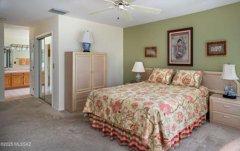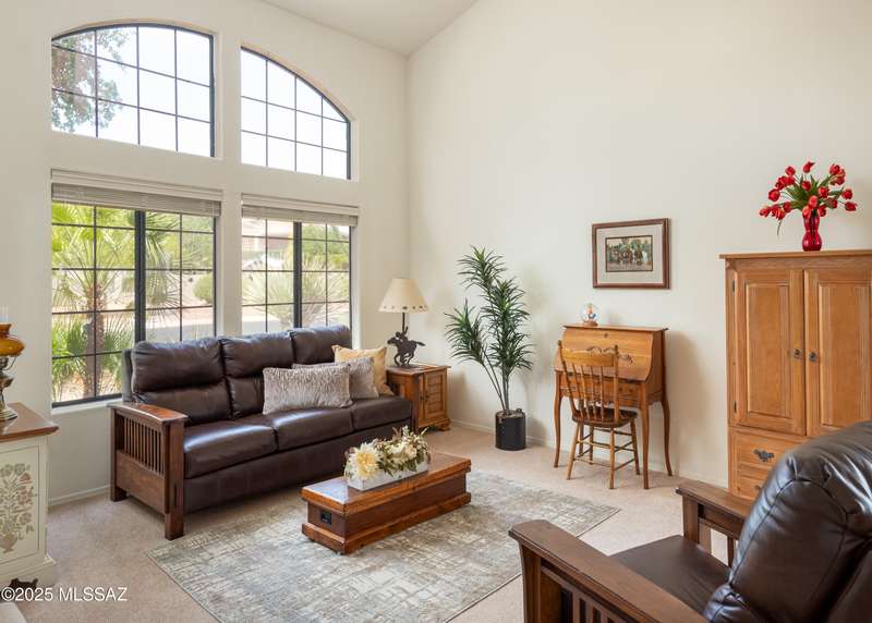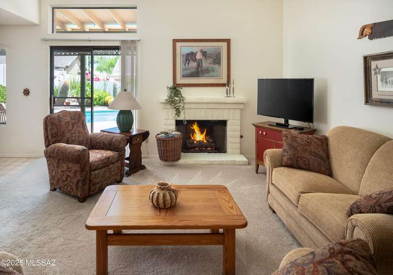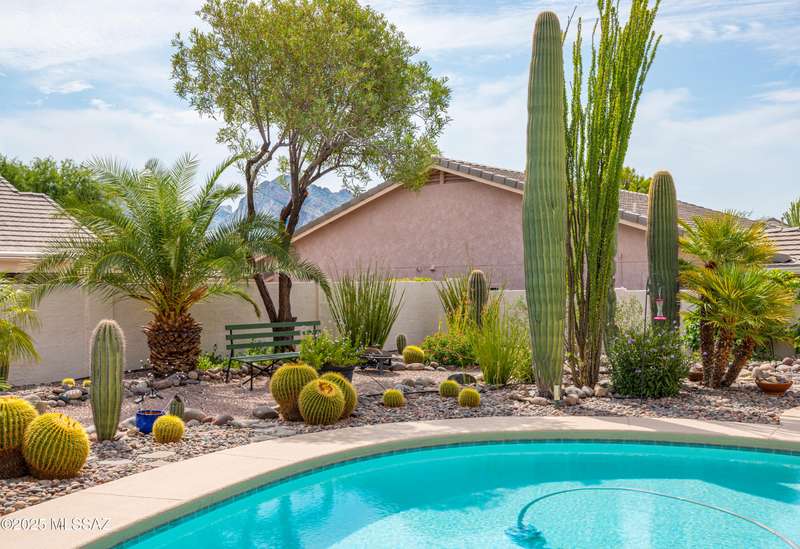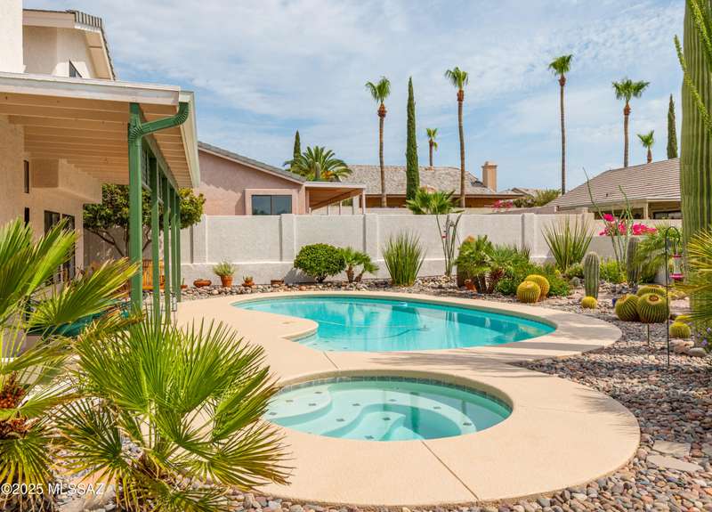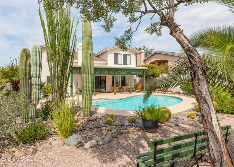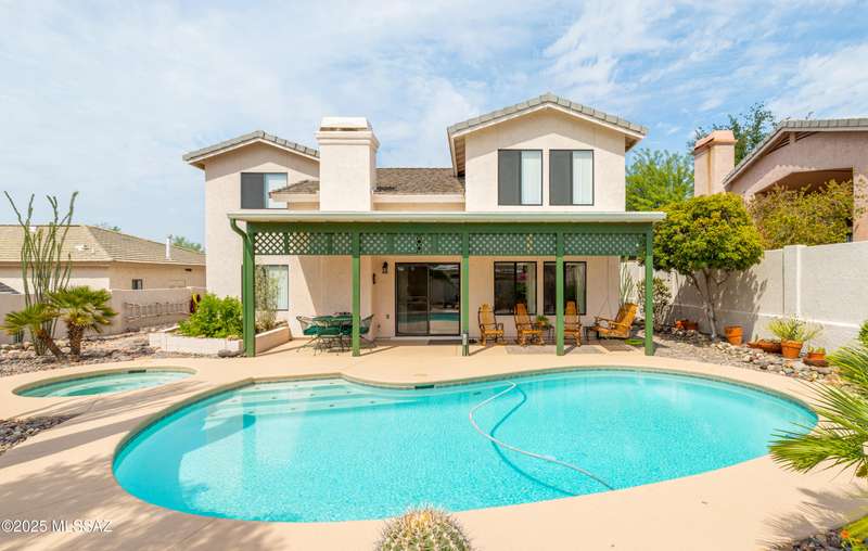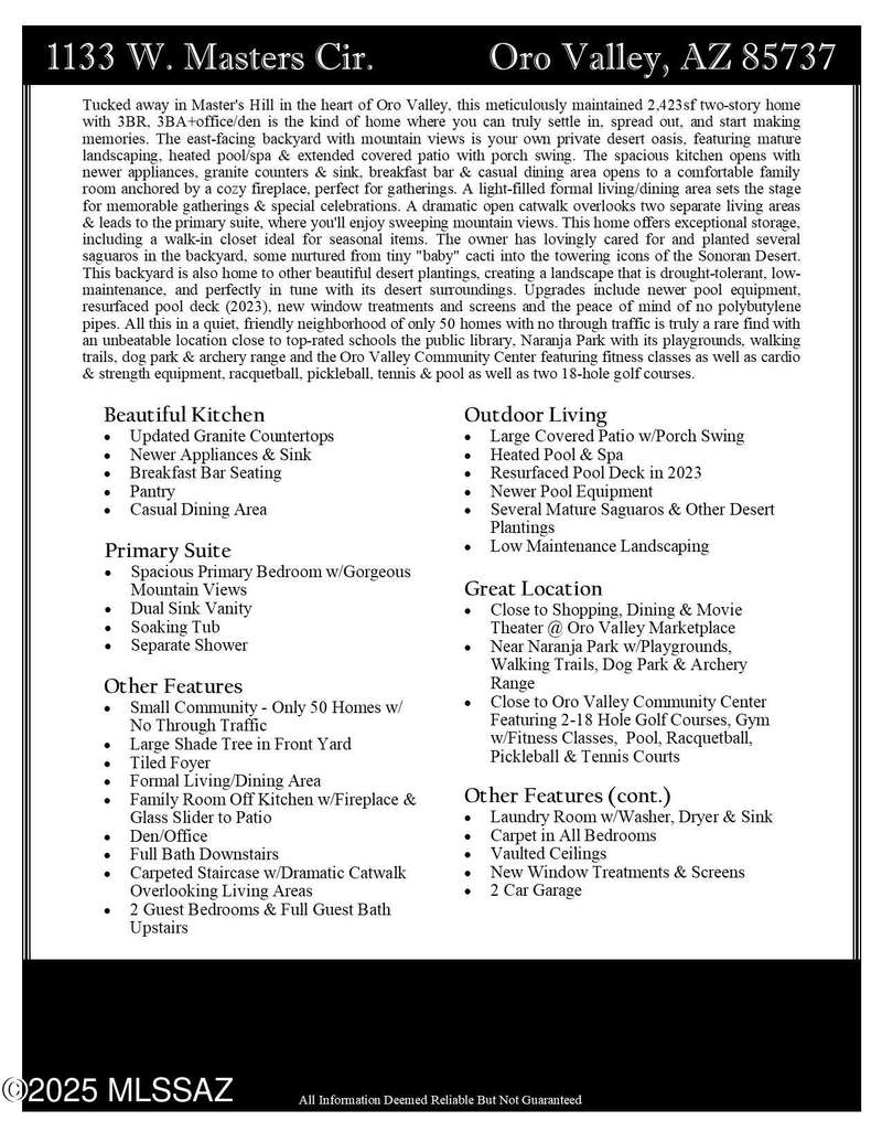 Tucked away in Master's Hill in the heart of Oro Valley, this meticulously maintained 2,423sf two-story home w/3BRs/3BAs+office/den is the kind of home where you can truly settle in, spread out, and start making memories. The east-facing backyard w/mountain views is your own private desert oasis, featuring mature landscaping, heated pool/spa & extended covered patio with porch swing. The spacious kitchen opens with newer appliances, granite counters & sink, breakfast bar & casual dining area opens to a comfortable family room anchored by a cozy fireplace, perfect for gatherings. A light-filled formal living/dining area sets the stage for memorable gatherings & special celebrations. A dramatic open catwalk overlooks two separate living areas & leads to the primary suite,