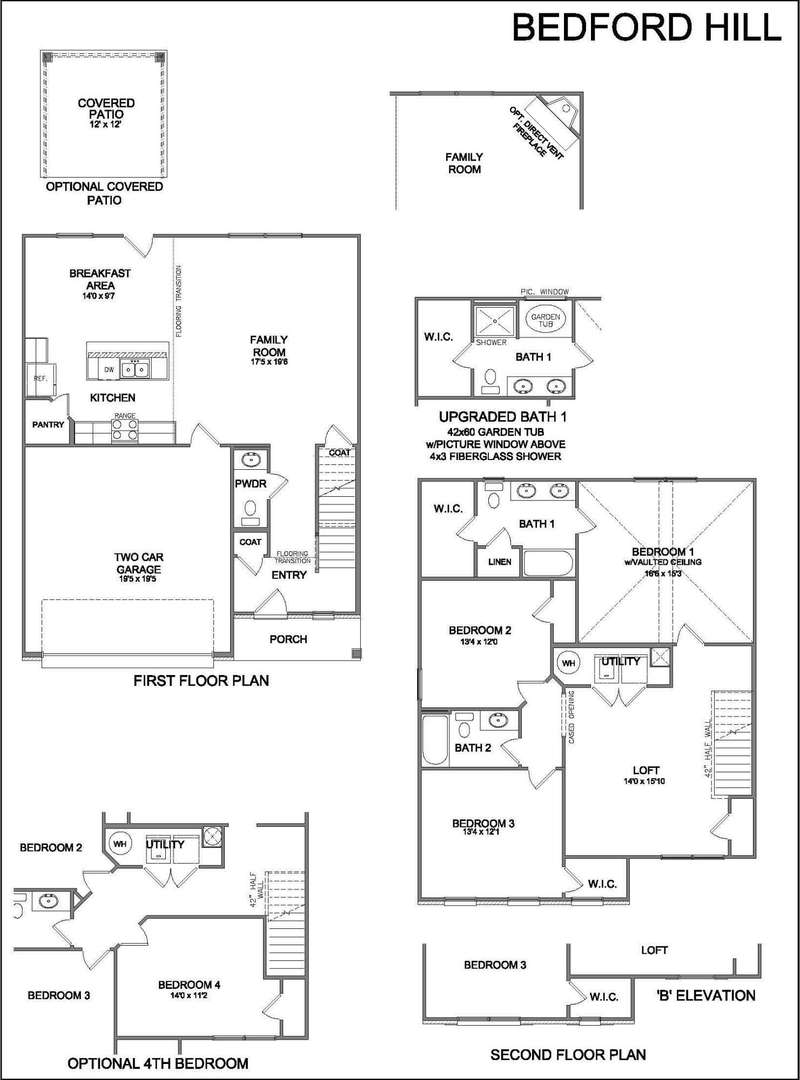 The Bedford Hill, part of the Trend Collection by Ball Homes, is two story plan with a very open first floor layout. The island kitchen offers both a breakfast area and countertop dining, and a large pantry. The kitchen opens to the family room at the rear of the home. Upstairs are the primary bedroom suite, two bedrooms and a hall bath, plus a spacious loft that can also be configured as a fourth bedroom option. The primary bedroom suite includes a bedroom with vaulted ceiling, large closet, and spacious bath with tub/shower, and linen storage. An upgrade primary bath offers a garden tub, separate shower, and picture window.
