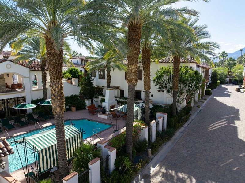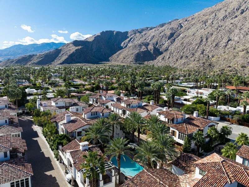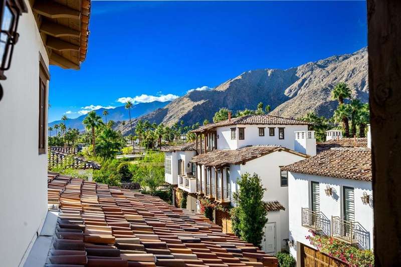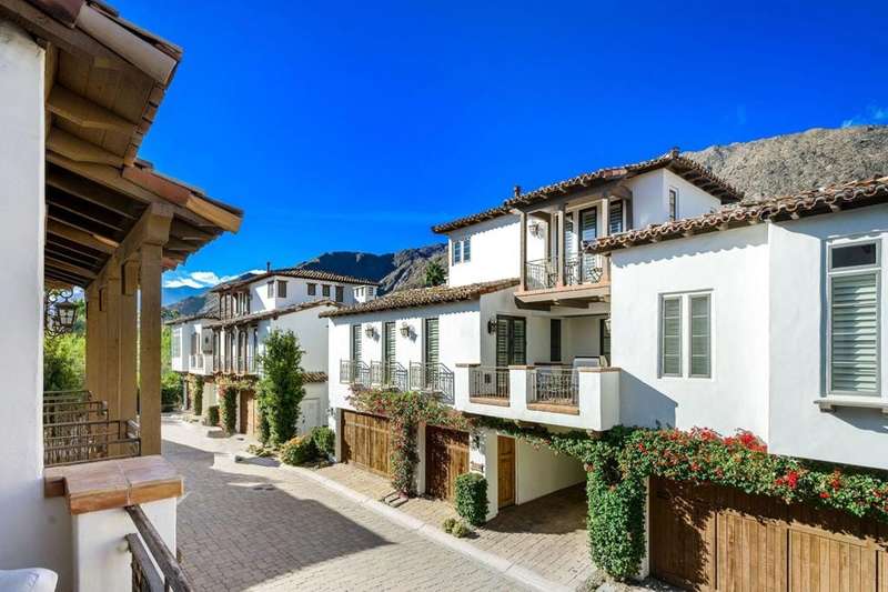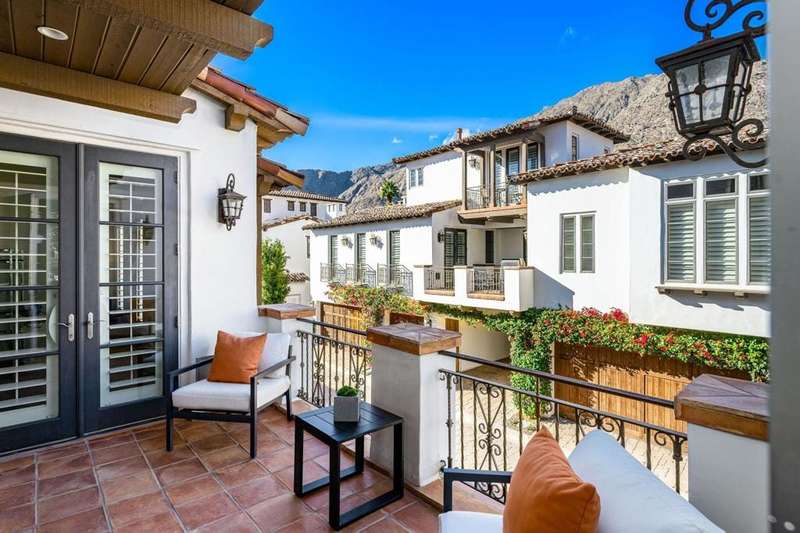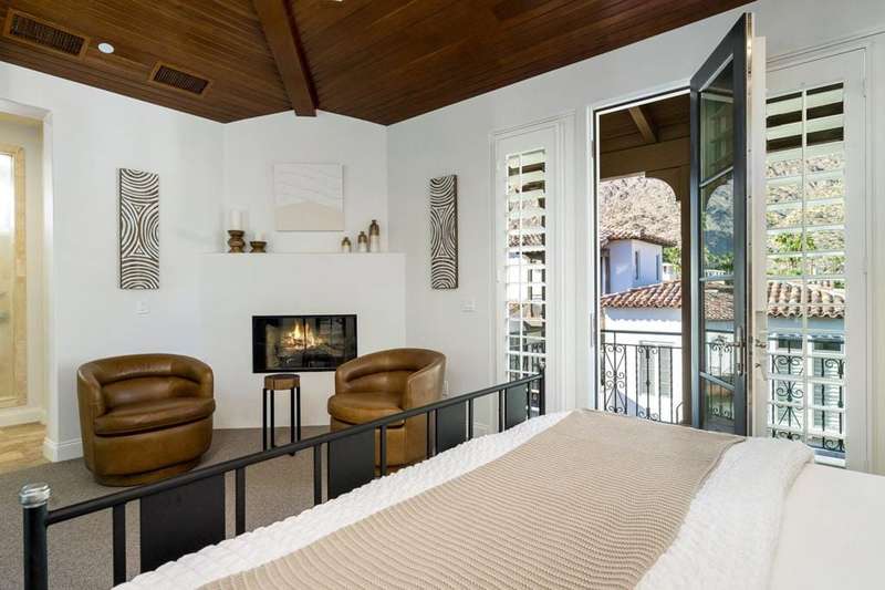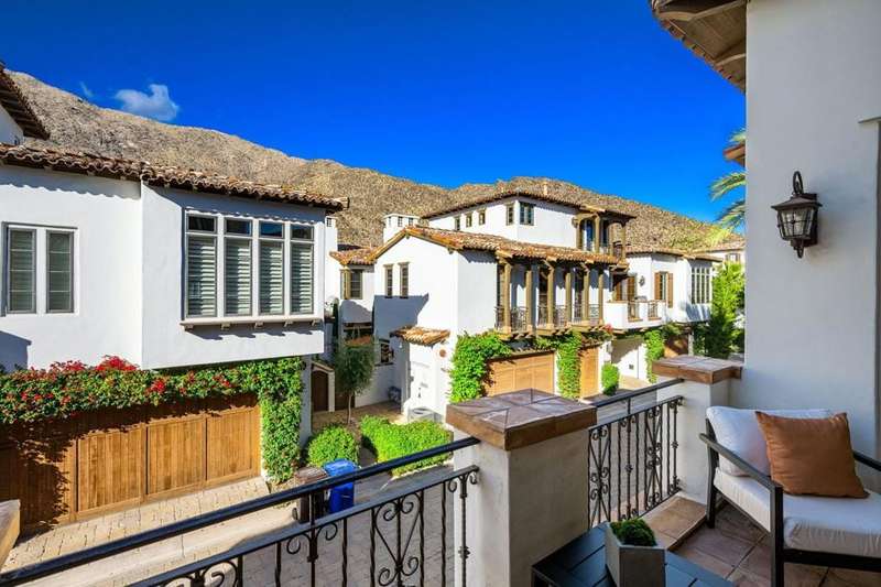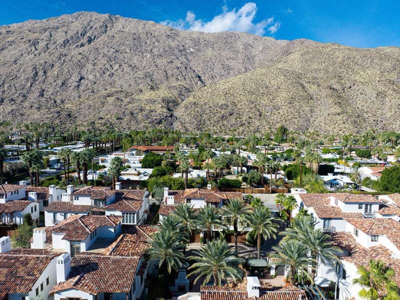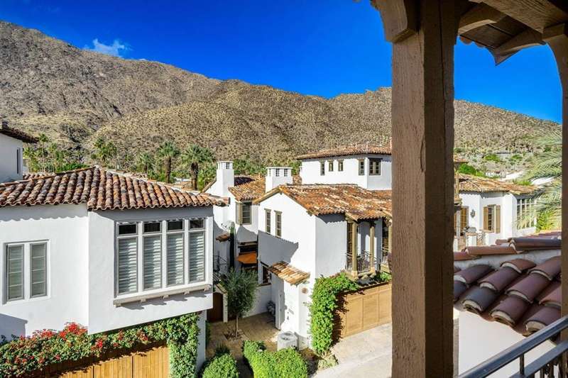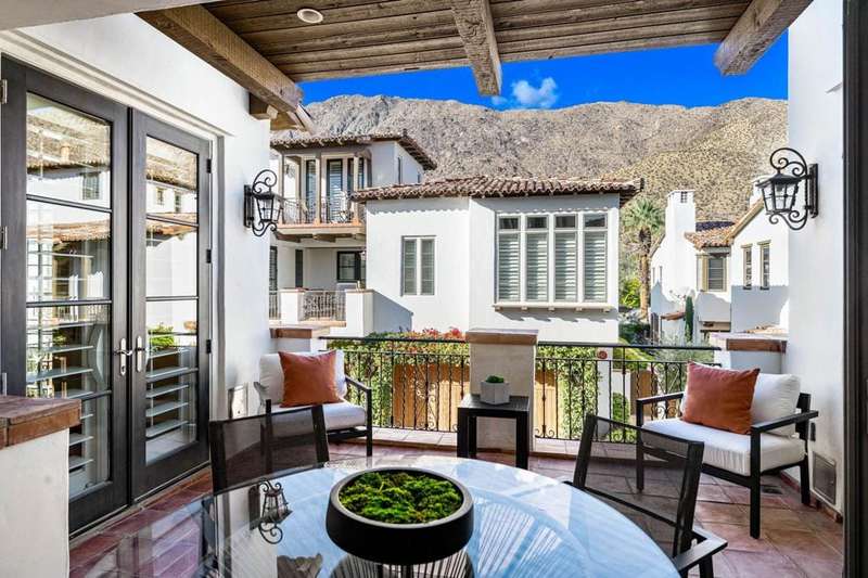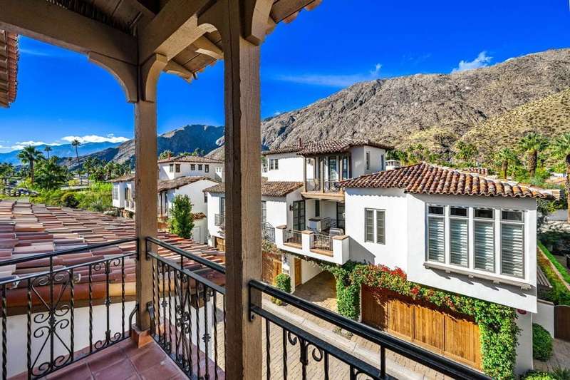 Experience the epitome of Palm Springs luxury living in this magnificent home nestled within the St. Baristo community in the exclusive Historic Tennis Club neighborhood. This Carriage House model boasts 2 primary bedroom suites, a versatile den area, and a chef's kitchen that will delight culinary enthusiasts. The kitchen has been thoughtfully upgraded with top-of-the-line Sub-Zero appliances, a Wolf Professional range, double convection ovens, a convenient pot-filler above the range, and an expansive island. Experience beautifully rich wood plank flooring, beamed wood-vaulted ceilings, and an abundance of natural light entering through 3 sets of French doors leading to a spacious covered balcony with breathtaking mountain views. One primary bedroom with an ensuite bathroom has a versatile sitting space that could easily transform into an office or gym.The main primary bedroom offers a tranquil retreat with a stone fireplace and a convenient office nook. A private balcony with incredible views, beamed wood ceilings and a spacious bathroom enhance the sense of luxury. Additional features include custom shutters throughout and thoughtfully designed custom closets. The property has a one-car garage and carport for your convenience. St. Baristo's gated community provides resort-style amenities that include a pool, spa and an elevated outdoor leisure space to unwind and entertain. Enjoy the convenience of being only 2 blocks away from downtown Palm Springs.