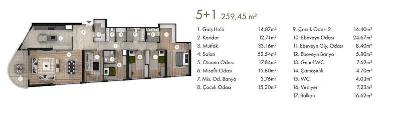 The apartments for sale in Ankara have three, four, or five bedrooms, offering different options to meet various needs. They provide a comfortable and modern lifestyle in a prestigious area. Each apartment has spacious and bright rooms with a ceiling height of 3.15 meters. The apartments include a large living room, a separate kitchen, a modern bathroom, a laundry room, a stylish dressing room, an en-suite bathroom, and a spacious balcony. Designed for comfort, the apartments have smart home systems, high-quality built-in kitchen appliances, a dishwasher, and LED ceiling lighting. They also have a practical wardrobe, underfloor heating with heat meters, a satellite TV system, high-insulation windows, and a private storage area.