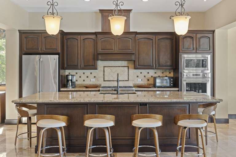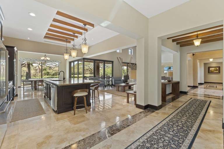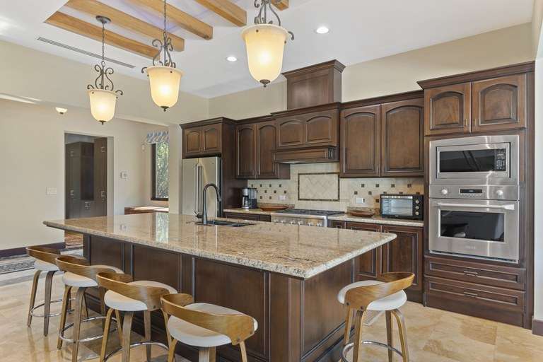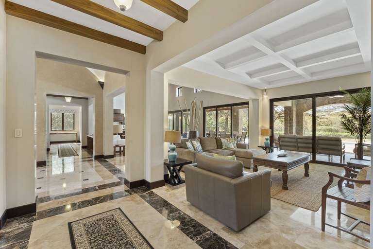 Almost all the homesites are already built, and as expected in such a location, the homes are mansions. Within, private luxury Home #7 is an amazing and exclusive 5-bedroom home. All the five bedrooms have in-suite bathrooms. The home features two master bedrooms, one on the ground floor and the other one right above it. All the rooms are huge and elegantly crafted with super-high ceilings, some of them vaulted, others with amazing solid wood elegantly crafted. Only the best materials were used to complete this high-end home. Floors are travertine seamlessly polished, special anti-slip flooring was installed in the wide staircase that leads to three of the five bedrooms located above. All the windows and glass doors are double-panned, assuring a pleasant temperature inside, even with the air conditioning turned off and energy efficiency.