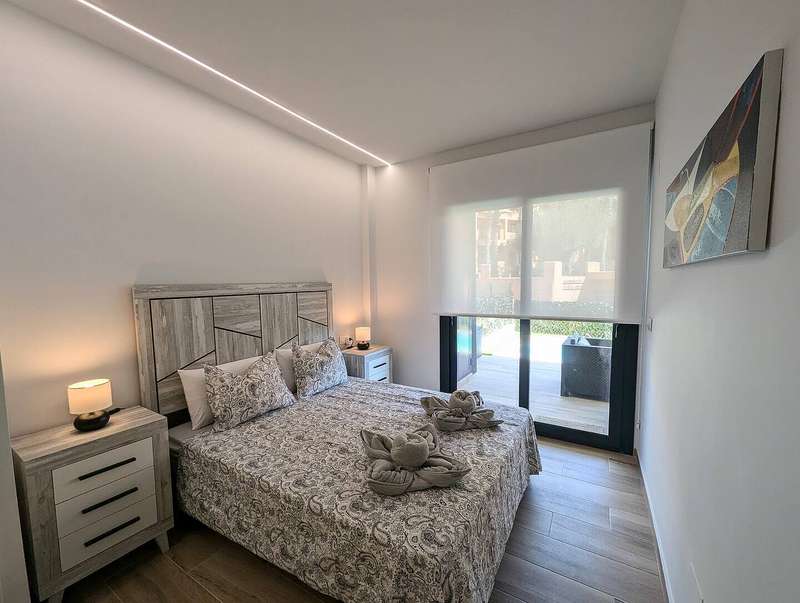 The apartment features two spacious bedrooms, including a master with en-suite bathroom, and a second modern bathroom with a walk-in shower. The open-plan kitchen is fully equipped and flows into a bright living and dining area. Comfort is ensured with central air conditioning, while entertainment is provided by a smart TV. Outdoors, a private garden with a swimming pool and shower creates the perfect space for relaxation.