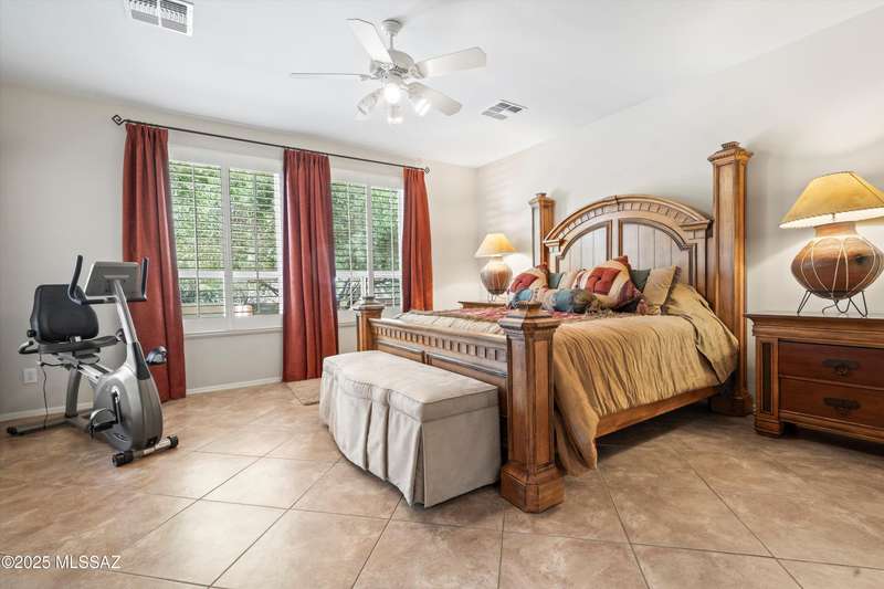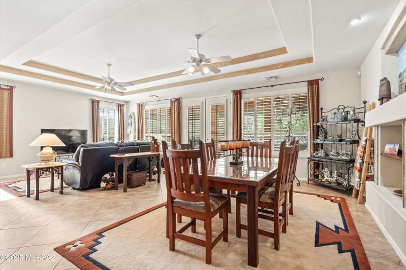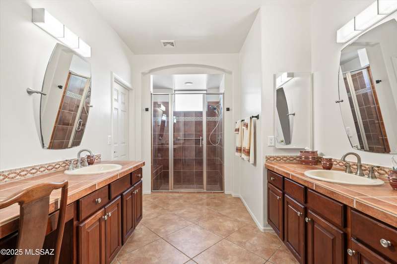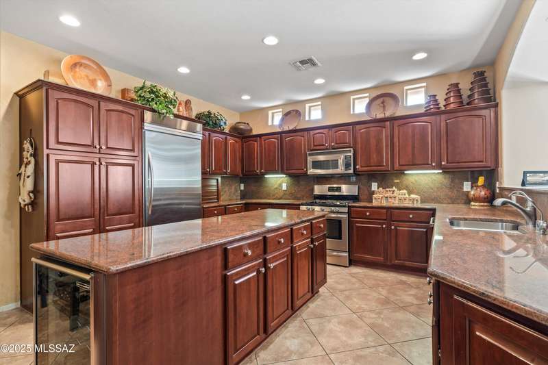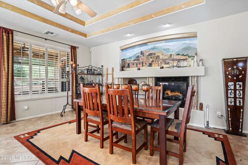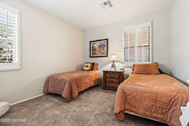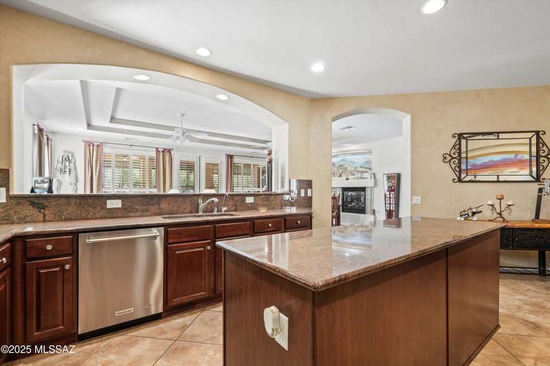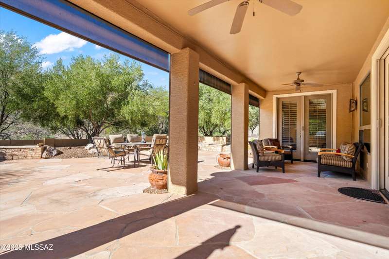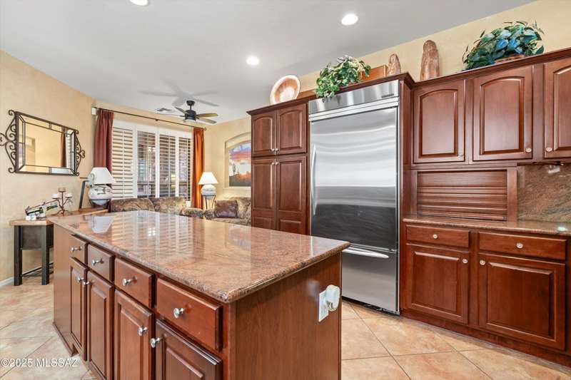 A private courtyard welcomes you to this sought-after Cimarron model, styled with southwest accents. The home includes three bedrooms--one being a secluded guest Casita--three bathrooms, and a beautifully designed den equipped with built-ins and a wall bed. An expansive great room opens to inviting outdoor living and entertaining areas. The island kitchen features elegant dark wood cabinetry, providing ample storage and workspace. The spacious primary suite boasts an en-suite bathroom with double vanities, a large tiled shower, and a roomy walk-in closet. This exceptional residence includes a main house guest bedroom and bathroom, a two-car garage, and an additional third-car garage with storage space. The extended flagstone patio featuring a kiva fireplace offers privacy and