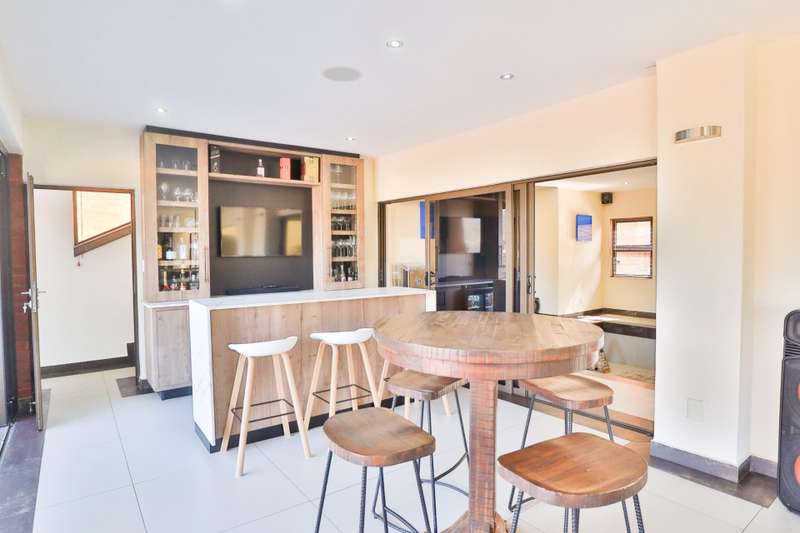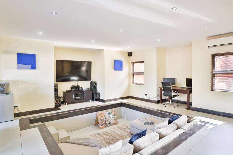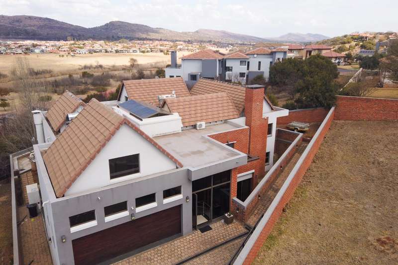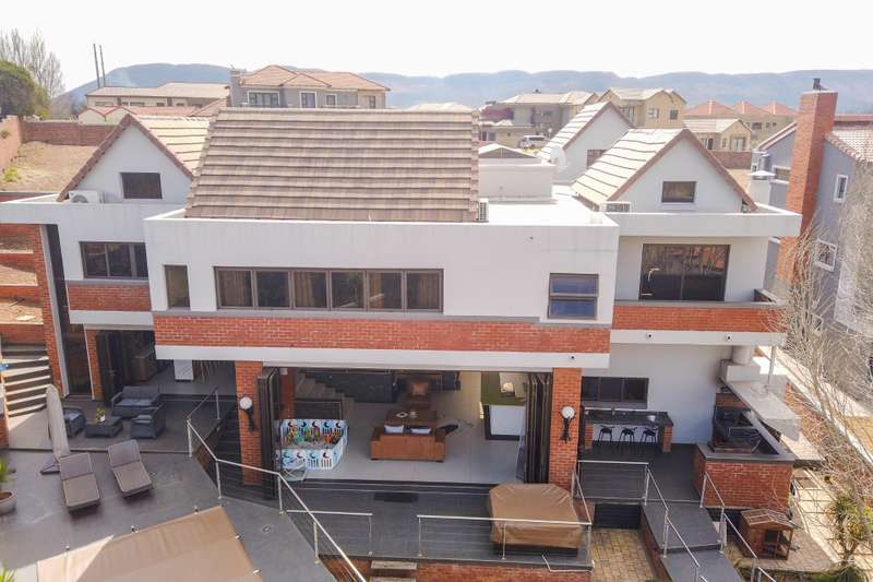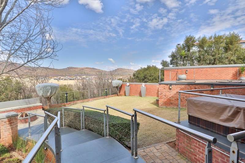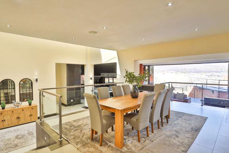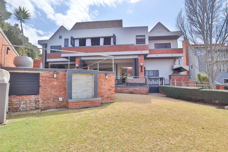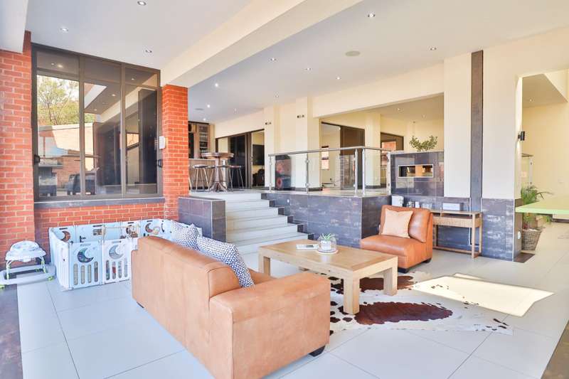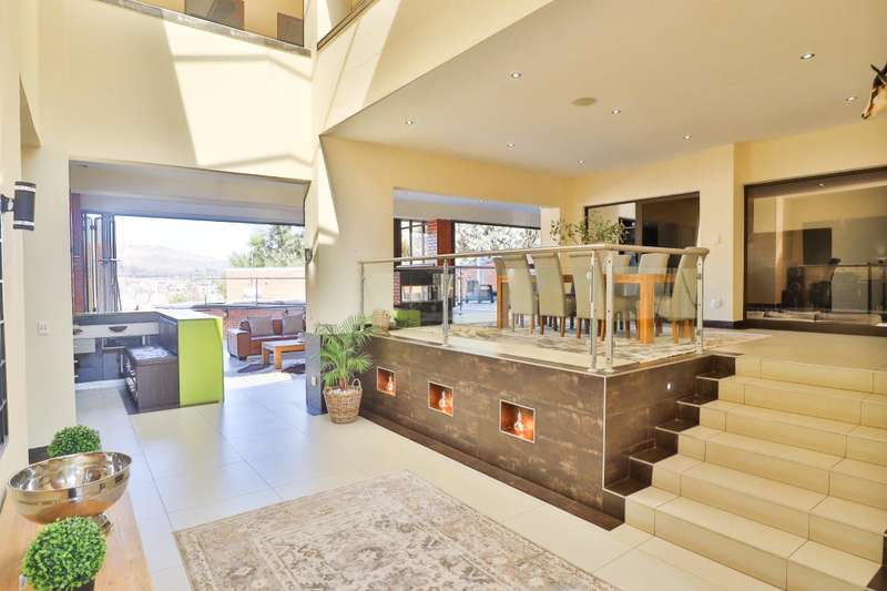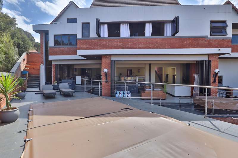 Amplified Luxury Living in Secure Estate Discover an elegant masterpiece nestled within the tranquility of a secluded cul-de-sac, offering a mesmerizing panoramic view of the lush greenbelt where wildlife roam freely. This residence is a symphony of designer aesthetics, greeting you with a grand staircase upon entry, leading to an open lounge area graced by an indoor koi-dam, exuding an air of modern luxury. Embracing contemporary architectural excellence, this home boasts five en-suite bedrooms, a cinema room, a study, and an expansive entertainment zone that effortlessly extends to a covered patio, complete with a braai, swimming pool, and jacuzzi. The kitchen harmoniously flows into the living and dining areas, while a recently renovated bar adds to this awesome setting. A guest bedroom with an en-suite bathroom resides on the lower level, while upstairs, four en-suite bedrooms await, including a master suite with glass stacking windows, a spacious walk-in closet, and a contemporary private en-suite bathroom. The living experience is elevated by glass stacking doors on the lower level, inviting panoramic views from the large deck. The well-appointed kitchen boasts a seamless layout, complemented by modern amenities, a separate laundry, and a pantry. Ascending to the upper level, an expansive braai/entertainment room awaits, further enhancing your hosting capabilities. Among the myriad enhancements are two large automated garages, staff accommodation, fitted blinds, automated generator, underground water storage tanks, solar geysers, air conditioning, an automated irrigation system, fiber and data points, a boma area, a centralized vacuum system, and an integrated sound system throughout the house. With every conceivable luxury, this residence is tailor-made for lavish entertaining and awesome family living. Seize the opportunity to own this extraordinary home, ready to become the canvas for cherished memories.