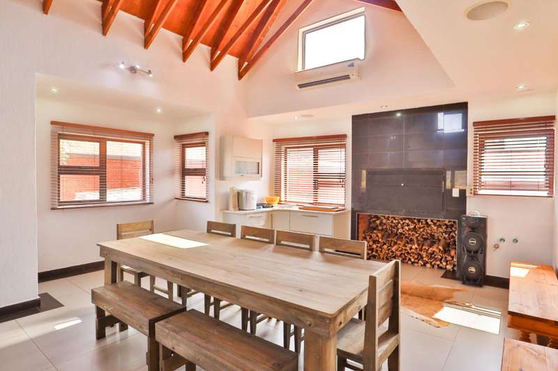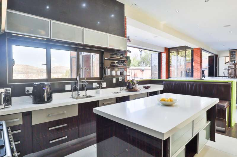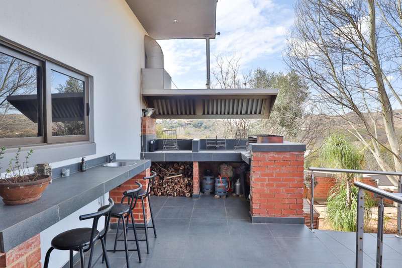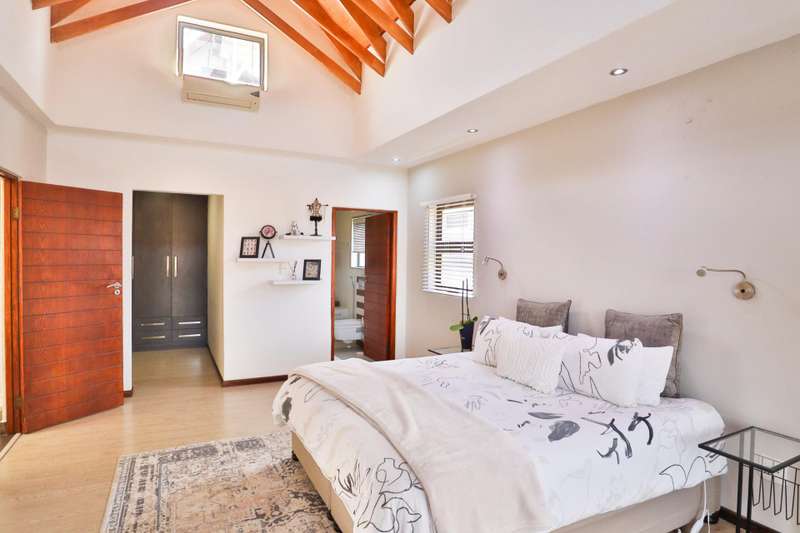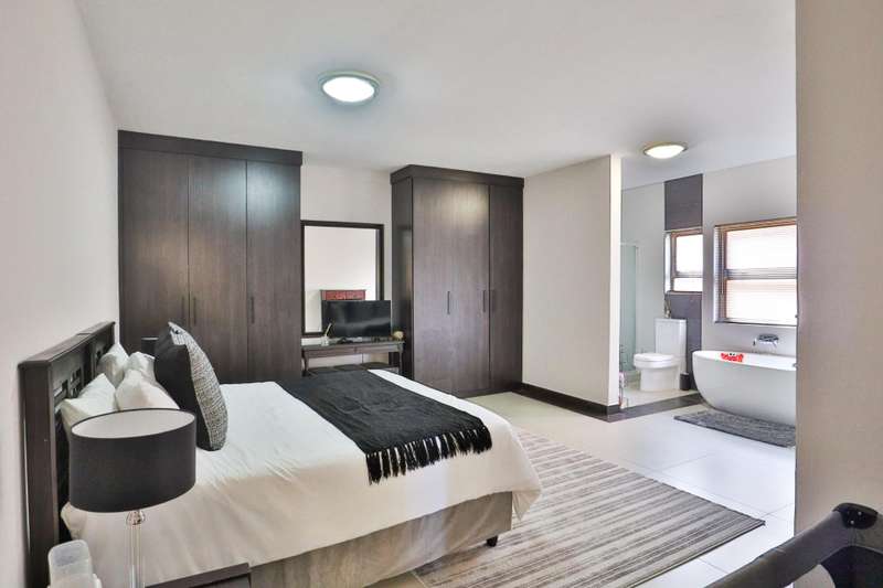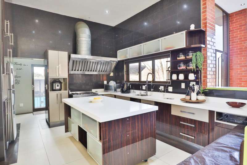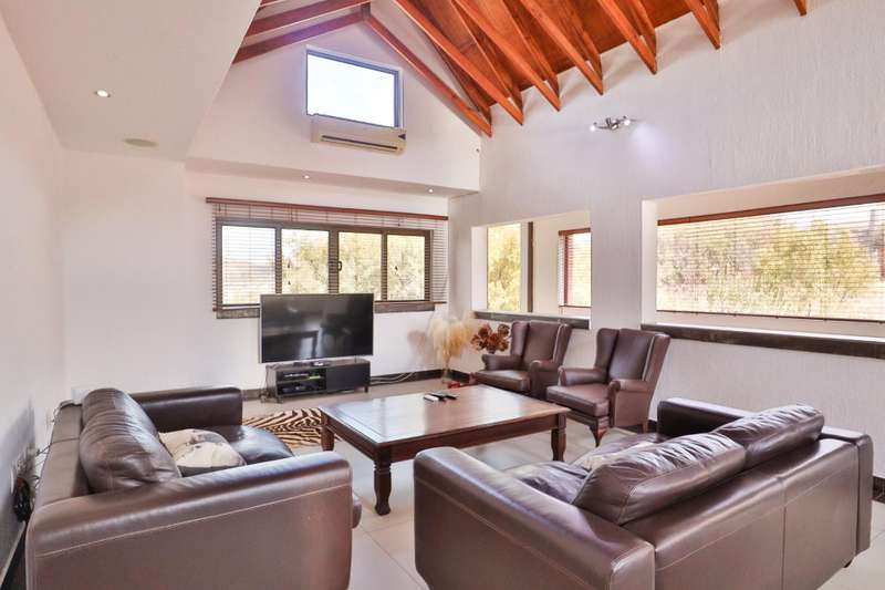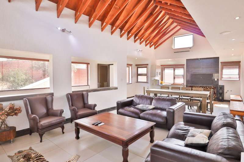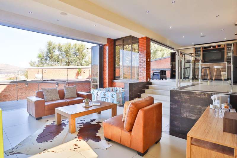 Amplified Luxury Living in Secure Estate Discover an elegant masterpiece nestled within the tranquility of a secluded cul-de-sac, offering a mesmerizing panoramic view of the lush greenbelt where wildlife roam freely. This residence is a symphony of designer aesthetics, greeting you with a grand staircase upon entry, leading to an open lounge area graced by an indoor koi-dam, exuding an air of modern luxury. Embracing contemporary architectural excellence, this home boasts five en-suite bedrooms, a cinema room, a study, and an expansive entertainment zone that effortlessly extends to a covered patio, complete with a braai, swimming pool, and jacuzzi. The kitchen harmoniously flows into the living and dining areas, while a recently renovated bar adds to this awesome setting. A guest bedroom with an en-suite bathroom resides on the lower level, while upstairs, four en-suite bedrooms await, including a master suite with glass stacking windows, a spacious walk-in closet, and a contemporary private en-suite bathroom. The living experience is elevated by glass stacking doors on the lower level, inviting panoramic views from the large deck. The well-appointed kitchen boasts a seamless layout, complemented by modern amenities, a separate laundry, and a pantry. Ascending to the upper level, an expansive braai/entertainment room awaits, further enhancing your hosting capabilities. Among the myriad enhancements are two large automated garages, staff accommodation, fitted blinds, automated generator, underground water storage tanks, solar geysers, air conditioning, an automated irrigation system, fiber and data points, a boma area, a centralized vacuum system, and an integrated sound system throughout the house. With every conceivable luxury, this residence is tailor-made for lavish entertaining and awesome family living. Seize the opportunity to own this extraordinary home, ready to become the canvas for cherished memories.
