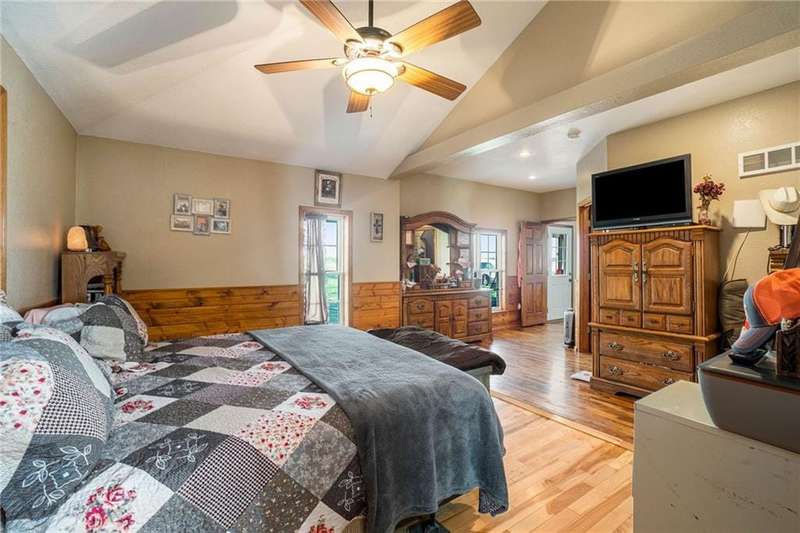 This property is full of opportunity with 160 acres of versatile land ready for farming, recreation, or simply enjoying peaceful country living.Welcome to your dream country escape with 160 acres of beautiful farmland featuring a peaceful pond, a spacious shop, and a custom wooden home with a metal roof full of rustic charm. Inside you will find an open concept layout with vaulted ceilings, a custom wood ceiling design, and large windows that fill the space with natural light. The living area centers around an old-fashioned fireplace that adds warmth and character. The kitchen includes stainless steel appliances, a large bar area, and charming wooden countertops that are perfect for everyday use or gathering with friends. The foyer offers a convenient space for guests to drop their things along with a nearby bathroom and laundry area. The master bedroom features plenty of windows, two entry doors, and a large walk-in closet. Upstairs there is a private bedroom with its own walk-in closet. The unfinished basement includes a full bathroom and two storage rooms giving you the freedom to create a space that fits your needs whether it becomes a workshop, extra living space, or something entirely your own.