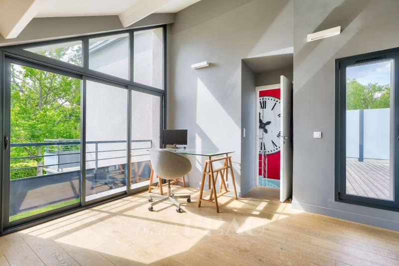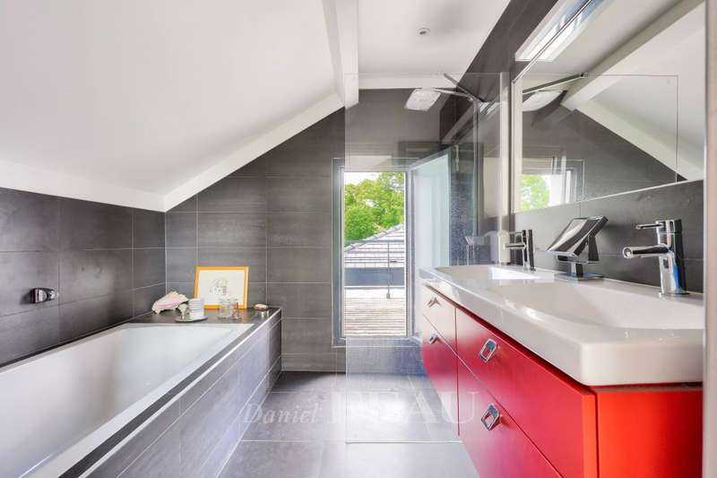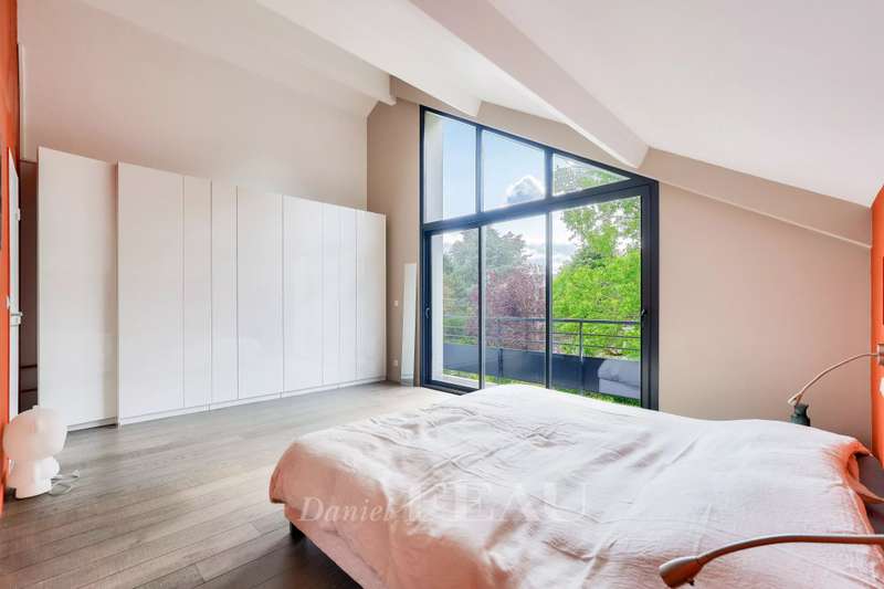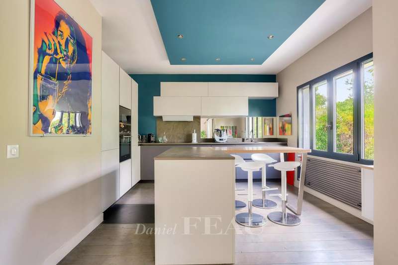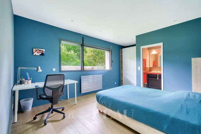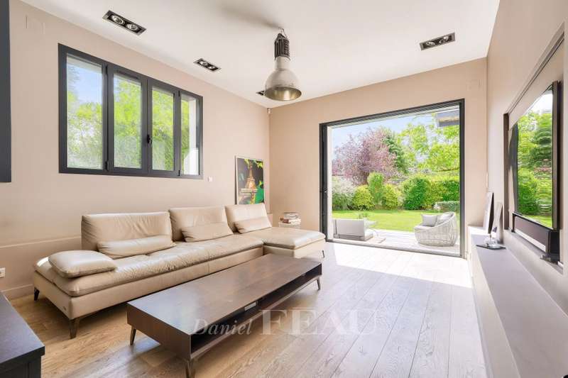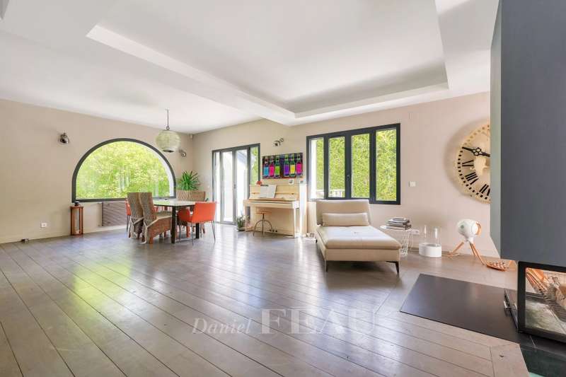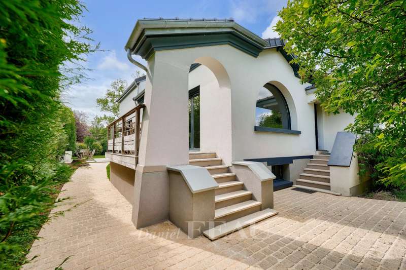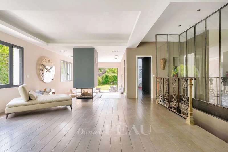 This 1930s property extended in 2015 to offer 285 sqm of floor space and about 250 sqm of living space is set in a level 842 sqm plot. It includes a 70 sqm living/reception room with a fireplace accessing terraces, an equipped kitchen, a study, two bedrooms with shower rooms, and a guest wc. Upstairs are a spacious master suite with a bath/shower room, and a bedroom with a shower room, each opening onto a terrace. On an entresol with a guest bedroom with a shower room, a recreation room, a utility room and a garage. A 7/ minute walk from the station, the shops and the schools.