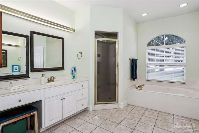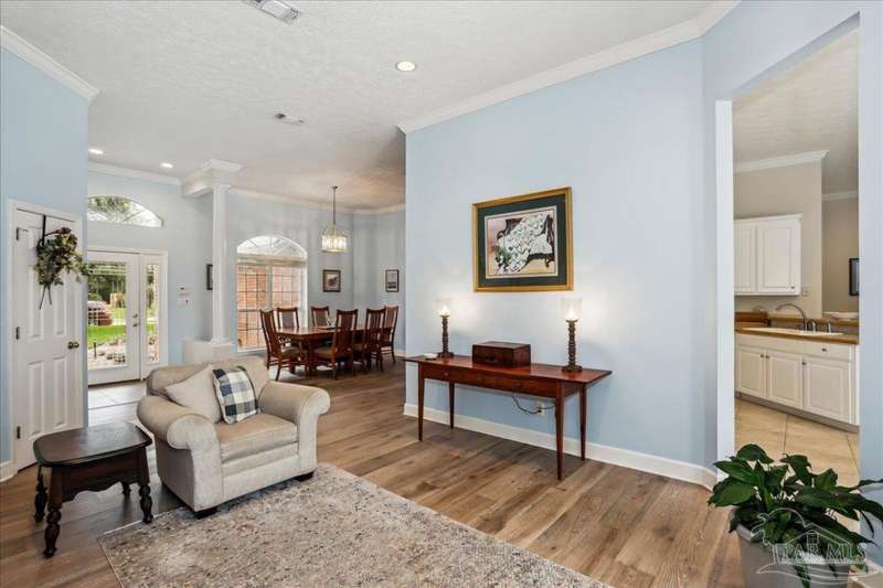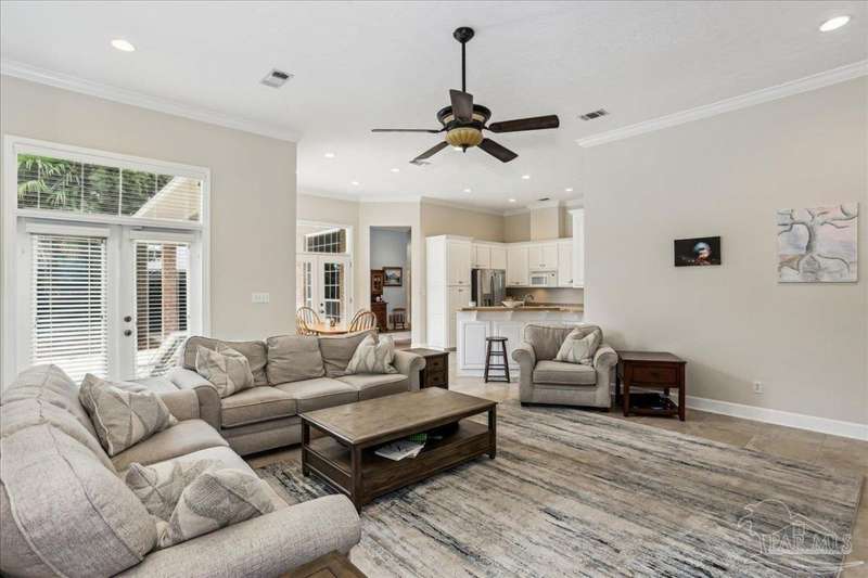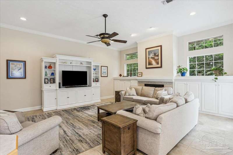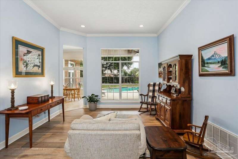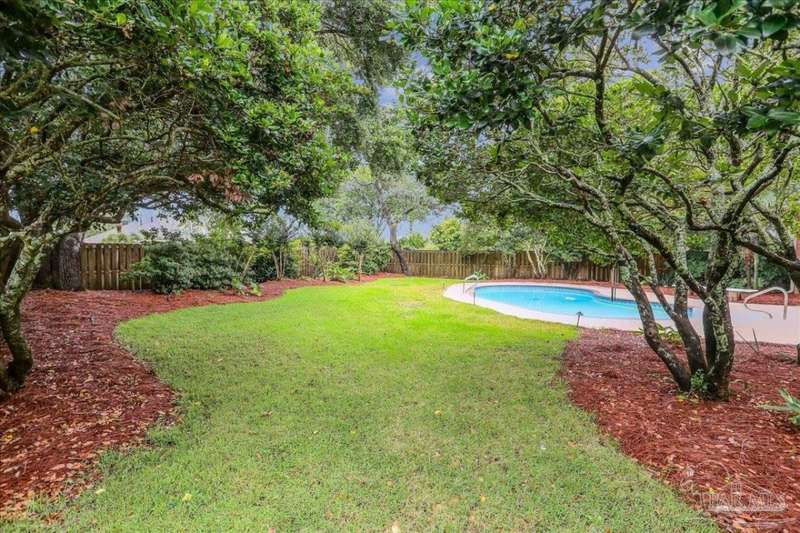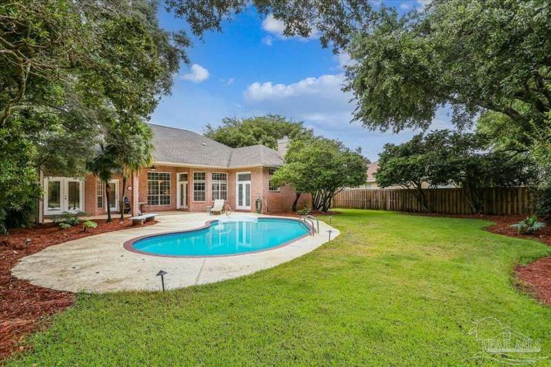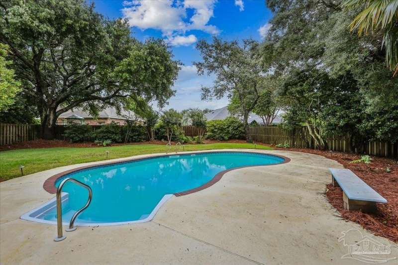 Welcome to this beautifully maintained 4-bedroom, 3-bath home located in the sought-after Grand Pointe community of Gulf Breeze. Designed with both comfort and functionality in mind, this residence features soaring ceilings and abundant natural light throughout. The open-concept living room seamlessly connects to a private patio and sparkling inground pool-also accessible from the luxurious primary suite and a conveniently located third bathroom, perfect for entertaining or relaxing after a swim. The oversized primary suite offers a tranquil retreat with a spacious ensuite bath, double vanities, and generous closet space. Mature landscaping surrounds the property, complemented by a privacy fence for added seclusion and peace of mind. Don't miss this opportunity to own a piece of paradise in one of Gulf Breeze's most desirable neighborhoods!