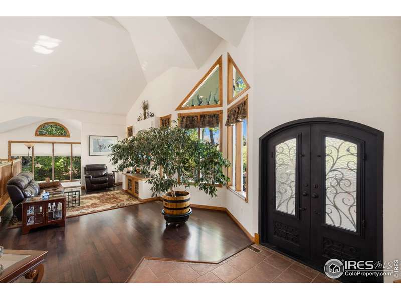 Backs to the 2nd hole at Ptarmigan Golf Course, this beautifully designed custom 2-story home sits on an estate-sized lot just under half an acre, surrounded by mature, lush landscaping. From the inviting covered front porch, step into an open floor plan featuring dramatic vaulted ceilings, gleaming wood floors throughout most of the main level, and stunning views from nearly every room. The chef's kitchen offers quartz countertops, stainless steel appliances, an island, and a cozy nook. The living room features a corner fireplace and flows seamlessly into the sunroom and media room. Upstairs, you'll find a spacious primary suite with an adjoining flex space, along with two guest bedrooms, and full guest bathroom. The finished basement includes a second fireplace, rec room, theater room, wet bar, and a fourth bedroom. Relax on the deck at sunset or unwind in the hot tub on the patio. You'll love calling Ptarmigan home!