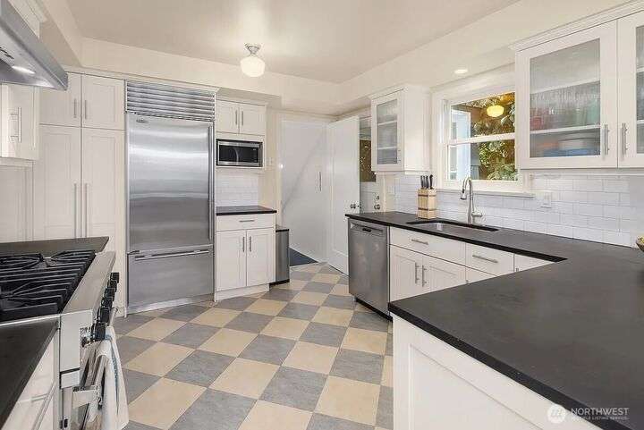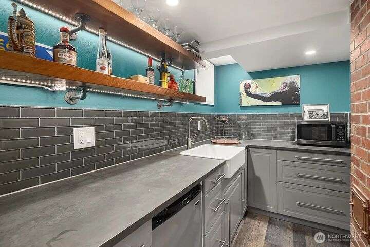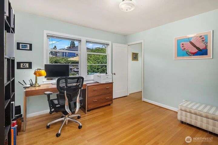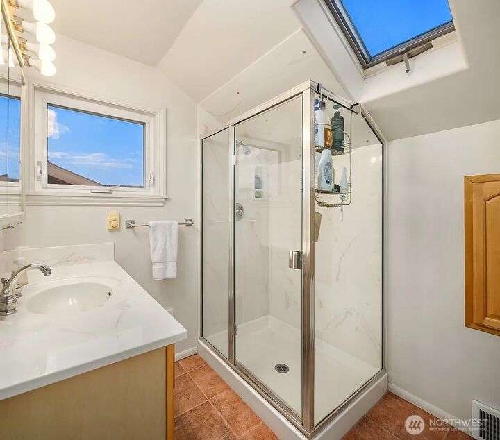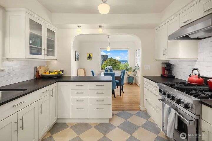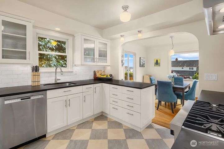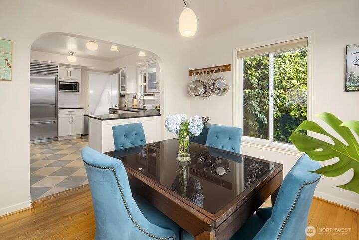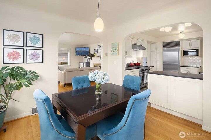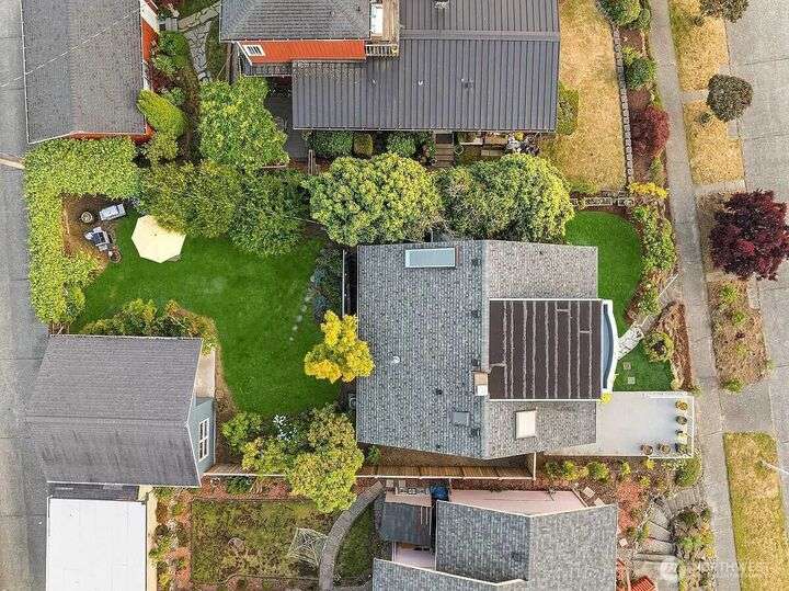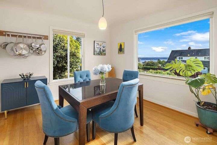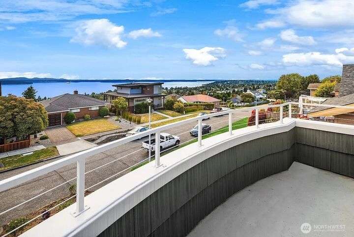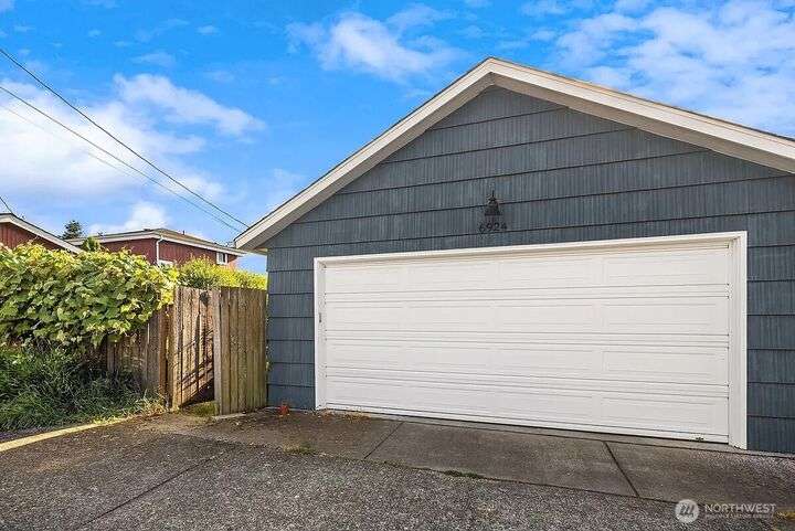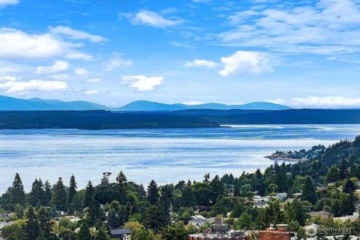 Step into serenity & charm in the heart of Gatewood. This spacious 5bd, 2.5ba home offers over 2,590 sf of living space. Perched high up on a quiet street, this home boasts stunning views of the Sound & Olympic Mountains. Inside, you'll find timeless character blended with modern updates, including hardwood floors, a cozy fireplace, & a light-filled kitchen w/ premium appliances. The upstairs primary suite is a true retreat, complete with a ¾ bath, sweeping views, & dedicated heat pump to keep cool. Renovated basement w/ 2bd's, fam rm, & wet bar. Highlights include updated electric & plumbing, central A/C, 1-car attached garage, 2-car detached w/ alley access, & a fenced backyard oasis perfect for relaxing or entertaining.