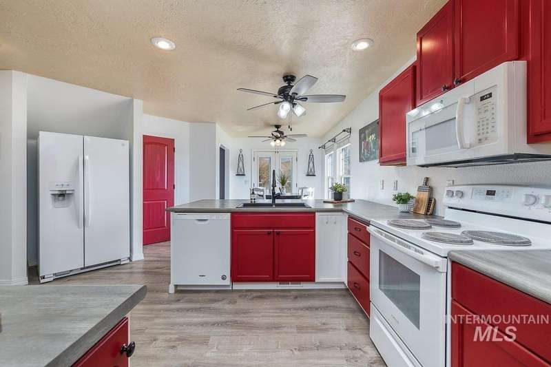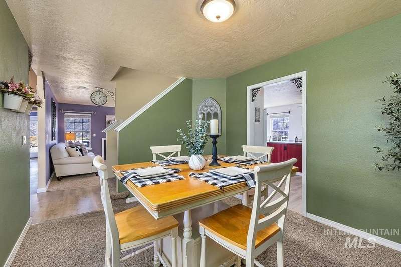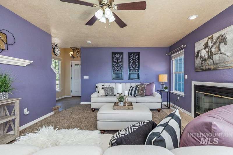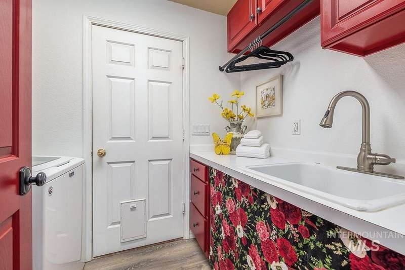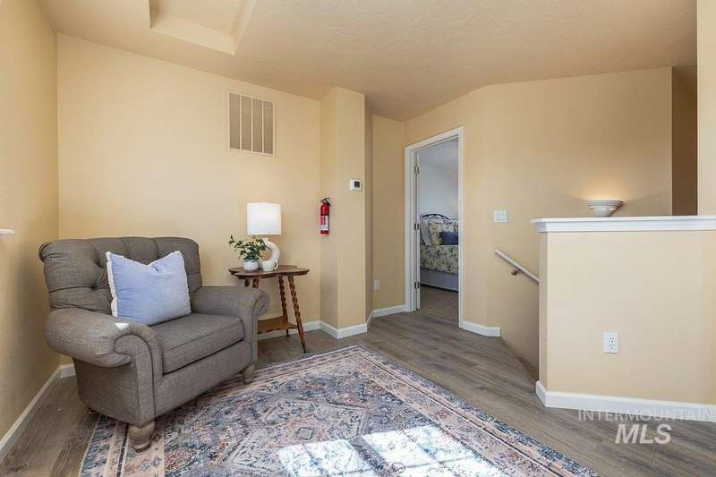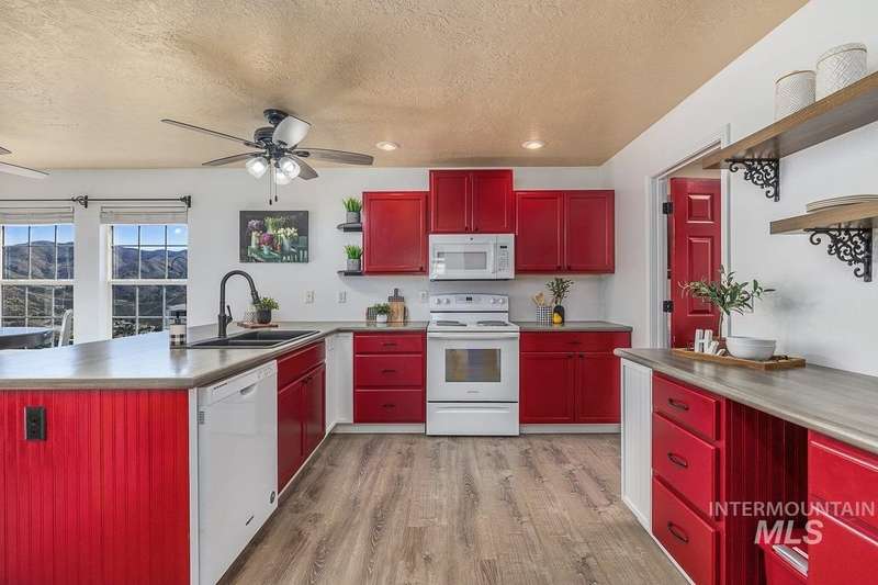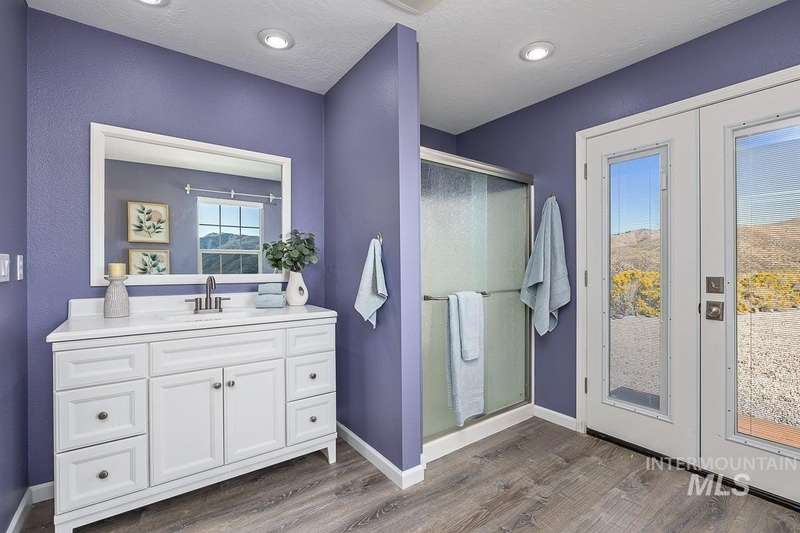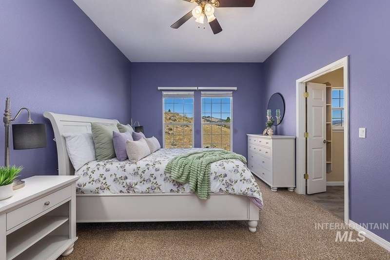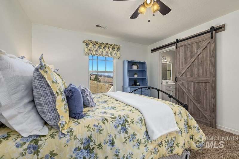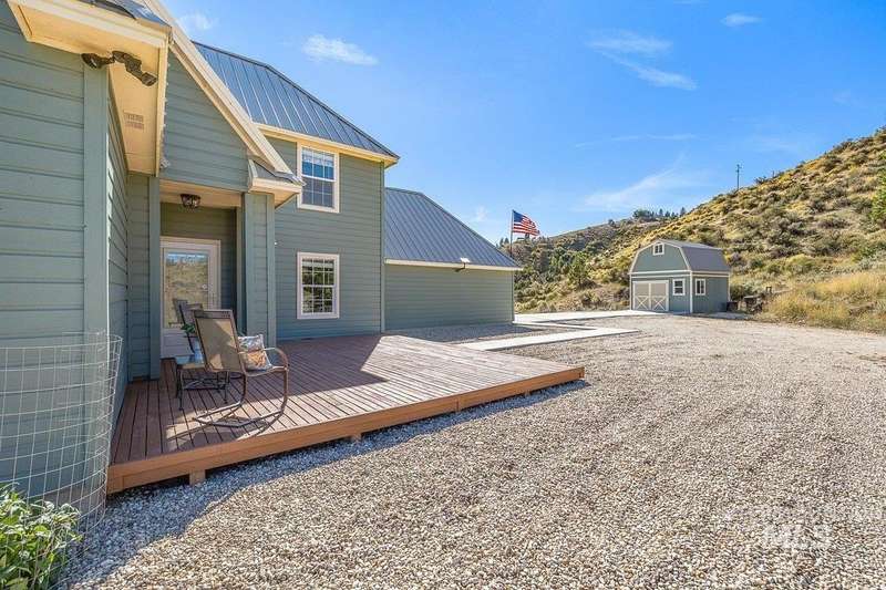 Welcome home to your very own private retreat on 5.42 acres which offers stunning 360° views, peace, and privacy—just 35-40 mins from downtown Boise. Enjoy the spacious living room with a cozy wood-burning fireplace, built-in wood storage, and abundant natural light throughout. The main-level primary suite features tall ceilings, private patio access w/ French doors, large walk-in closet with built-ins, Bluetooth speaker, and a walk-in shower. Each bedroom includes a walk-in closet and ceiling fan, and a Jack & Jill bathroom upstairs blends comfort and functionality. The kitchen offers a butler pantry, storage closet, breakfast bar, all electric utilities and direct patio access w/ French doors to the newly painted deck for easy indoor-outdoor living and entertaining. The upstairs loft adds versatility and extra space. The fully equipped laundry room includes a washer, dryer, sink, hanging rod, and storage for added convenience. This charming home also has a 14x14 shed with loft, fenced garden with a peach tree, metal roof, Blink security system, newer heat pump, added attic insulation, new exterior paint, newer flooring, and an oversized front porch to view the abundant wildlife and mountains!