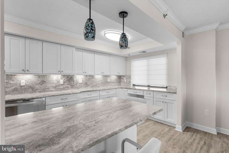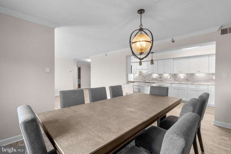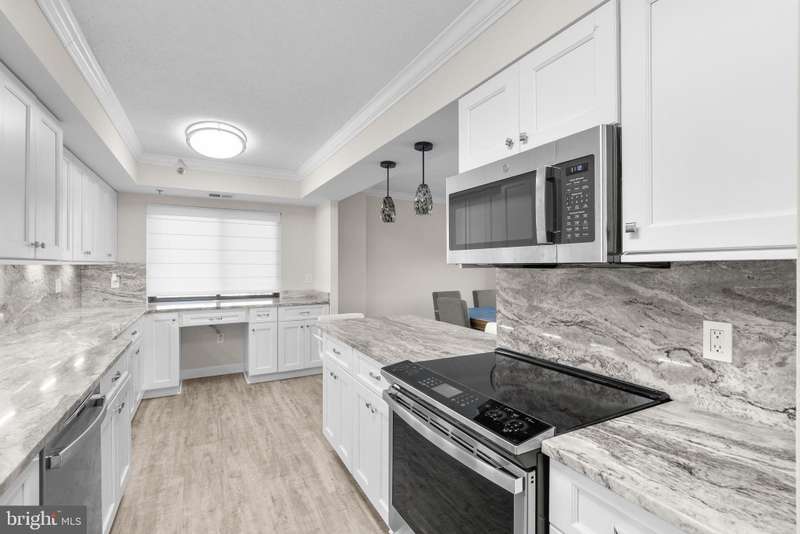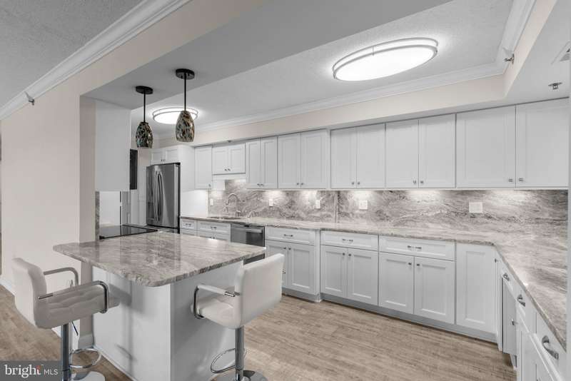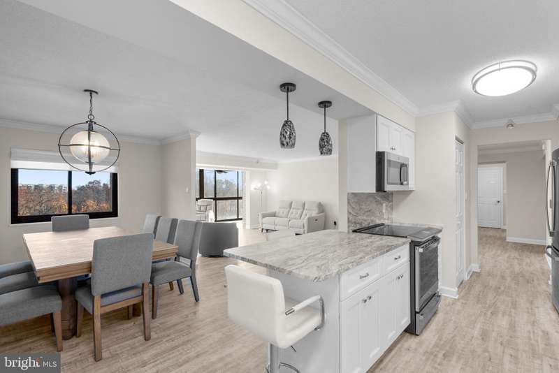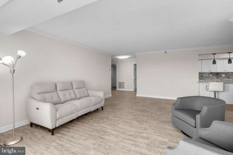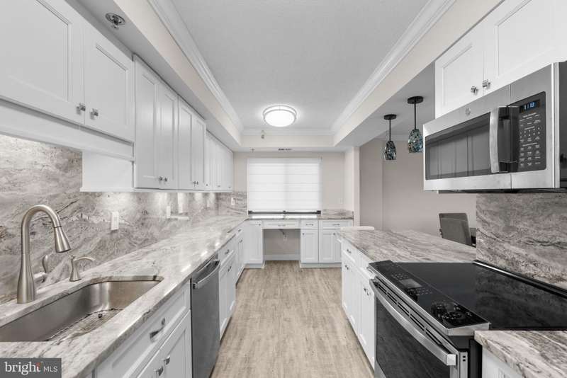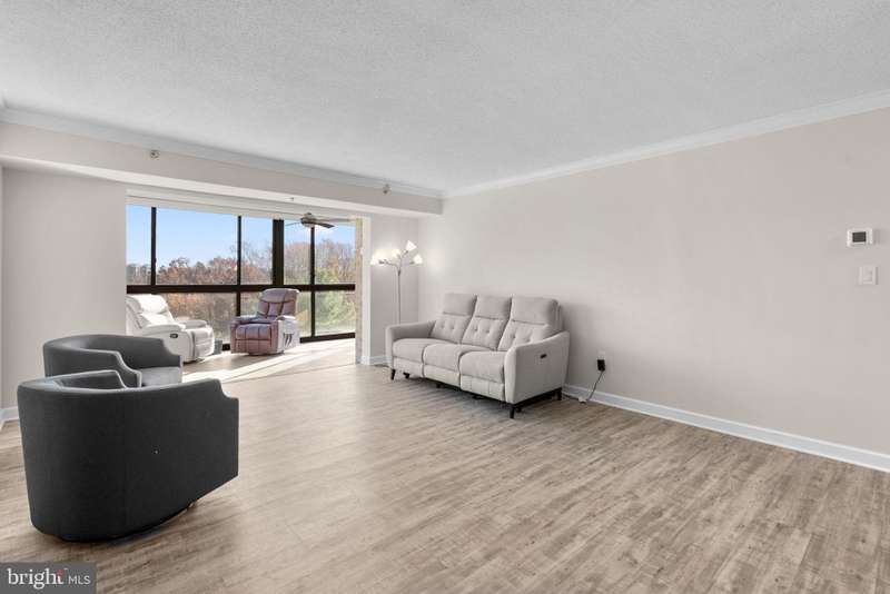 The one you've been waiting for in sought-after Leisure World! This beautifully updated home offers an inviting entrance with a guest closet and luxury vinyl plank flooring that flows seamlessly through the foyer, living room, dining room, kitchen, and baths. An open floor plan enhances the spacious feel and makes everyday living and entertaining effortless. The bright living room features elegant crown molding and opens directly to the sunroom-perfect for enjoying natural light year-round. The adjoining dining room also includes crown molding, updated lighting, and opens to the kitchen for an ideal flow. The updated kitchen is a standout with white shaker cabinetry, granite countertops and backsplash, undermount stainless steel sink, and a breakfast peninsula with pendant lighting. Stainless steel appliances include an electric range, dishwasher, French-door refrigerator with water and ice on the door, and built-in microwave. A pantry closet provides excellent storage. The spacious owner's bedroom offers crown molding, soft carpet, a walk-in closet, and a second closet. The updated owner's bath features a granite-topped vanity and a beautifully remodeled walk-in shower. Two additional bedrooms add wonderful flexibility. The second bedroom includes carpet, crown molding, and a double-door closet. The third bedroom offers crown molding, a large double-door closet, and a sliding glass door leading to the sunroom. A hall full bath includes LVP flooring, tiled shower, and a single vanity with granite. The powder room also features LVP flooring and a granite-topped vanity. A convenient laundry closet includes a full-size stackable washer and dryer. Additional upgrades include a new HVAC system installed in 2022, humidifier, and many smart home features that elevate comfort and efficiency. Beautifully maintained, thoughtfully updated, and located in one of the area's premier 55+ communities-this is the Leisure World home you've been waiting for!