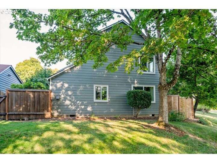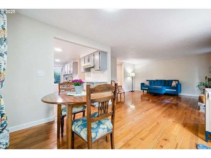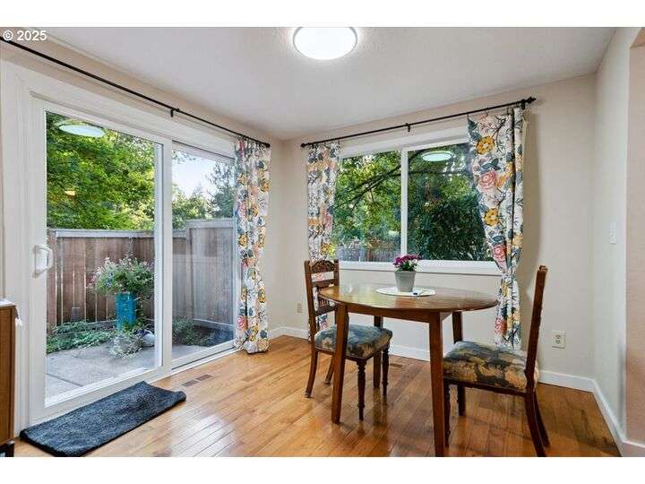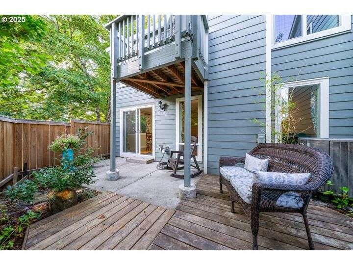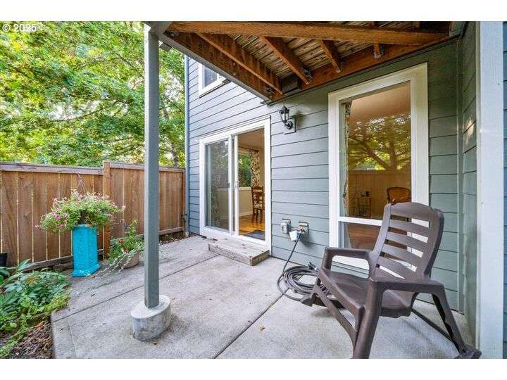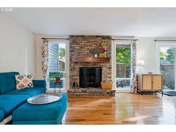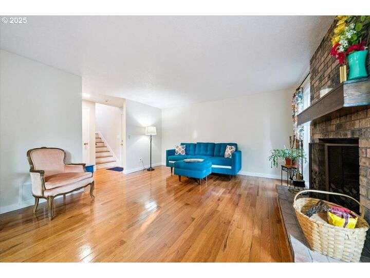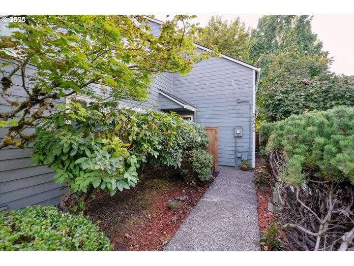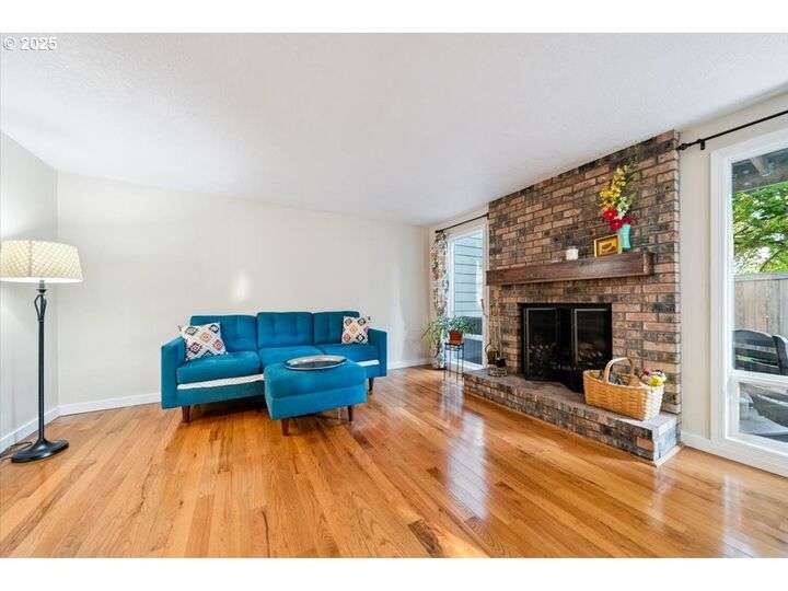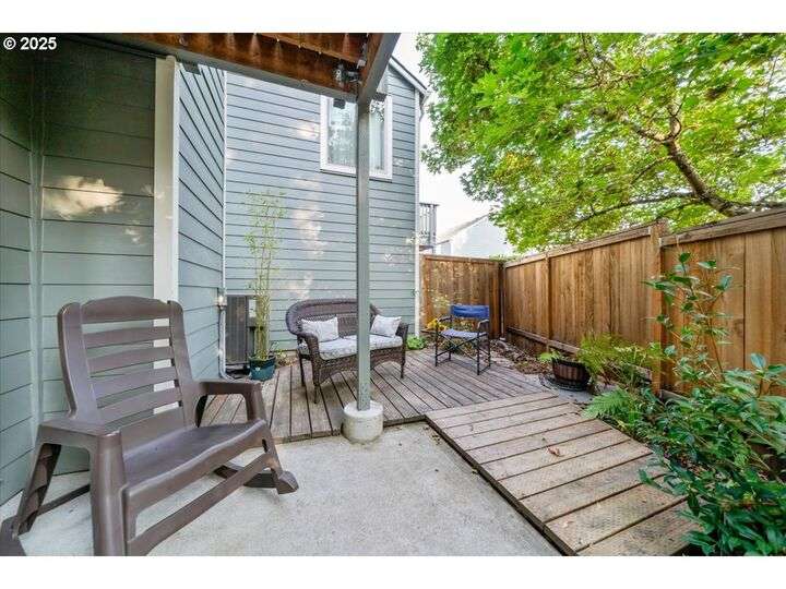 Beautifully maintained 2-bedroom end-unit townhouse with hardwood floors, inviting living room with wood-burning fireplace, and an updated kitchen with quartz counters, subway tile backsplash, painted cabinets, and newer appliances. The main level features a refreshed half bath, while upstairs the vaulted primary bedroom opens to a private deck. A fenced patio/deck offers plenty of outdoor living space. Community upgrades include newer siding, roofs, gutters, and windows. HOA covers exterior maintenance, landscaping, water, sewer, and garbage, plus amenities with pool, basketball court, and walking paths.