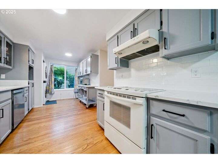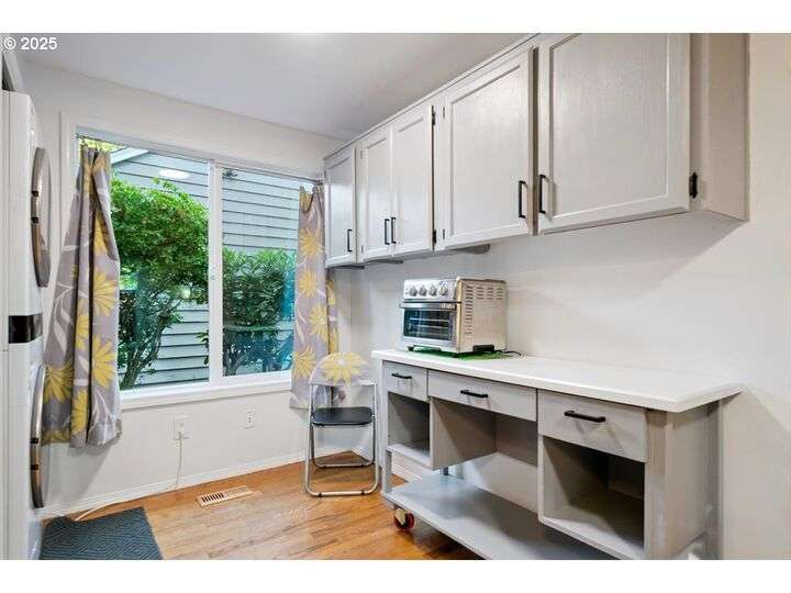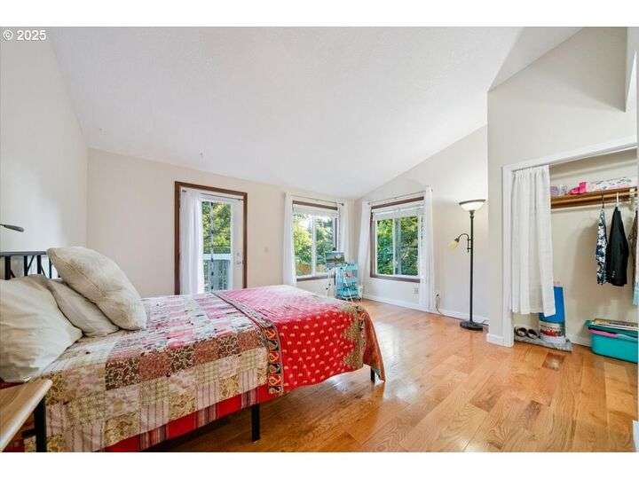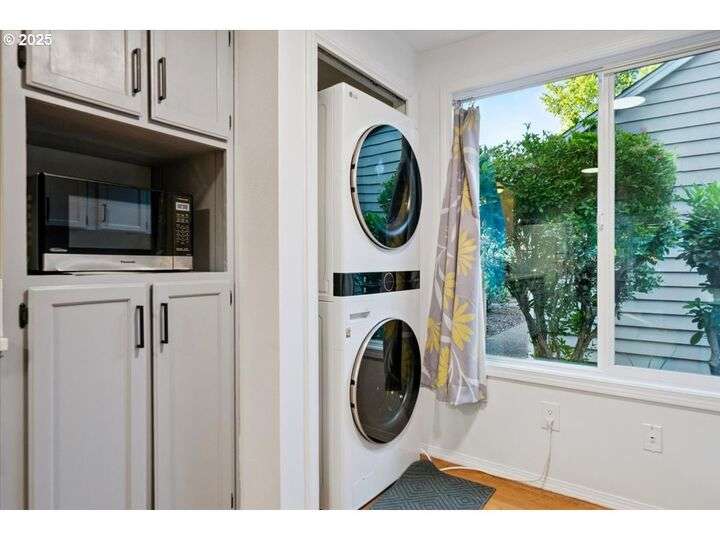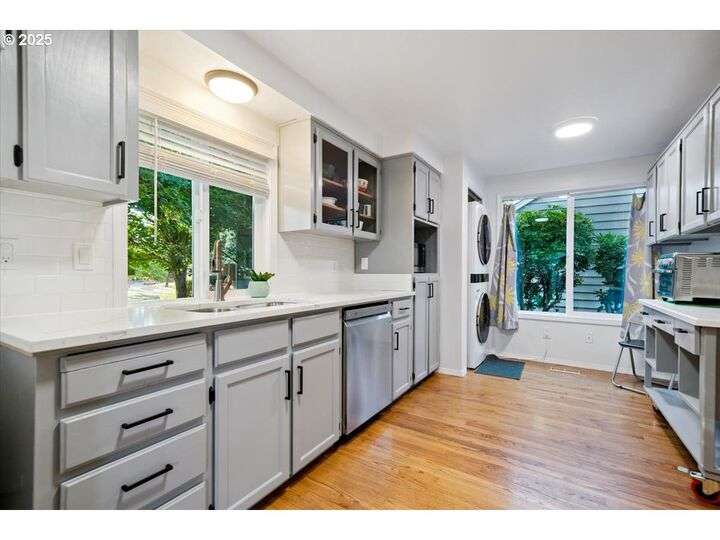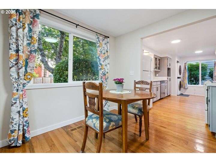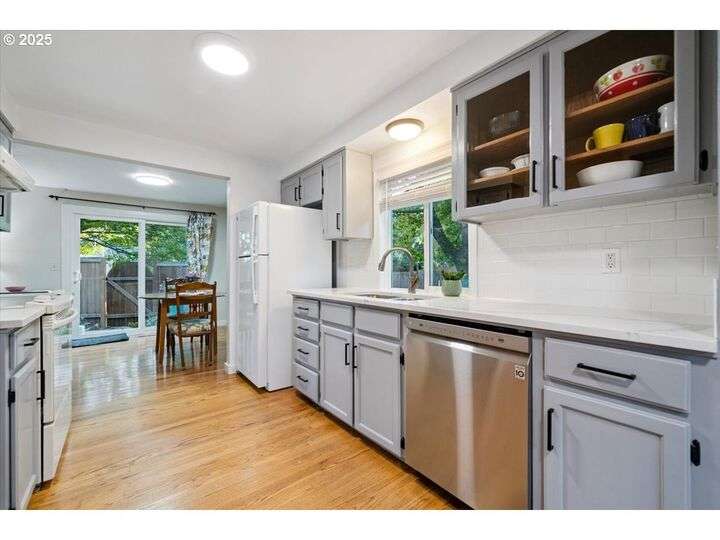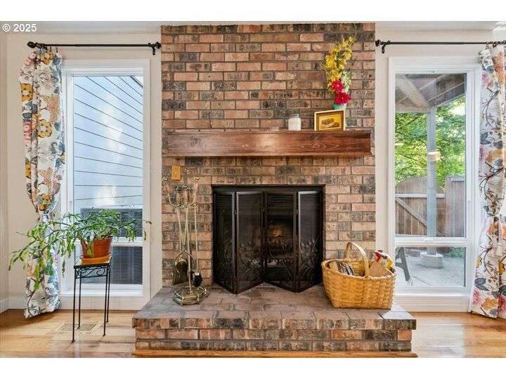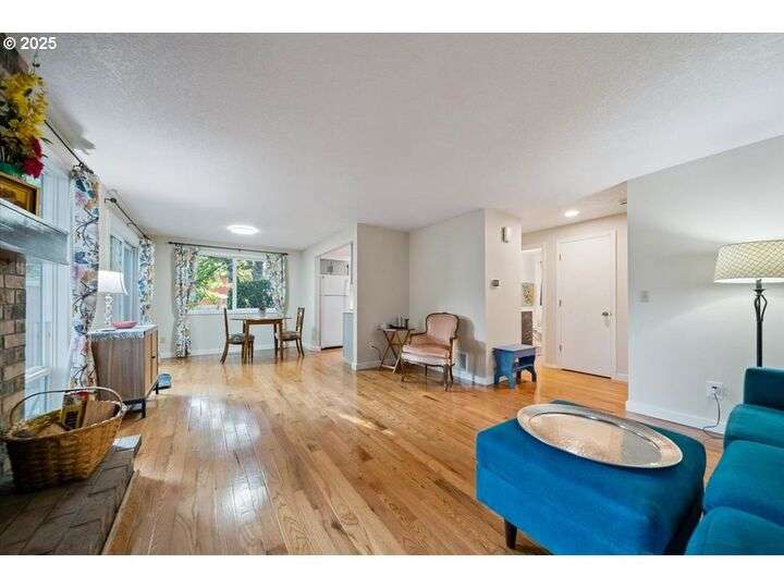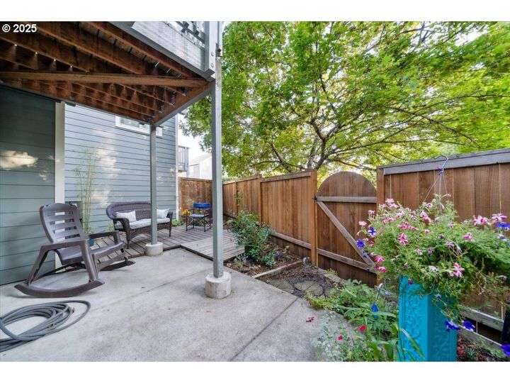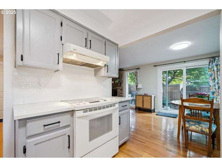 Beautifully maintained 2-bedroom end-unit townhouse with hardwood floors, inviting living room with wood-burning fireplace, and an updated kitchen with quartz counters, subway tile backsplash, painted cabinets, and newer appliances. The main level features a refreshed half bath, while upstairs the vaulted primary bedroom opens to a private deck. A fenced patio/deck offers plenty of outdoor living space. Community upgrades include newer siding, roofs, gutters, and windows. HOA covers exterior maintenance, landscaping, water, sewer, and garbage, plus amenities with pool, basketball court, and walking paths.