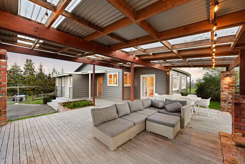 The welcoming villa capitalises on its elevated position, with large windows framing the stunning vistas of the surrounding land and the wrap-around front deck providing the perfect setting to unwind and enjoy the dramatic sunsets.