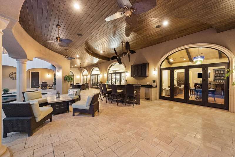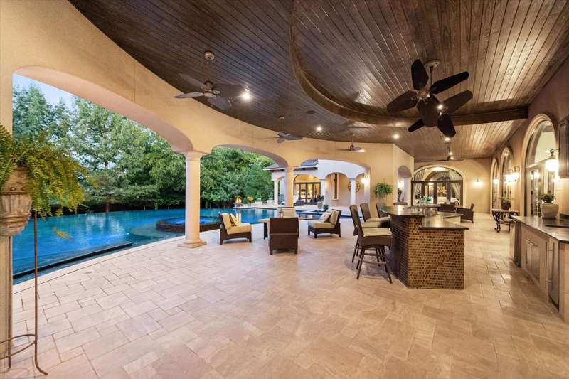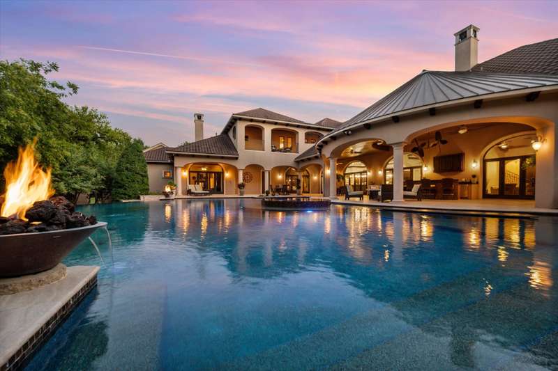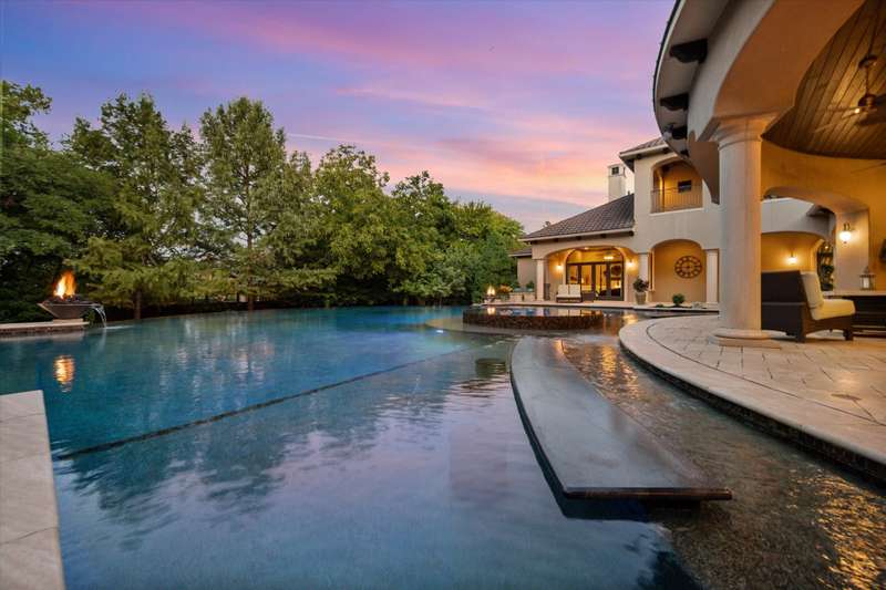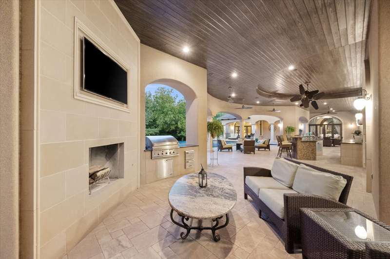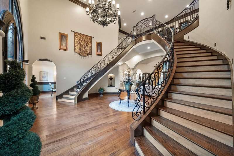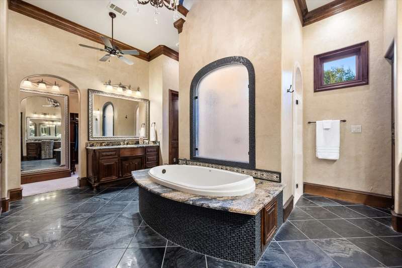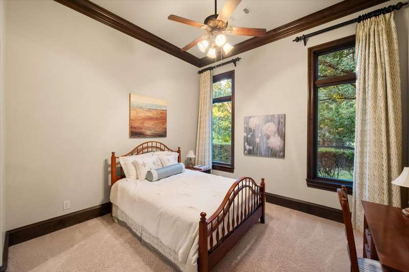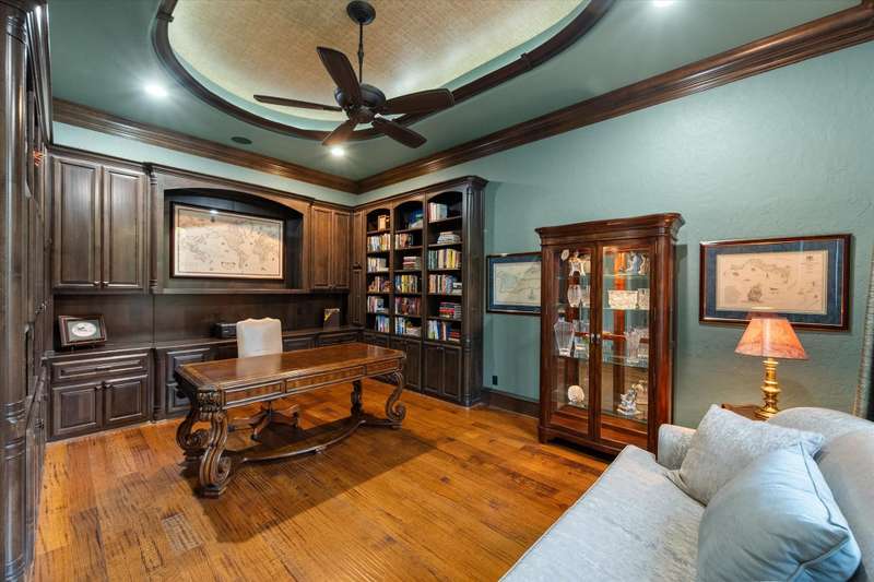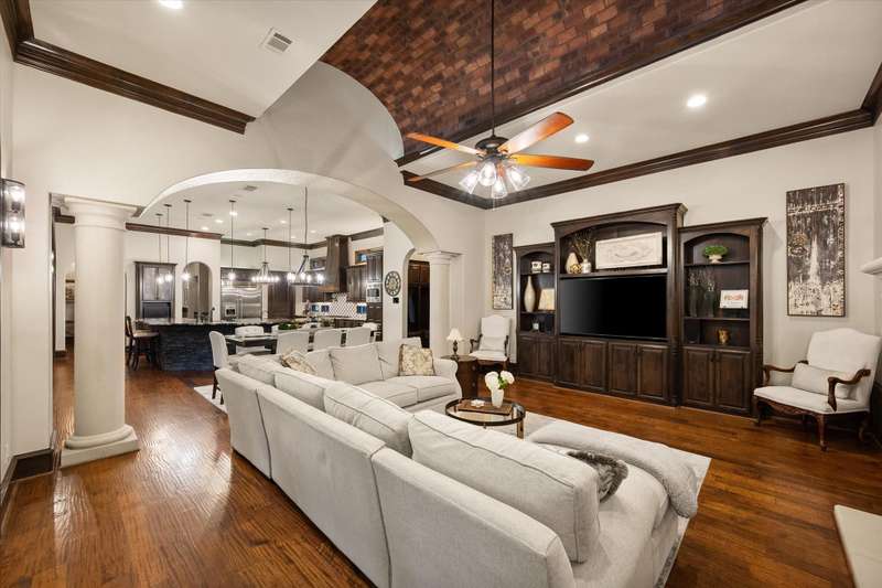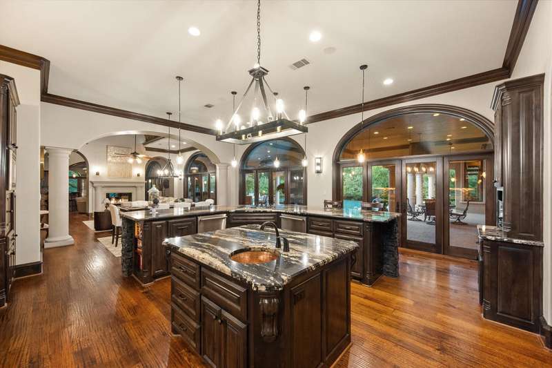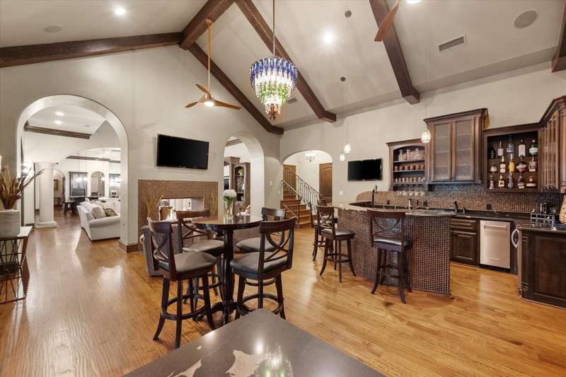 Welcome to a masterpiece of elegance and seclusion in Mansfields prestigious Strawberry Fieldsa luxury estate where resort living and timeless design unite on two private, beautifully landscaped lots. Behind its stately stucco and stone faade, a grand foyer with a sweeping staircase sets the tone for sophisticated living. Step inside and discover hand-scraped hardwood floors throughout, soaring ceilings, and walls of Custom Marvin windows that bathe every space in natural light. Off the entry, a richly appointed study and formal dining room introduce the homes gracious flow. The primary wing is a private retreat, complete with a fireside bedroom overlooking the pool, a coffee bar with sink and refrigerator, and a spa-worthy bath featuring a Jacuzzi tub and custom cabinetry. Designed for entertaining, the heart of the home reveals a gourmet Thermador kitchen anchored by a striking custom copper vent hood, two dishwashers, butlers pantry, and open sightlines to the formal living area and double-sided fireplace. A spacious bar with refrigerator, dishwasher and ice maker connects the formal and casual living areas, creating seamless gathering spaces. A second bedroom suite is conveniently located downstairs. Upstairs, movie nights shine in the media room with popcorn bar, flanked by two additional bedroom suites, a large living area, and a balcony overlooking the grounds. Outside, an award-winning poolfeatured on HGTVs Cool Poolssteals the show, complete with a heated spa, dramatic fire bowls, multiple covered lounges with fireplace and bar, and a secluded lower fire pit. Expansive lawns offer room for play or future additions. A 4-car foam-encapsulated garage, air-conditioned workshop, Control4 whole-home smart system, tornado shelter, pet shower, and abundant storage ensure modern comfort and peace of mind. This is more than a homeits a resort-inspired sanctuary, crafted to impress and designed to be lived in beautifully.