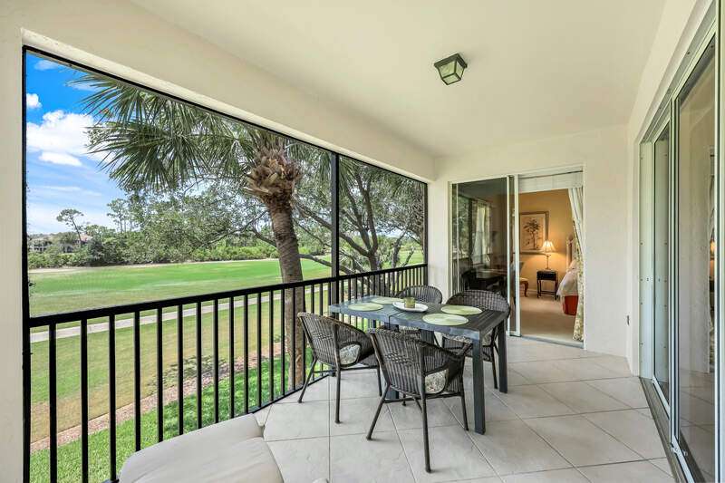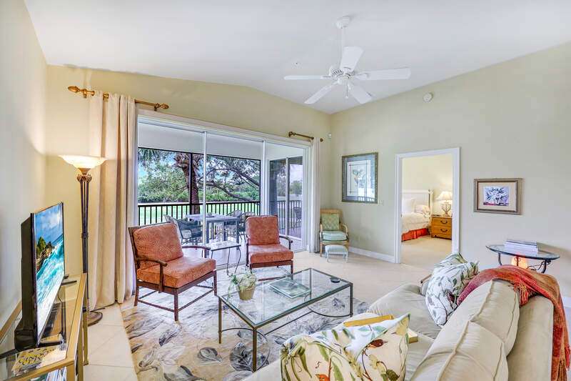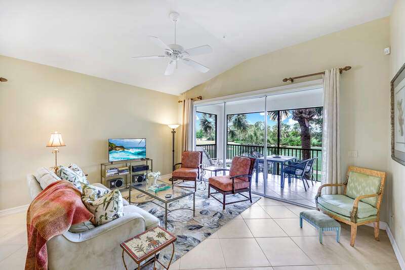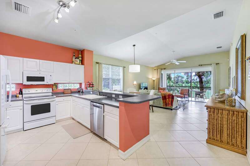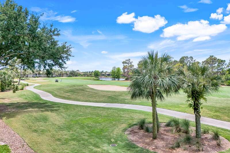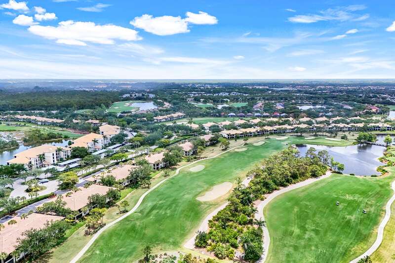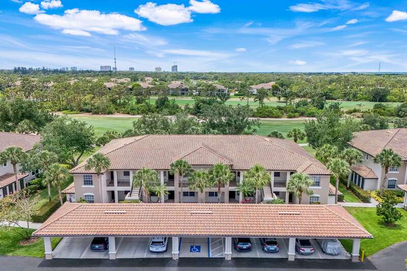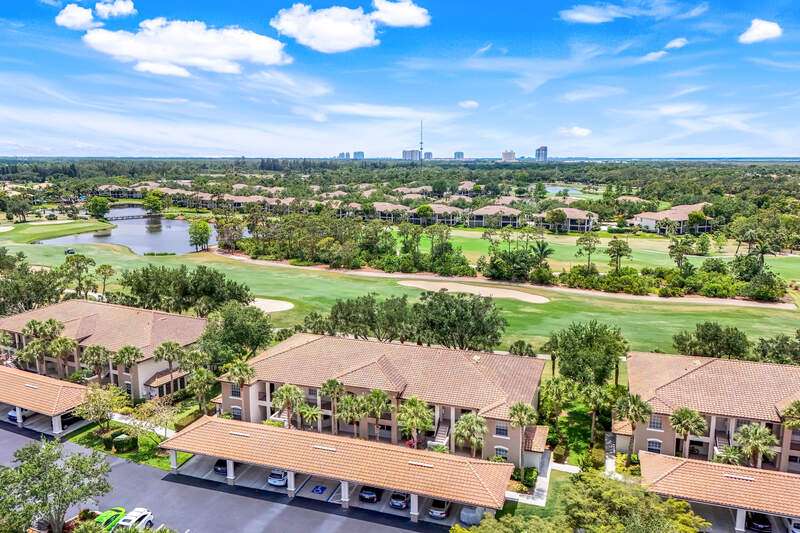 Bright southwest facing, top floor end unit home with an incredible panoramic view of golf, lake and quaint wooden bridge in the distance. Wonderful corner lanai to enjoy the cross breezes, the view and the sunsets from! Enjoy the privacy of having great space from the adjacent building! You will love being close to two resort pools, spas and grilling areas. From your open kitchen you can enjoy the view and the company of your friends and family. Kitchen features new overhead lighting, durable Corian countertops, crisp white raised panel cabinets, and 1-year NEW dishwasher. No worries here with the 1-year NEW HVAC, BRAND NEW hot water heater. This home has been gently used and meticulously maintained. Gorgeous, cream 20" tile throughout the living area. Guest bedrooms and closet space are exceptionally comfortable sizes compared to the coach home plans in Pelican Sound. In fact, all the units in Turnberry II are bigger than the same floor plans in the mid-rise buildings, by about 150 Sq. Ft! Pelican Sound has been called the best bundled golf community in the region and for good reason.This community is an exclusive and quiet enclave where residents enjoy the beauty of nature all around them plus an array of top-notch amenities, unmatched in this price range! Membership to this incredible community is included for a very reasonable Transfer Fee & there are activities for every interest, from golf and fitness, to fishing and boating, and even a water taxi to the beach on the Gulf! Keep your own boat in the secure on site storage area if you wish. Never get bored with the 27 holes of championship golf, 8 busy tennis courts, 14 very active pickle ball courts, bocce courts and leagues, and the attended, state of the art fitness center. There is more!- six pools, two clubhouses with 4 dining venues and a very active social calendar! It's like living in a resort! West of US 41 and close to everything fun in exciting Estero! Come tour the best, most fun community in Southwest Florida!