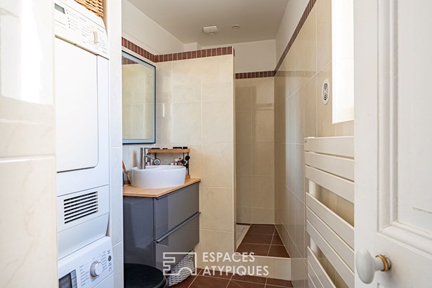 The first floor houses a cozy living room with a wood-burning stove, an open-plan fitted and equipped kitchen, a laundry room, a shower room and a bedroom.