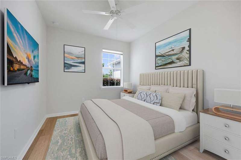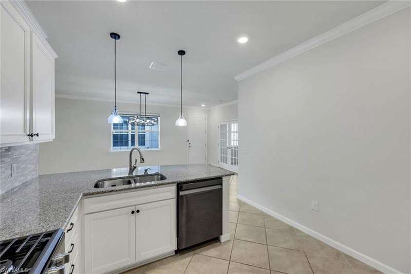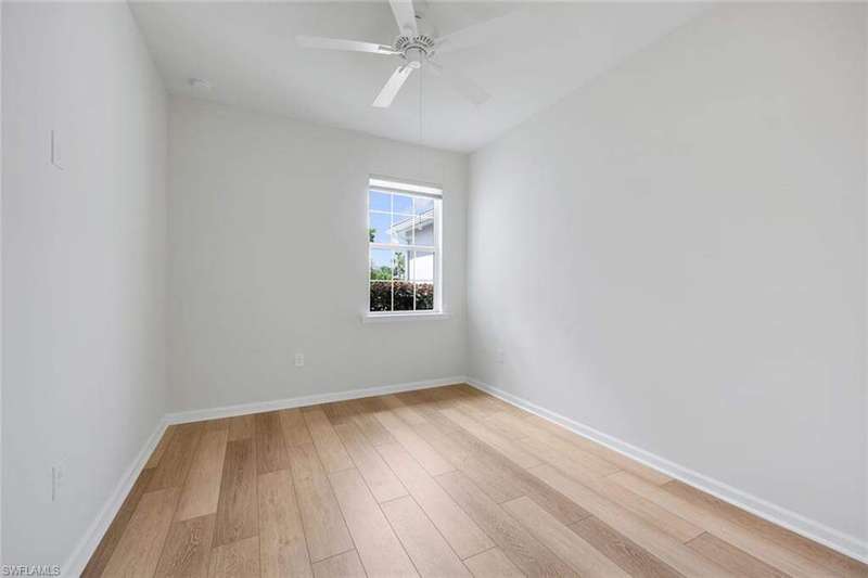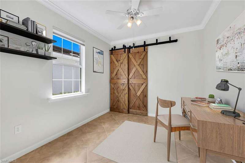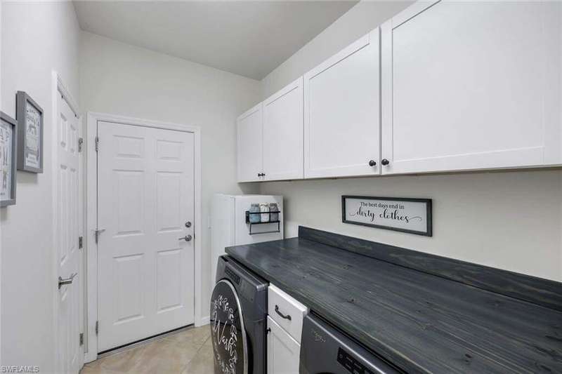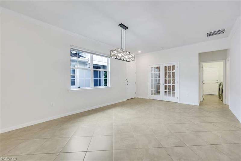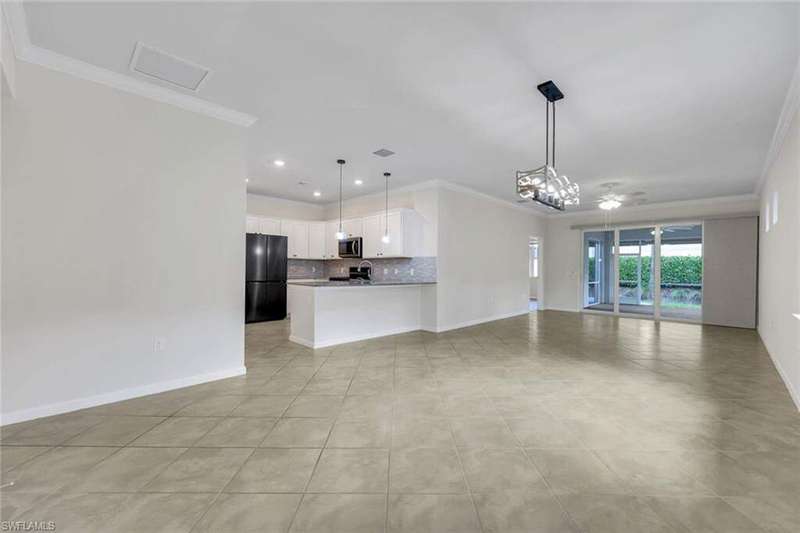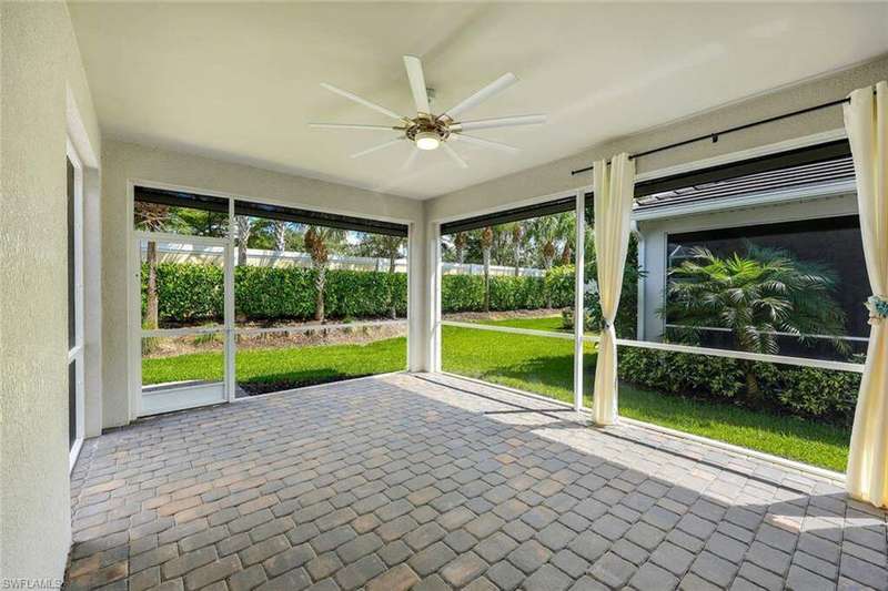Welcome to your dream home in vibrant Estero, this property perfectly balances comfort and style within a gated community brimming with amenities. Enjoy a leisurely lifestyle with access to an amenities center, fitness center, library, pickleball and tennis courts, bocce, and a community pool complete with a spa. For your furry friends, the community offers a dedicated dog park, ensuring everyone's needs are met. The heart of this home features an upgraded kitchen and laundry room complemented by additional cabinetry over the washer and dryer providing ample storage space, boasting a separate freezer and all the latest high-end appliances. The layout offers privacy with separated bedrooms, including a primary suite with a spacious walk-in closet, and an additional closet in the den with a sliding barn door, ideal for a third bedroom. Step outside to your covered, extended lanai-and a perfect outdoor gathering area enhanced by professional patio renovations-ideal for entertaining under the stars. This home also showcases new paint, custom blinds, and stylish crown molding throughout, while practical additions include a widened driveway, storage racks in the garage and Storm Smart electric storm screens on the lanai provide convenience and peace of mind in addition to ***Impact windows*** and ***No CDD and ***No FLOOD Insurance required. Just moments away, indulge in beaches, premier shopping at Miromar Outlets, and vibrant entertainment at Hertz Arena. With Gulf Coast Center, Coconut Point, and SWFL International Airport nearby, every convenience is at your fingertips. This property truly offers a slice of paradise-your perfect new home awaits!
