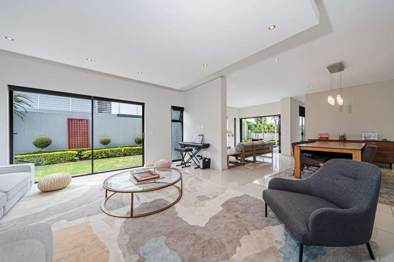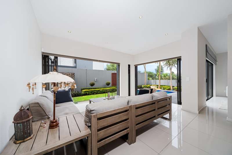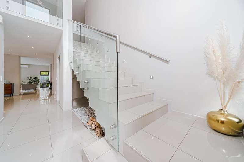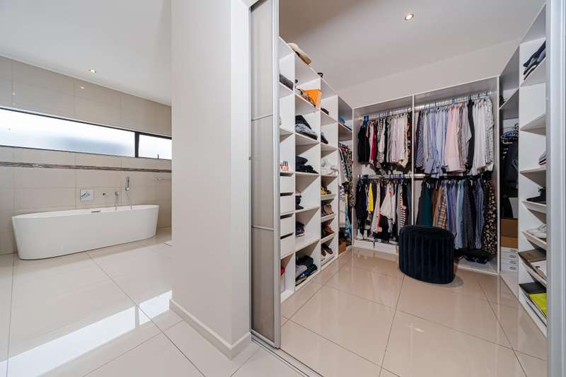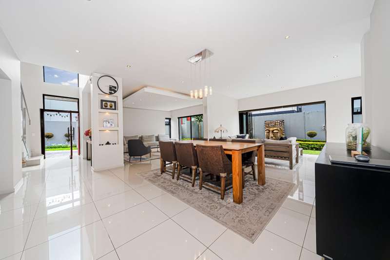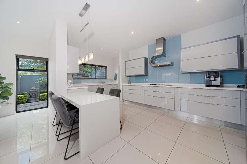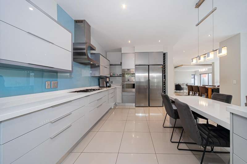Upon entering, the double volume entrance creates a dramatic and welcoming ambiance, setting the tone for the home's modern aesthetic. The open plan lounge, kitchen, and dining space are bathed in natural light, fostering an airy and expansive atmosphere. The kitchen is a culinary haven, boasting Smeg 5 burner gas hob, Caesarstone countertops, a walk-in pantry, and a separate scullery for added convenience.
