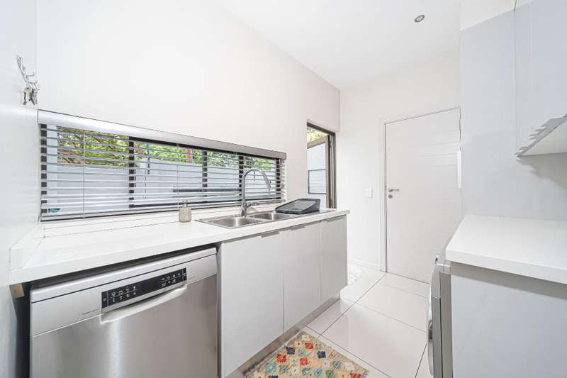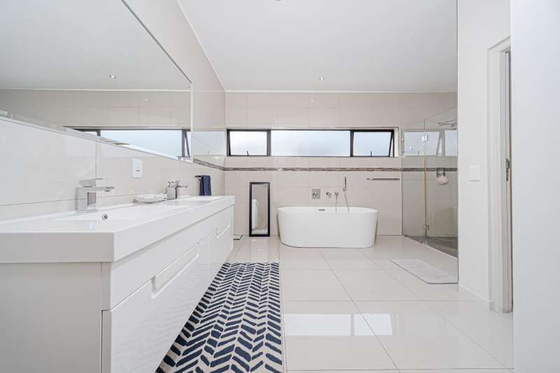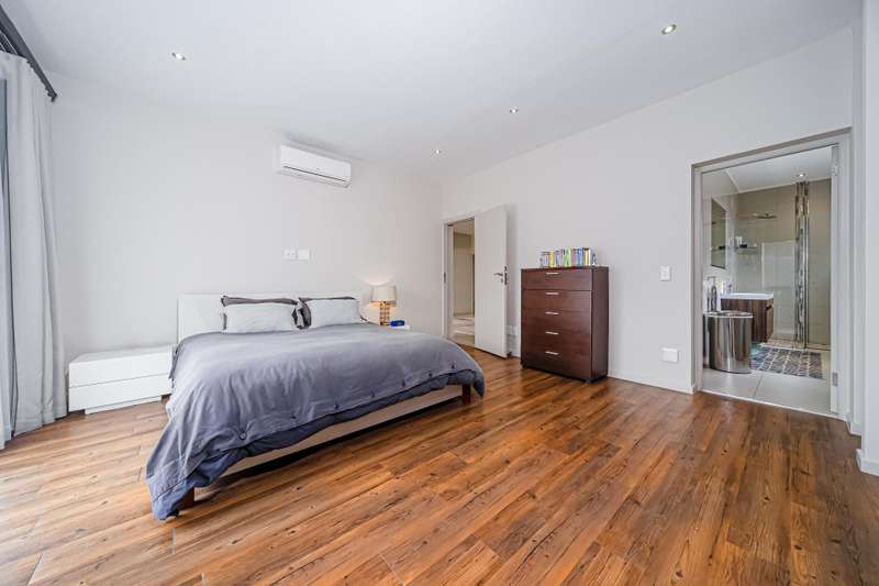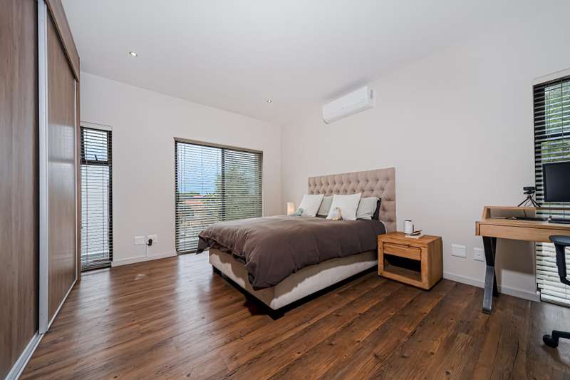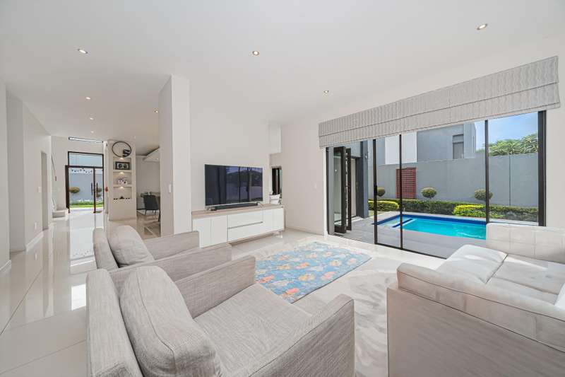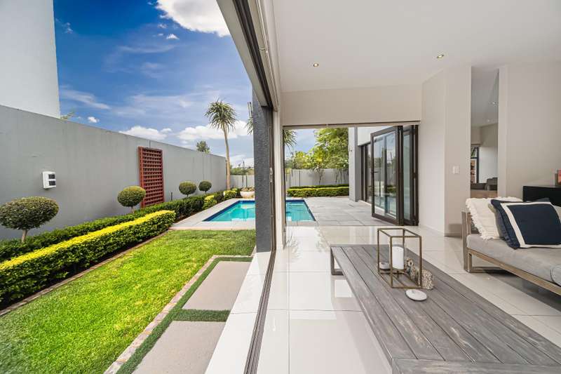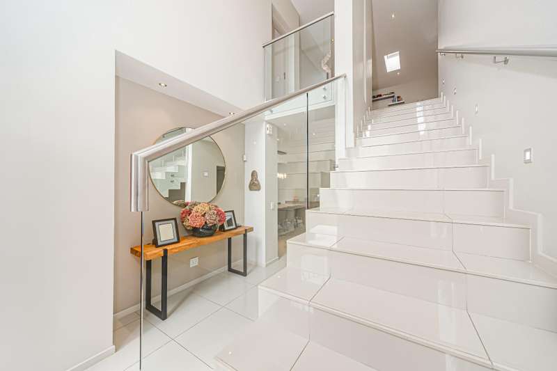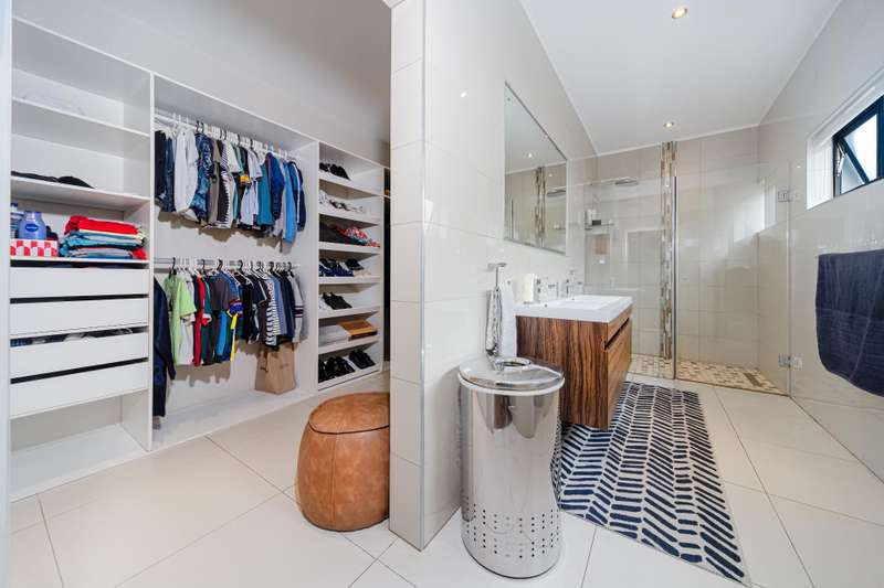 Upon entering, the double volume entrance creates a dramatic and welcoming ambiance, setting the tone for the home's modern aesthetic. The open plan lounge, kitchen, and dining space are bathed in natural light, fostering an airy and expansive atmosphere. The kitchen is a culinary haven, boasting Smeg 5 burner gas hob, Caesarstone countertops, a walk-in pantry, and a separate scullery for added convenience.