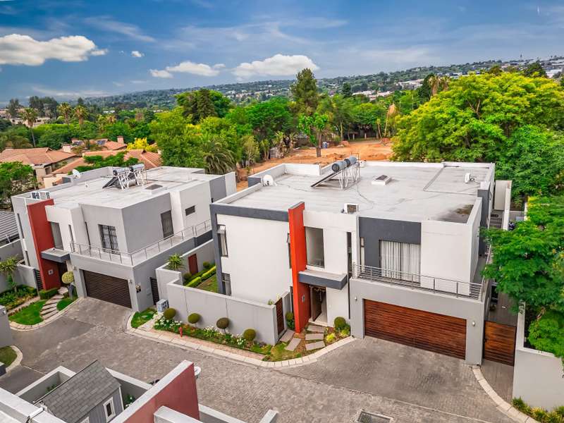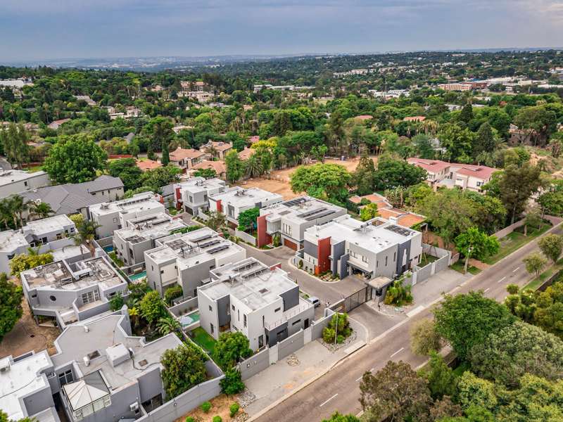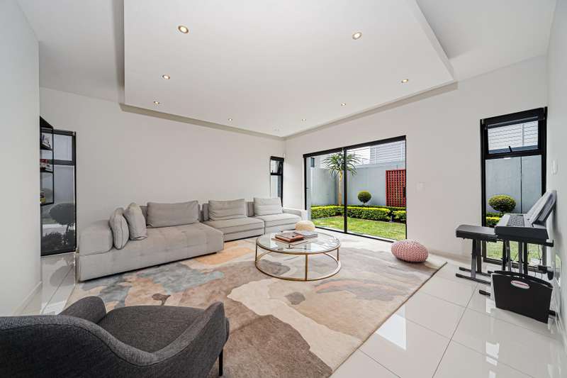 Practical considerations include a 5kVA inverter with a 3kVA battery, making the home solar-ready and environmentally conscious. The main bedroom boasts a large walk-in closet and a full ensuite with a double vanity, bath, and double shower. The second and third bedrooms are equally well-appointed, each with ensuite facilities, built-in cupboards, and unique design elements. Conveniently located close to reputable schools and the bustling business hub of Sandton, this modern cluster offers the perfect balance of tranquility and accessibility. With 24-hour security, residents can enjoy peace of mind, while the approximate costs for water, sanitation, and refuse highlight the practical considerations that have been taken into account.