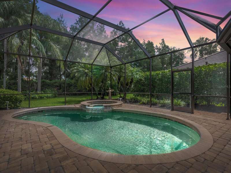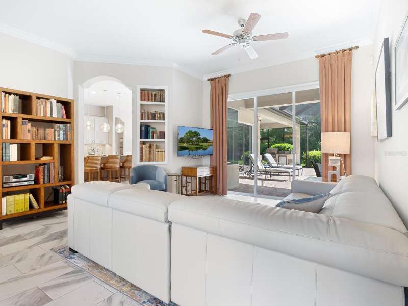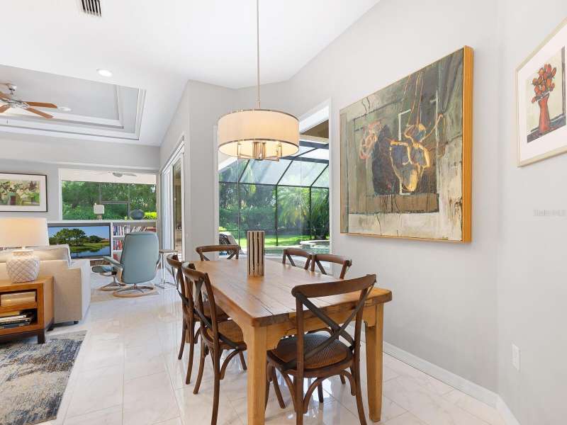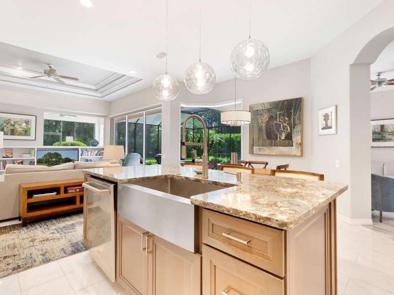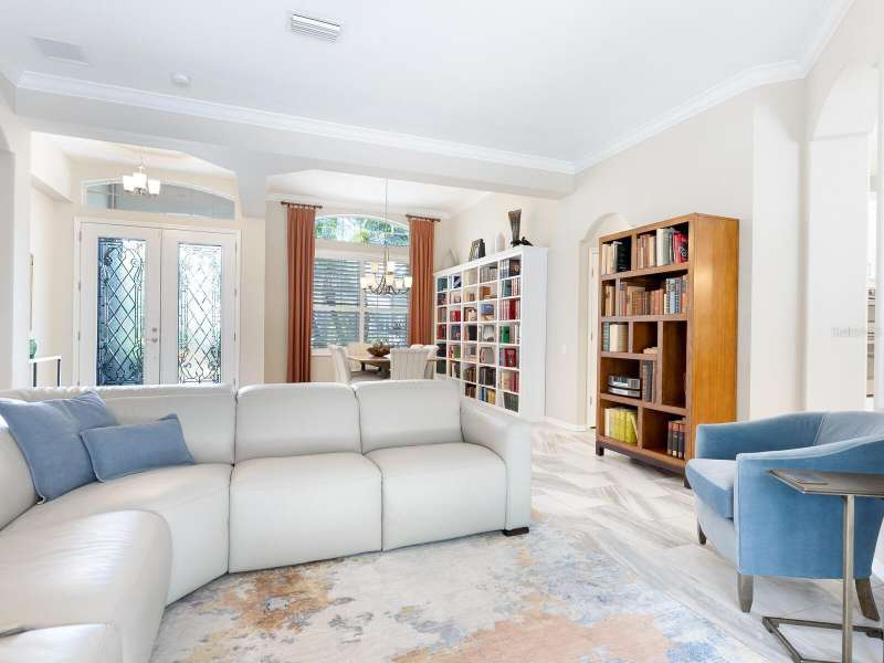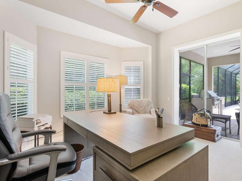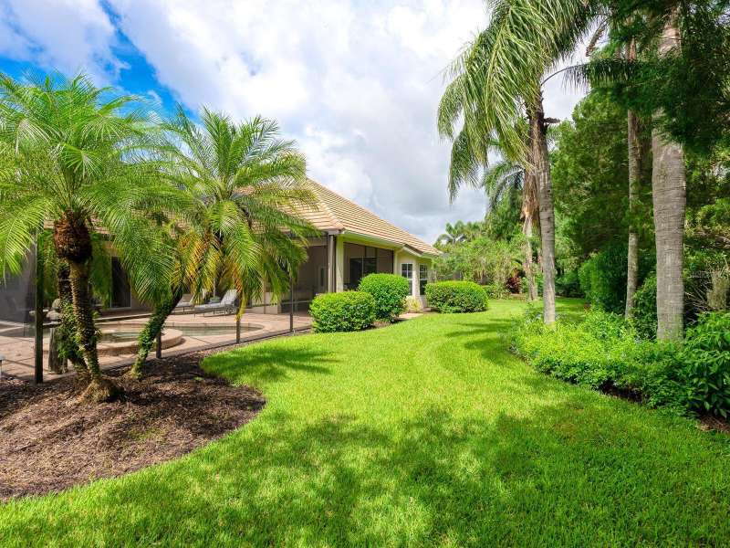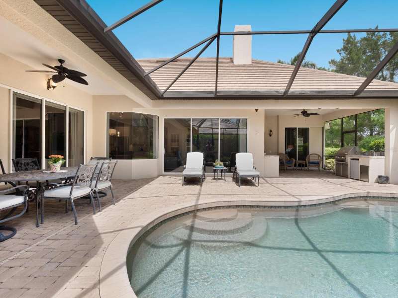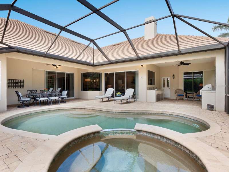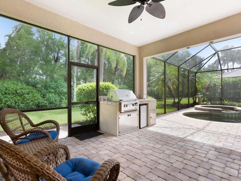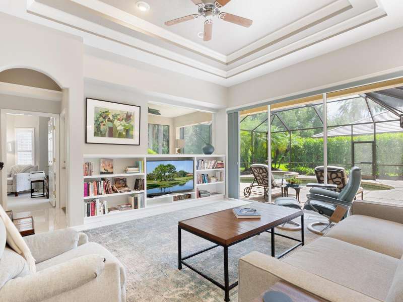Under contract-accepting backup offers. Surrounded by impeccable lush landscaping and a stunning exterior elevation, this Lakewood Ranch Country Club home has true curb appeal and leaves a memorable first impression. From the moment you open the designer double doors, you will appreciate the well-designed floor plan and array of sophisticated appointments including elegant ceiling treatments, built-ins, crown molding, and updated porcelain tile flooring. Preparing your favorite meals is a delight from the well-appointed updated kitchen with staggered cabinetry featuring soft close pullouts, exotic quartz counters, designer glass tile backsplash, two pantries, stainless steel GE Café Series appliances, under cabinet lighting, a chair height island and charming dinette area perfect for enjoying your morning coffee. The spacious living room/dining room combination invites cheerful gatherings, while the rear office provides the setting for quiet study. The family room features a built-in media center with television all included while the masterfully crafted built-in at dining room blends form and function setting a refined scene for entertaining. You will look forward to retiring each evening to the master suite with sitting area, and newly renovated master bath with huge roman shower, two suited walk-in closets, window seat with storage, and gorgeous make-up vanity - quite simply fit for royalty. Sleek sliding doors from living, family room and office open to the generously-sized heated Pebble-Tec pool with spa and paver deck. The outdoor kitchen features new Vintage 36” grill with refrigerator and expansive preparation area making outdoor entertaining effortless. Both guest bath and pool bath have also been updated to include wood cabinetry, granite counters and designer tile. Other features include large storage closet in hall and epoxy garage floor. Located in one of the original Lakewood Ranch Country Club communities, this home is a bike ride to the athletic center and is within easy reach of miles of peaceful nature trails and parks and just a short distance to the Main Street lifestyle shopping district and UTC Mall.