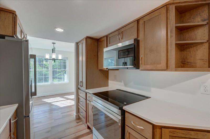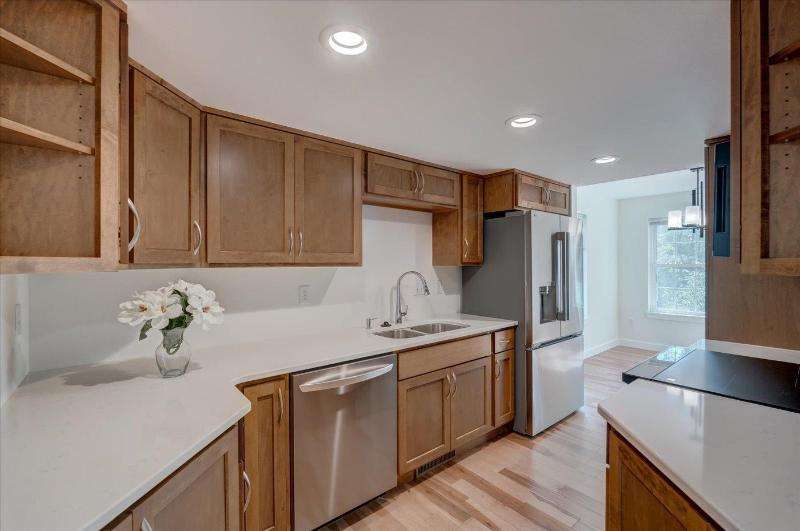 Stunning, completely rebuilt 3 BR, 3.5 bath town home awaits a new owner. Flooded with sunlight and drenched in style and appeal. This home offers gorgeous maple floors throughout entire main and upper level. Thoughtfully redesigned kitchen opens to dining room. New stainless-steel appliances, solid surface counters and ample maple cabinetry. Living room patio doors lead to new maintenance free deck overlooking tree lined back yard. Spacious owner's suite with en suite bath and huge walk-in closet. Family room walks out to lower-level patio and has a stunning, floor to ceiling corner fireplace. Laundry upstairs & down! New windows, doors, appliances, furnace, AC, flooring, trim, lighting, fixtures and more! Ready for you to move in and enjoy!