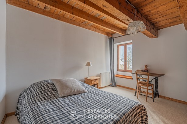 The first part, with its numerous small openings in the facade, its exposed stones, its wooden floors and beams and its imposing fireplace possesses all the cozy charm of vernacular architecture. The recently installed pellet stove further adds to this atmosphere an obvious well-being. Facing south, it comprises, on the ground floor, a beautiful living room with kitchen, on the first level, three bedrooms and a bathroom with toilet, and on the top floor, a spacious master suite under the eaves.