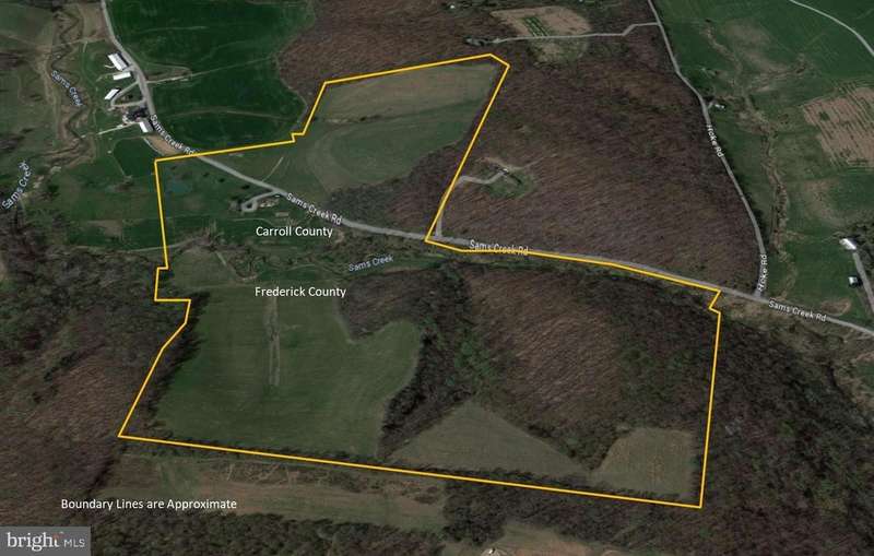 Approximately 120 acres comprised of two parcels including Land in Frederick and Carroll County Maryland. The Carroll county side includes a nice 3 bedroom, 2 bathroom home, 40 acres of land, a pond and has frontage on both sides of Sam's Creek Rd. The majority of this parcel is an agricultural preservation, but because the property is split by Sames Creek Rd, it is believed to have one remaining building, right. The Frederick County side consists of 79.75 acres. This property has never been subdivided and is not in agricultural preservation. As a result, it is believed to have 4-5 subdivision rights. The entire property had great views, hunting opportunities, and even fishing in the pond. The beautiful year-round stream separates the two parcels and serves as the dividing line between Frederick and Carroll County. Frederick County (Tax ID# 1117366009) Carroll County (Tax ID#0711000053) Professional photography coming soon.