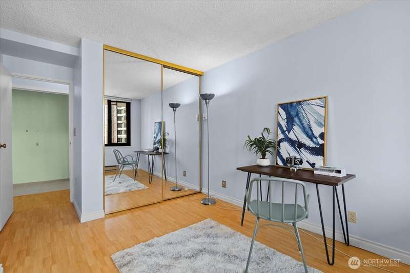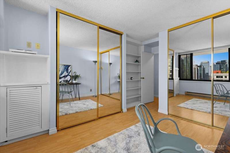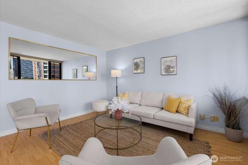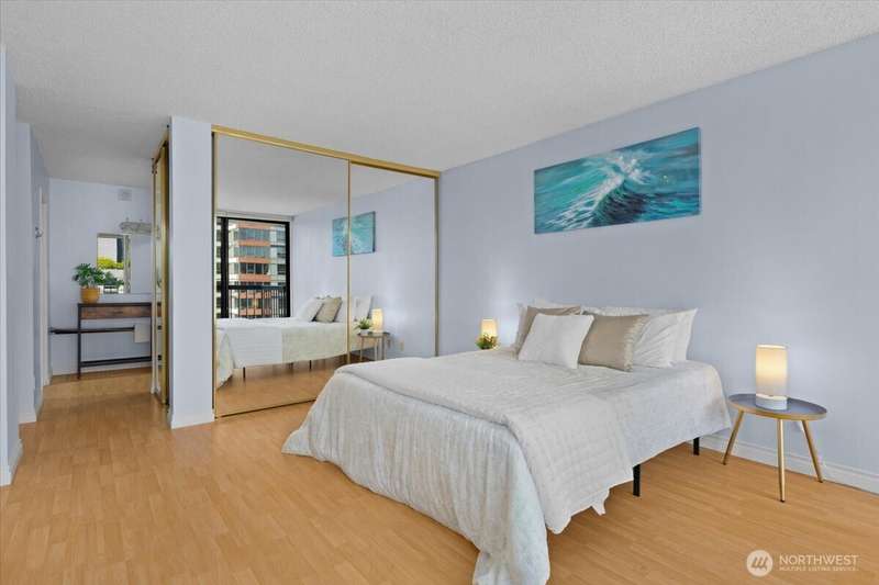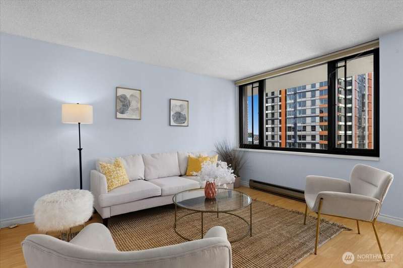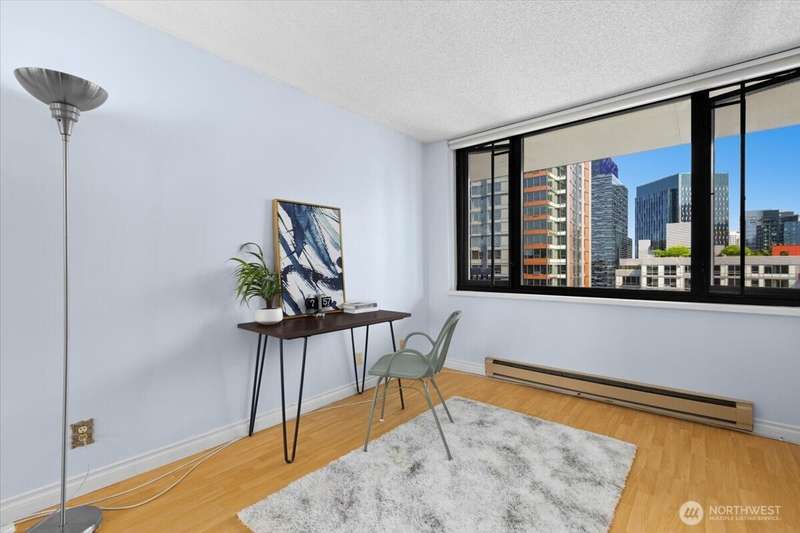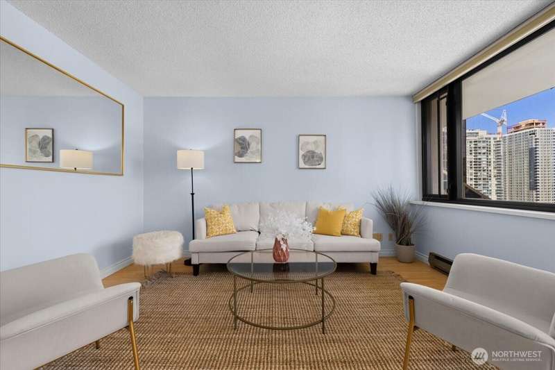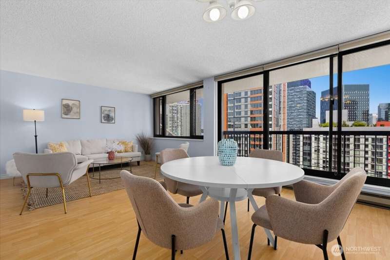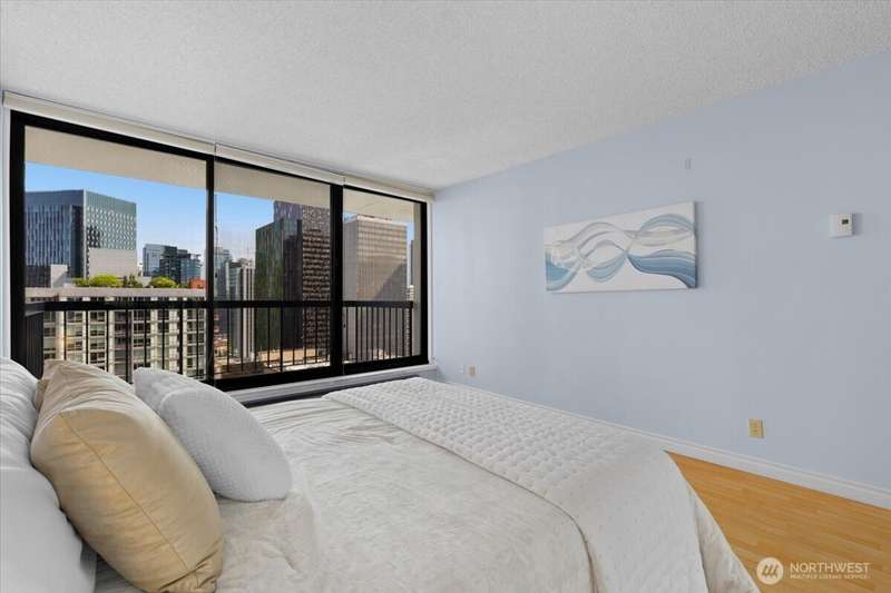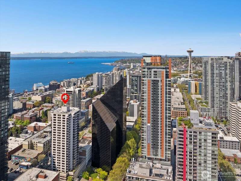 Huge Price Reduction + 1-Year HOA Credit for Full Price Offers at Closing! Enjoy sweeping city skyline views from the 25th floor of this spacious 2-bed condo in vibrant Belltown. Features include quartz countertops, stainless steel appliances, a private balcony off the primary suite with peekaboo views of Lake Union and Puget Sound, custom walk-in closet, and a secured parking spot with EV charger. HOA covers all utilities plus earthquake insurance. Building amenities include an outdoor pool, saunas, BBQ area, gym, reservable lounge, on-site manager, Amazon Lockers, and a dedicated mailroom. Steps from Pike Place Market, the Space Needle, Waterfront, and Amazon HQ. Bus stop and Westlake Link Light Rail Station are just a couple blocks away.