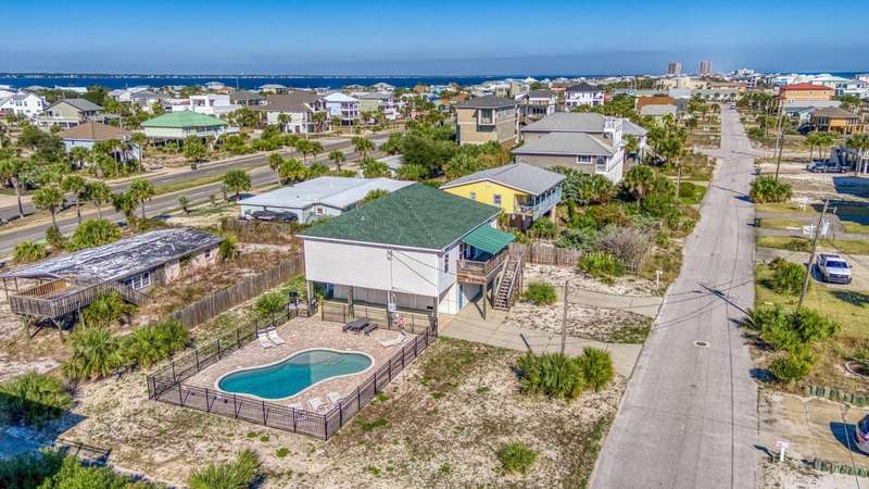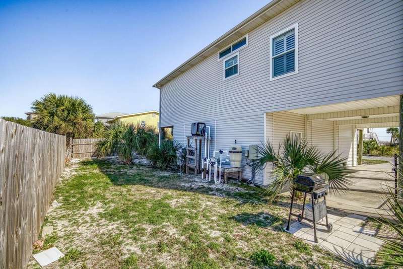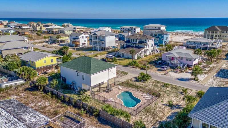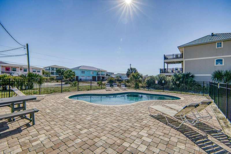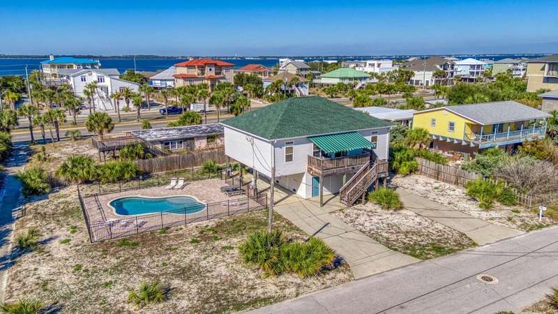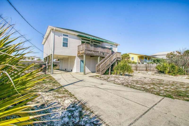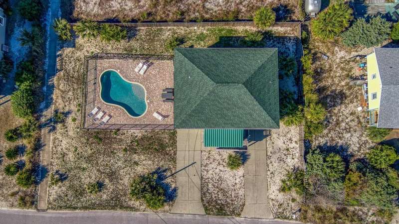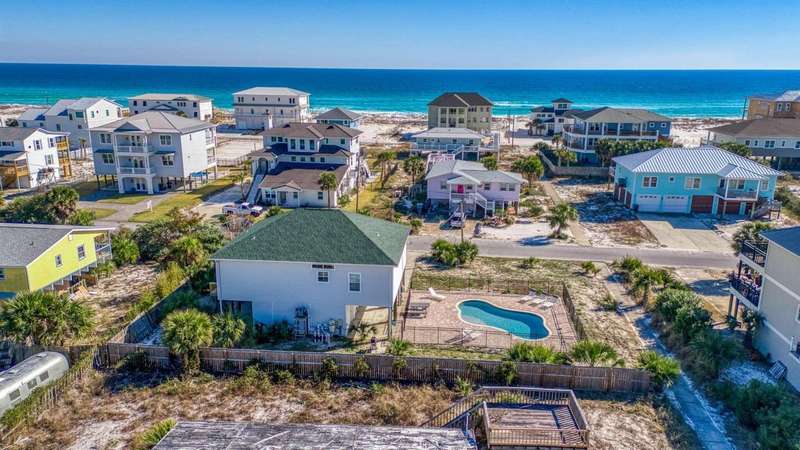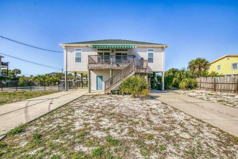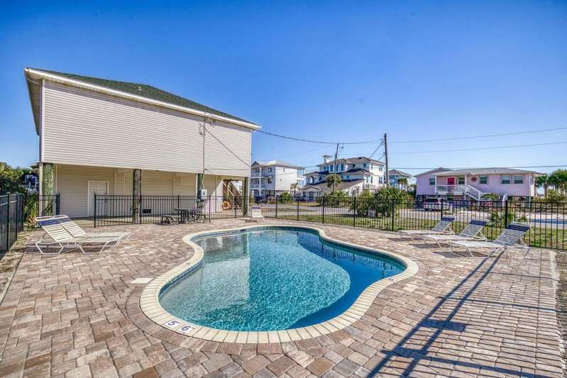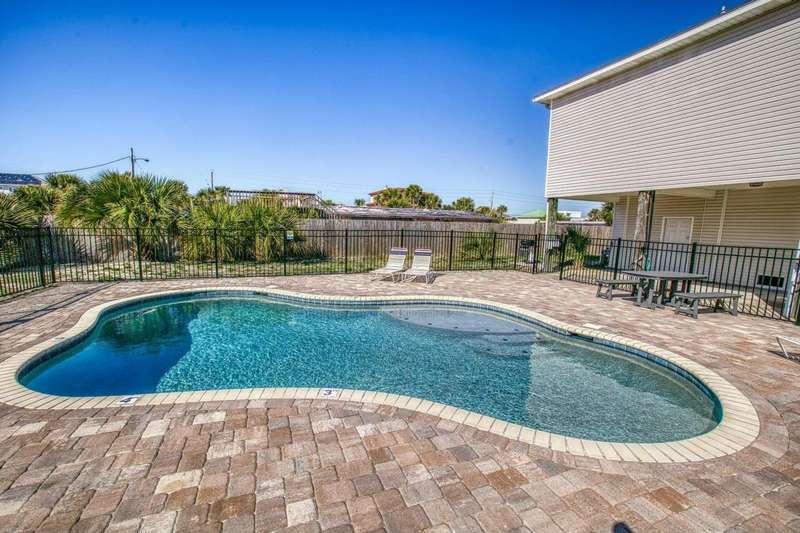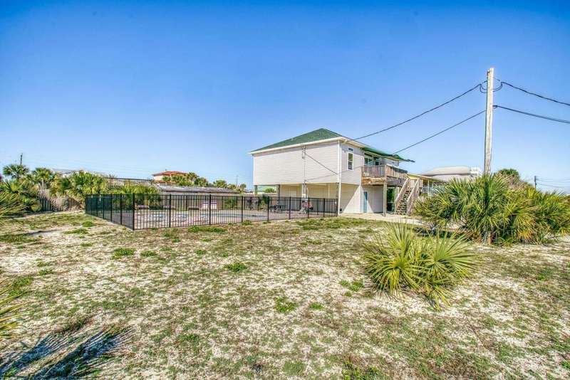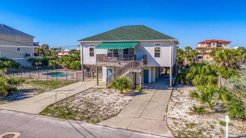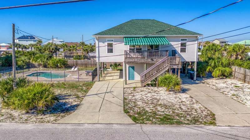 Escape to the Beach where your next Home Awaits! The spacious & light-filled open-concept living area seamlessly connects the kitchen, dining, & living spaces, creating a warm and inviting atmosphere for gatherings with family & friends. There are high ceilings, crown molding and tile floors throughout this split floor plan boasting 3 large bedrooms & 2 full baths, not to mention the downstairs game room & additional storage. This home is completely furnished & ready for you to enjoy or rent & sleeps 11 as furnished. The heart of this home is a large kitchen with an island, granite counters & tons of cabinets. Whether you're preparing a casual breakfast or hosting a lavish dinner party, this kitchen is equipped to handle it all. Dive into your own private saltwater - heated - in-ground- pool, perfect for cooling off on warm days or enjoying a refreshing evening swim. The spacious pool deck offers ample room for lounging & entertaining, creating your own personal paradise. This property is an oasis of tranquility just steps from the pristine sparkling Gulf waters. Enjoy effortless access - a 1 minute away - with your beach cart on the walkway to the beach next to the house. Spend your days swimming, sunbathing, shelling, or simply strolling along the Emerald Green Waters. And when you return home - rinse off with the convenient outdoor shower. The soothing sounds of the waves will be your daily soundtrack. Embrace the coastal lifestyle with a covered patio & pool, or when we get the occasional shower, the Playroom offers all sorts of games like ping pong, Pop-a-Shot & Foosball. The Playroom & covered patio are also great for al fresco dining or simply relaxing & enjoying the gentle sea breeze in the shade. Upstairs you can watch the water on the front deck where there is a remote awning for those hot & sunny afternoons. This home offers convenient access to all of the restaurants, shops & activities the Beach and Boardwalk has to offer! AC 2024, Roof 2023, Pool & Pool Heater 2021.