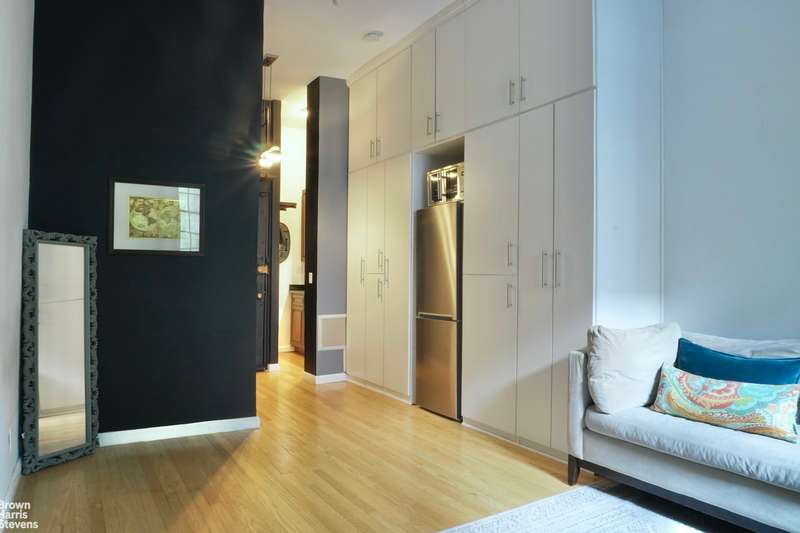 Shimmering white oak flooring extends throughout and an entire wall of sleek floor-to-ceiling built-in cabinetry seamlessly creates an abundance of storage options. An updated kitchen with granite countertops, stainless steel appliances and plentiful cabinets,  as well as a modern bathroom offering a glass-enclosed shower stall, complete the blend of modern comfort and old-world charm so tastefully combined here in this residence.