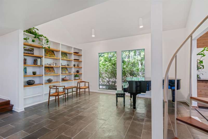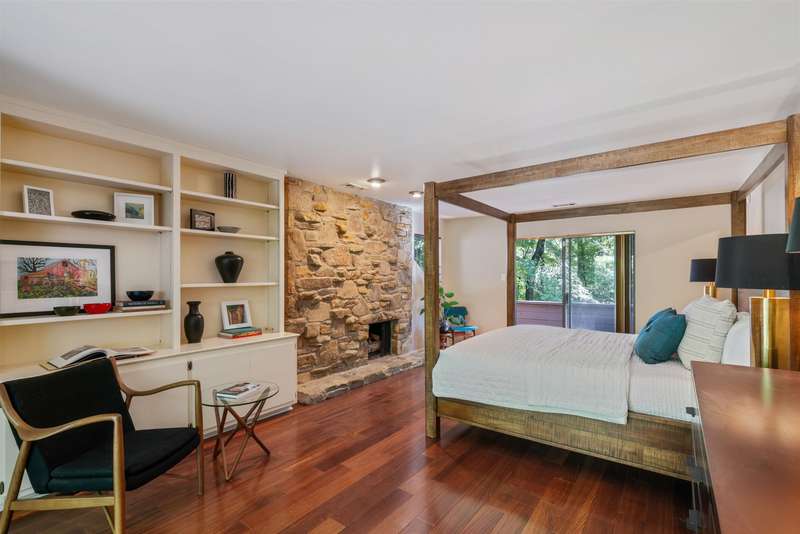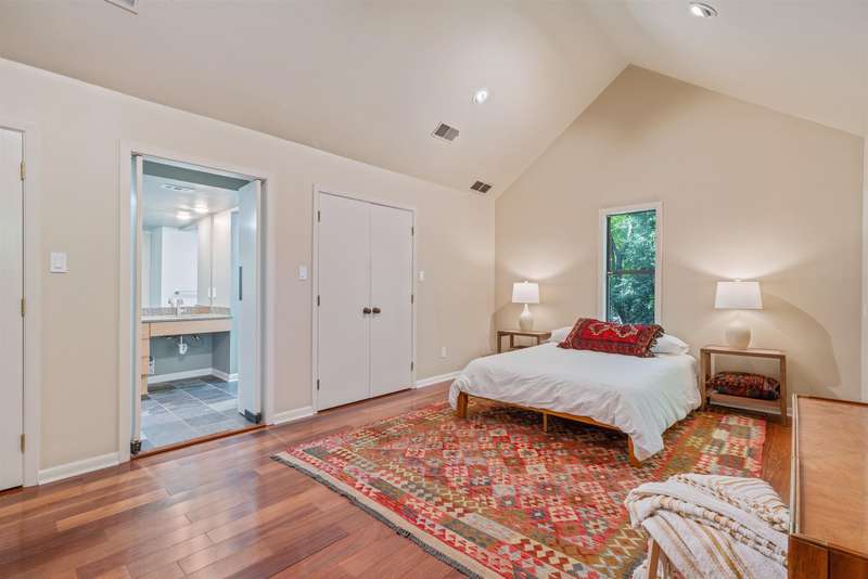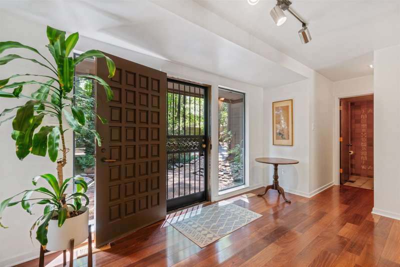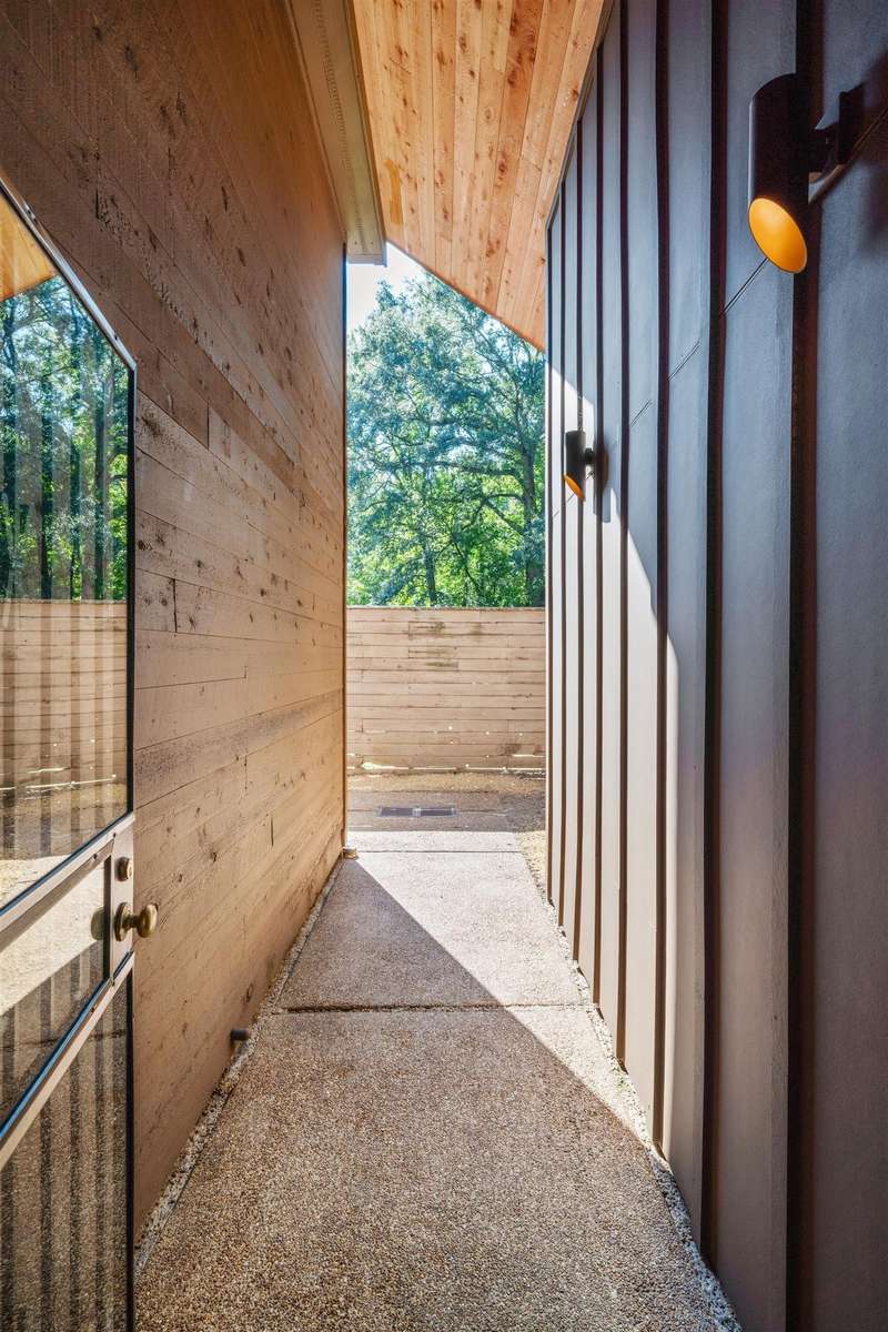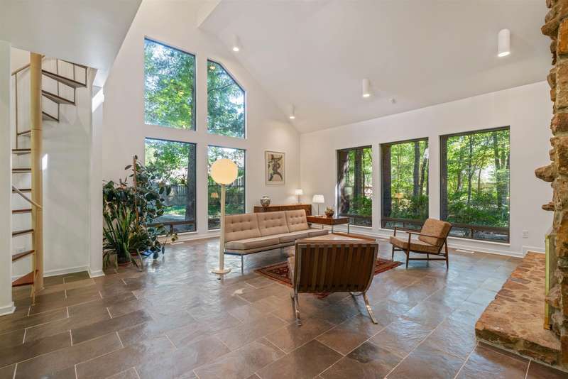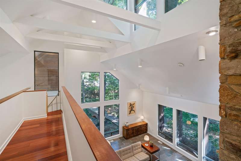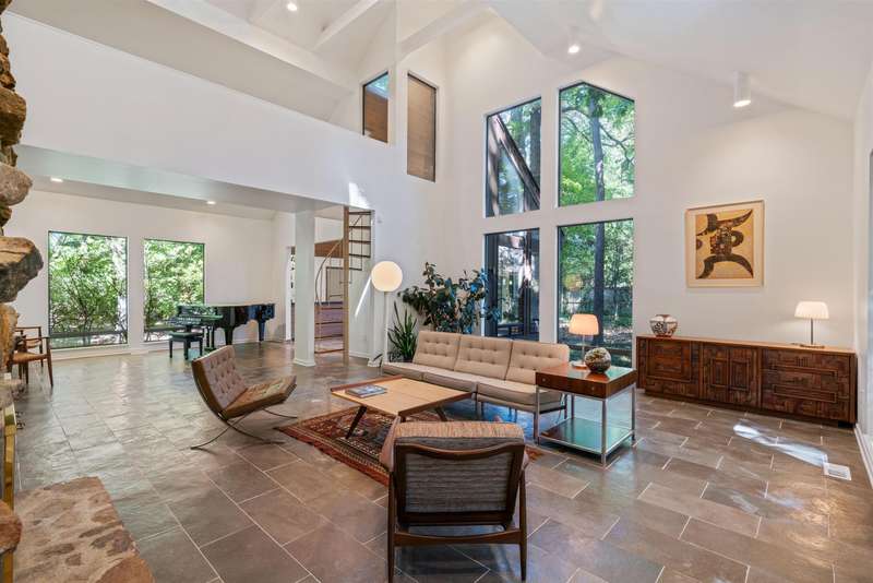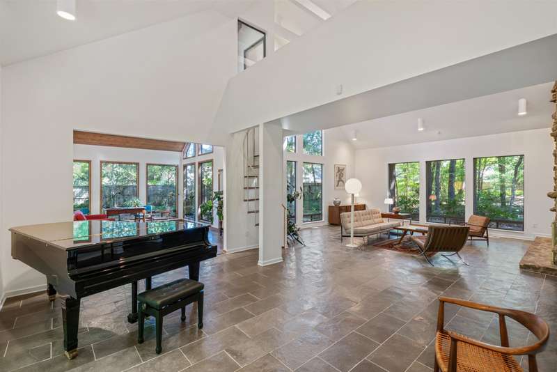 Your River Oaks refuge awaits—Arrive over a stone bridge to a modern retreat in harmony with nature, balancing drama and warmth. Soaring ceilings in the living room with lush views from every angle. The dining room and den open to the patio for indoor/outdoor entertaining. The low-maintenance landscape means you can spend your time enjoying the outdoors, not mowing it. Brazilian hardwood and limestone floors are so durable. The downstairs guest suite was designed for accessibility. Come up to your spacious primary with a balcony overlooking the front of your estate, and a huge window over the back. With a fireplace and bookcases, you could spend hours here. When you do have to get dressed, enjoy the large shower and dressing area with extensive closets and a double vanity. Grab a bottle of wine from the locking wine closet, passing the new induction cooktop, double ovens, and Sub-Zero fridge on your way out to the garage, or detour through the pantry and large mudroom.