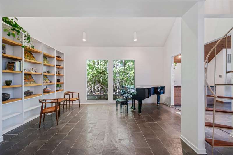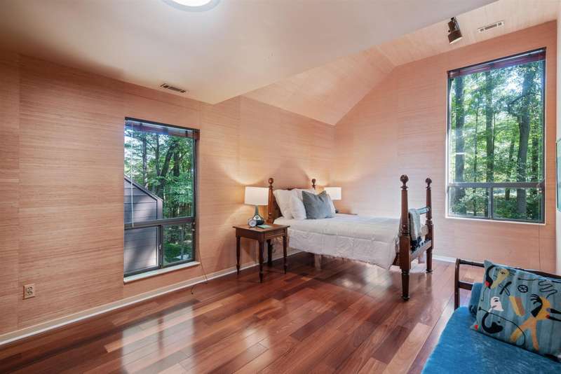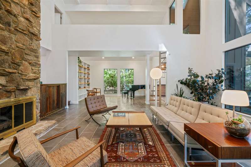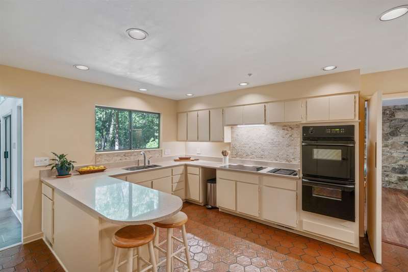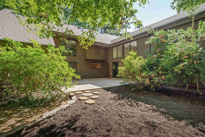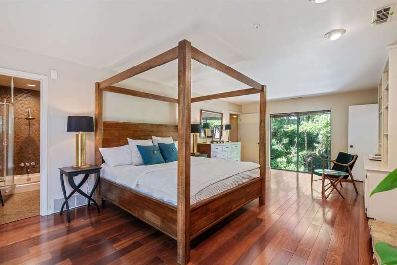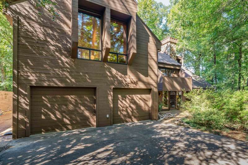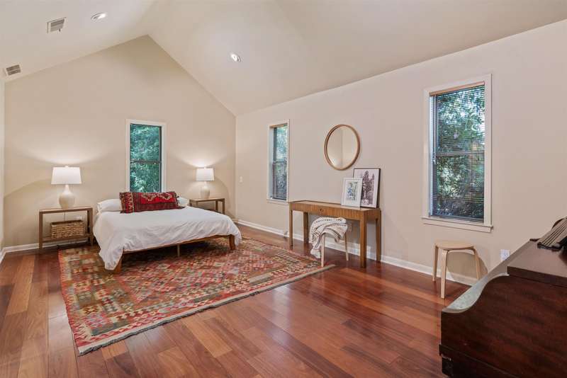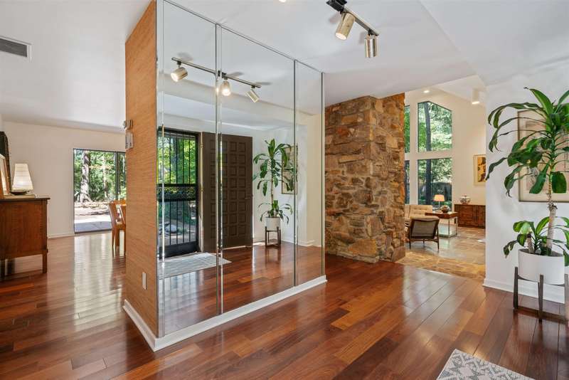 Your River Oaks refuge awaits—Arrive over a stone bridge to a modern retreat in harmony with nature, balancing drama and warmth. Soaring ceilings in the living room with lush views from every angle. The dining room and den open to the patio for indoor/outdoor entertaining. The low-maintenance landscape means you can spend your time enjoying the outdoors, not mowing it. Brazilian hardwood and limestone floors are so durable. The downstairs guest suite was designed for accessibility. Come up to your spacious primary with a balcony overlooking the front of your estate, and a huge window over the back. With a fireplace and bookcases, you could spend hours here. When you do have to get dressed, enjoy the large shower and dressing area with extensive closets and a double vanity. Grab a bottle of wine from the locking wine closet, passing the new induction cooktop, double ovens, and Sub-Zero fridge on your way out to the garage, or detour through the pantry and large mudroom.