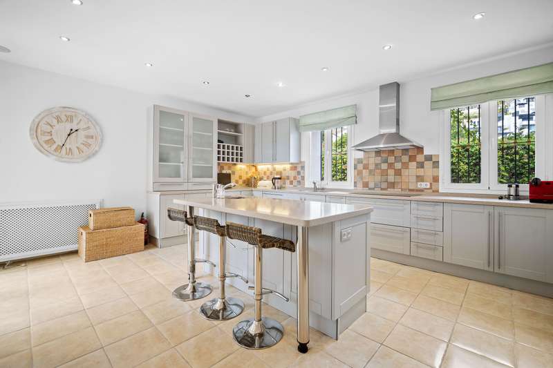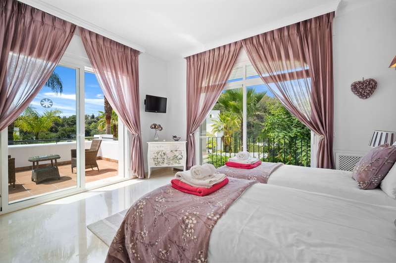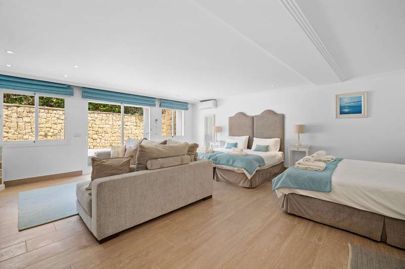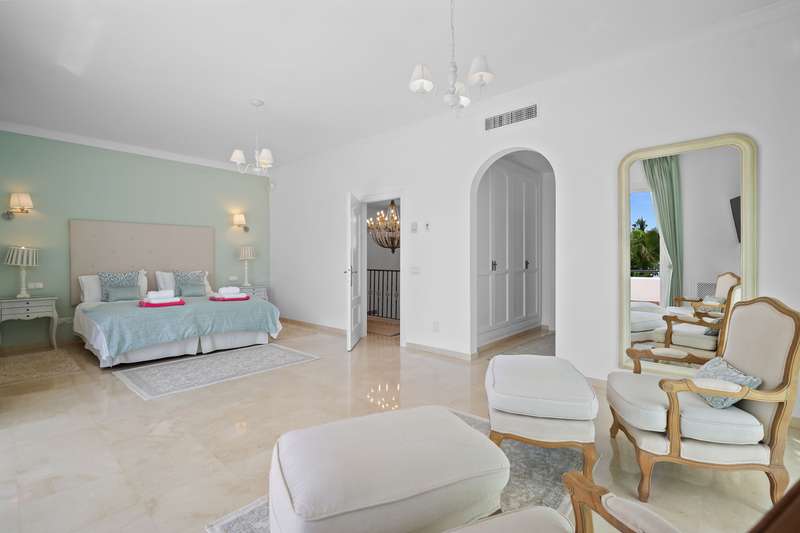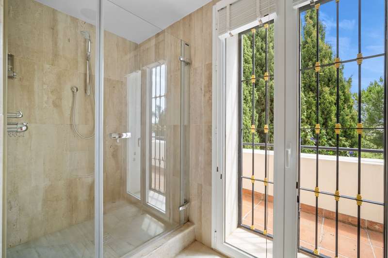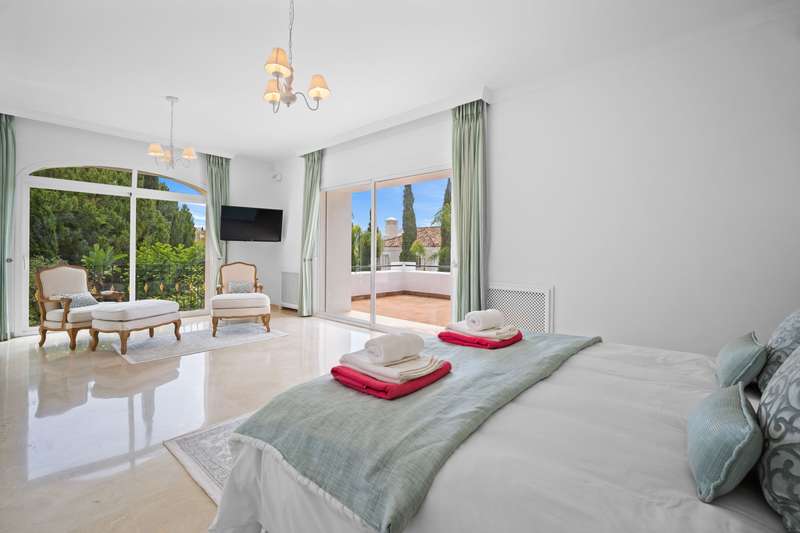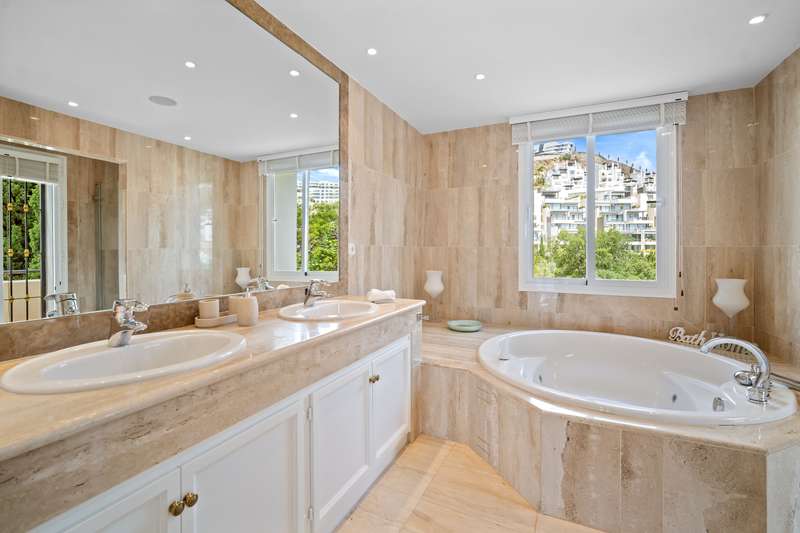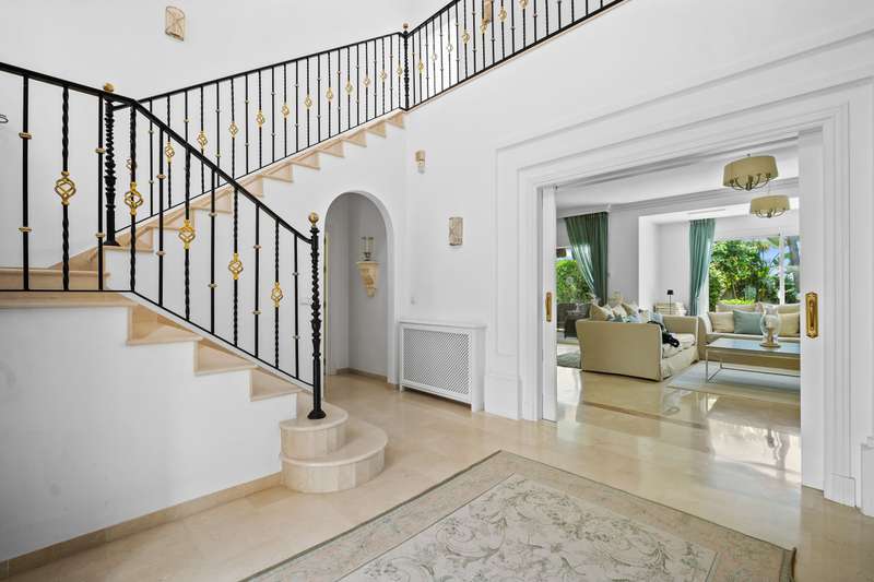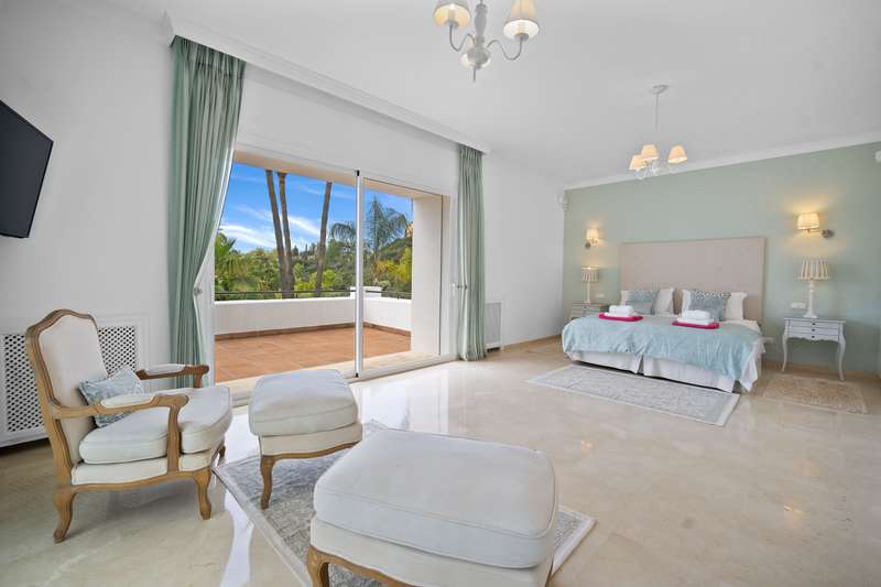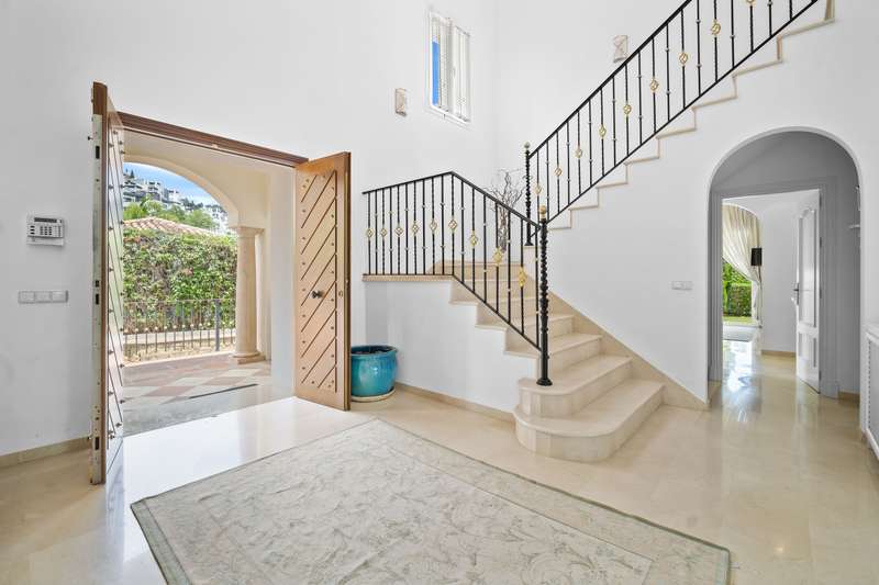 This immaculate south facing five bedroom Villa is located in a exclusive gated in Benahavis. With its luxurious features and stunning panoramic views, this property offers the perfect combination of privacy, security, and elegance. As you enter the villa, you are greeted by a spectacular entrance hall that exudes grandeur. The beautiful staircase, chandelier, and domed ceiling reminiscent of the Renaissance era create a truly impressive first impression. From here, you can access the spacious and bright open plan lounge and dining area, where you can relax and entertain in style. A cozy living room adjacent to the main area provides a more intimate space for relaxation. The villa boasts a modern and fully equipped kitchen, perfect for those who love to cook and entertain. The guest bedroom on the main floor offers a comfortable retreat with its own en-suite bathroom. All rooms on the main floor have direct access to the terraces, allowing you to enjoy the Mediterranean climate a