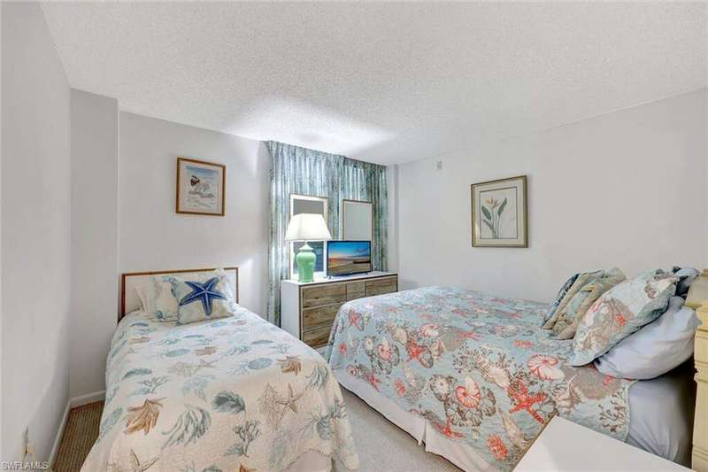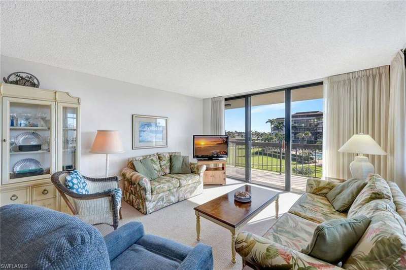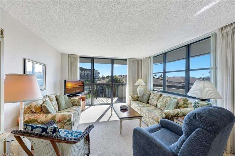 Discover the potential in this spacious 2-bedroom, 2-bath unit located on the third floor of South Seas East. The building features a charming open-air courtyard surrounded by lush tropical landscaping, creating a peaceful and welcoming entryway. Located within the desirable 24-hour guard-gated community of South Seas, residents enjoy access to a wealth of resort-style amenities including private beach access, a heated swimming pool, tennis and pickleball courts, shuffleboard, bocce, a chickee hut, community barbecue area, available dock leases, kayak storage, and even a car wash station. This light-filled residence offers and open floor plan, and a screened lanai accessible from both the living room and primary bedroom. Enjoy tranquil views of the tropical landscape, pool area, and bay waters-a perfect spot to unwind and take in the island atmosphere. While the kitchen and baths are ready for your personal updates, the layout offers a great foundation to create your ideal coastal retreat. The primary suite includes an en-suite bath and ample closet space and guest bedroom. New roof was added to the building in 2023. Whether you're seeking a renovation opportunity, investment property, or vacation getaway, this condo offers excellent value in a prime Marco Island location just minutes from shopping, dining, and the beach.