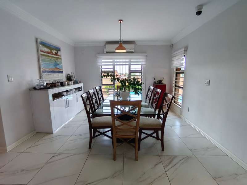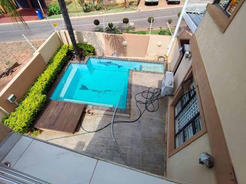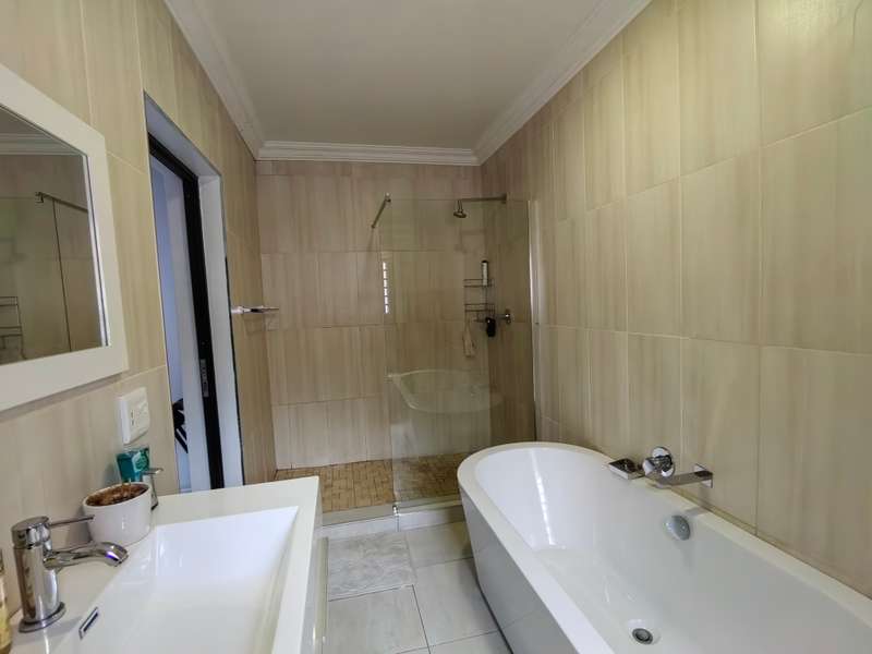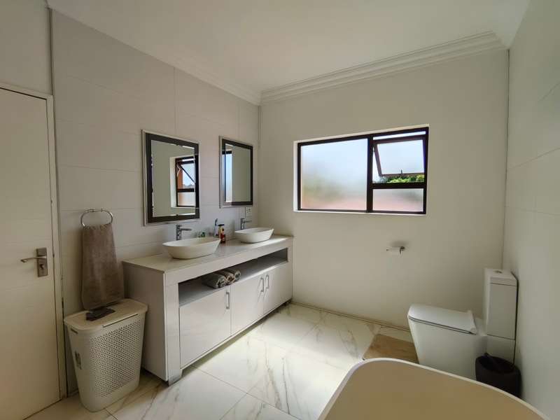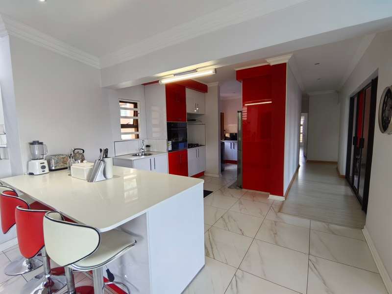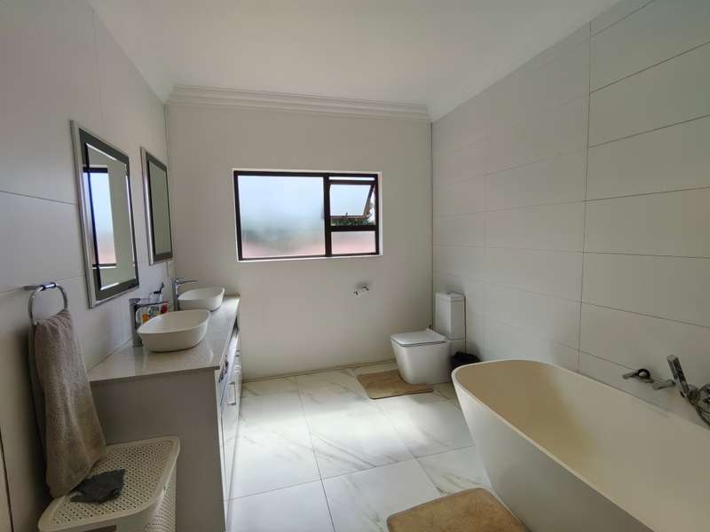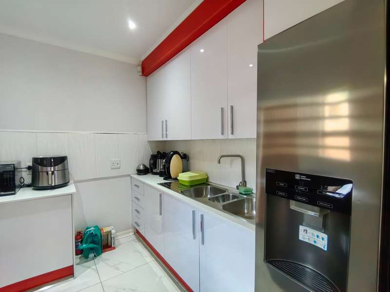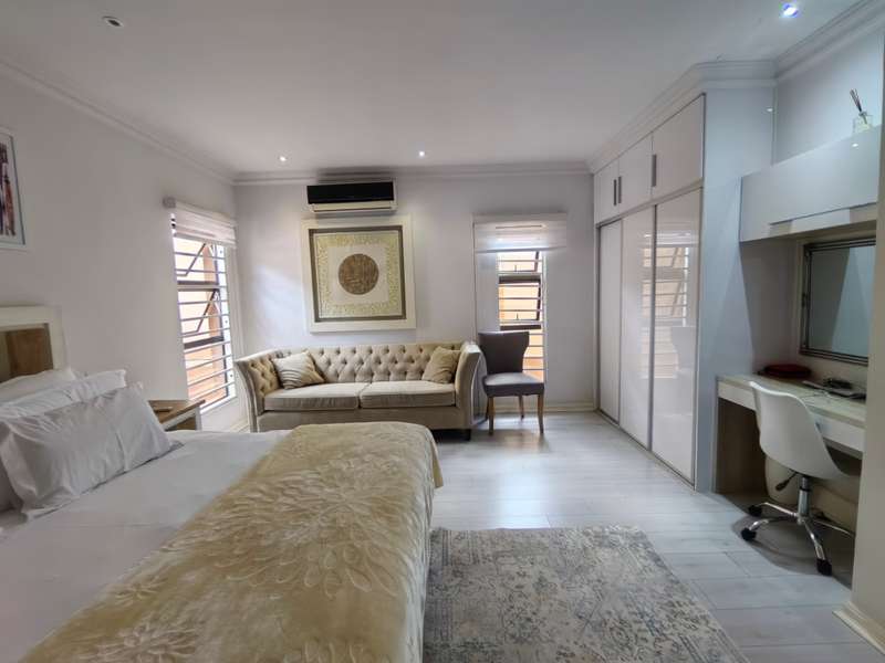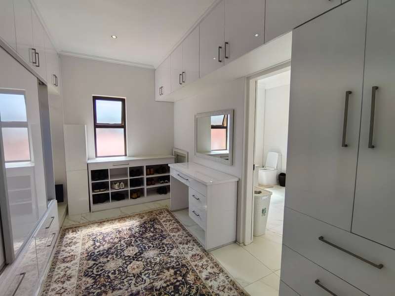 This stunning double-storey residence is a true testament to modern design and luxurious comfort. Immaculately planned and built to offer space, style, and practicality, this home is perfect for large families, entertainers, or anyone seeking a sophisticated lifestyle in a secure and versatile setting. Upon entering, you’re greeted by a bright and expansive open-plan kitchen and dining area, the heart of the home. This modern space flows effortlessly into a spacious lounge, where large sliding doors open out to a covered patio and beautiful pool area, blending indoor and outdoor living to perfection. Whether you’re hosting a summer braai or enjoying a quiet morning coffee, this space invites relaxation and connection. The ground floor features two well-sized bedrooms, one of which includes a private ensuite and a generous walk-in closet—ideal for guests or extended family. Every room, including common areas, is fitted with air conditioning, providing year-round comfort in every corner of the house. A separate full bathroom downstairs adds convenience and functionality to the layout. Upstairs, the home continues to impress. A cozy yet stylish second lounge offers a relaxed family space, while the adjoining entertainment area is complete with a standout wine wall, ideal for showcasing a curated collection or entertaining guests in style. The master bedroom suite is nothing short of a private sanctuary. Spacious and light-filled, it boasts a luxurious ensuite bathroom with a huge walk-in shower, an expansive walk-in closet, a dedicated dressing and makeup station, and a built-in work desk for those who work from home. Glass sliding doors open to a private balcony, offering serene views and a peaceful retreat from daily life. Adding incredible value and flexibility are two separate flatlets, each fully equipped with its own kitchen, bathroom, and built-in wardrobes—ideal for rental income, guest accommodation, or multigenerational living. The outdoor space is designed for enjoyment, featuring a beautiful pool, a covered patio, and manicured surroundings that enhance the overall aesthetic. The property also includes a double garage with seamless flow into a third covered carport, providing ample parking for multiple vehicles. Security and practicality are key, with CCTV surveillance in all common areas for peace of mind, three geysers ensuring efficient hot water supply throughout the home, and a JoJo water tank with pump system, offering a sustainable water solution. This property is a rare find—elegantly styled, generously proportioned, and packed with modern features. It offers the perfect balance between luxurious family living and smart investment potential.