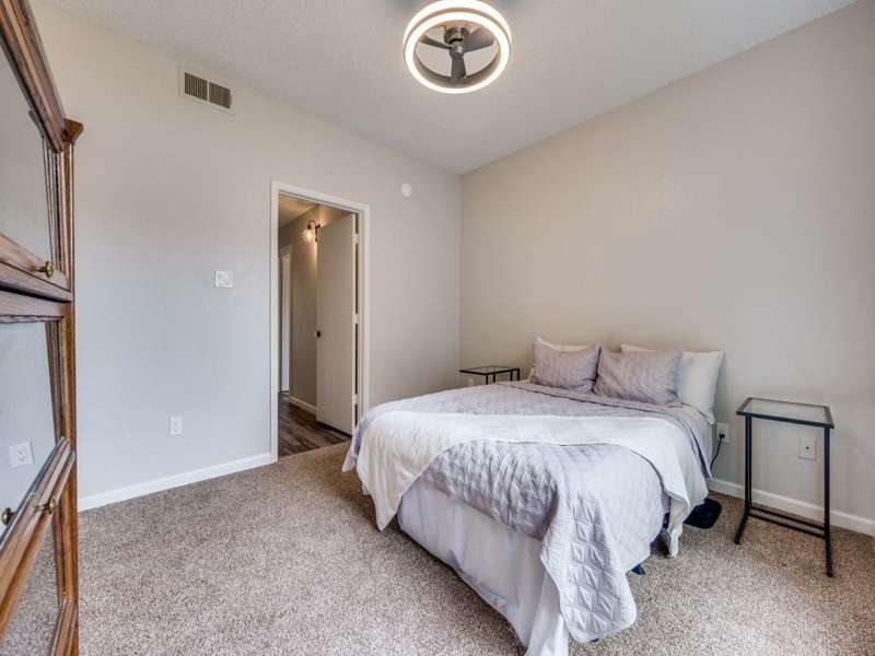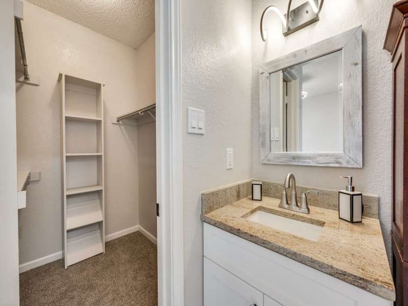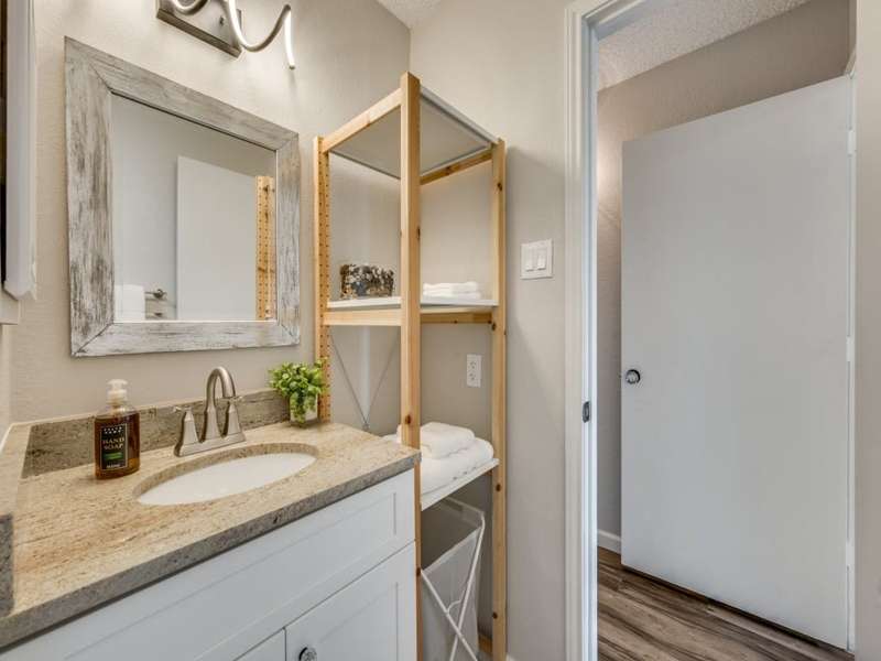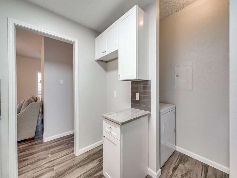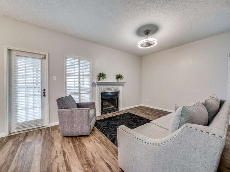 Welcome to the recently updated and beautifully appointed first floor condo home. Solid flooring all the living and high traffic areas and carpet in the bedrooms for comfort and relaxing. Enter to the open light and bright Living area with wonderful laminate wood-like flooring and stunning fireplace which includes tile accents and a wide mantel. To the side is your kitchen showcasing plenty of storage, ample counter space, and white appliances. From the kitchen there is a large pass-through window, great for entertaining, to your dining area. The dining area overlooks the covered back patio great for enjoying the morning breeze or evening sounds. Both bedrooms are well-sized and have access to individual sinks. No fighting over mirror time! Take a moment to notice all the updated details throughout. This home has been thoughtfully prepared for your move-in. Located within short distances to all the necessary and desired eateries, entertainment, and shopping. Don't forget the community pool for the warm Texas days. A bonus is the washer and dryer that are included with an accepted offer!