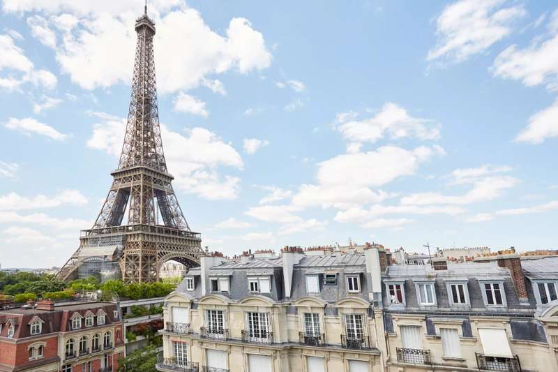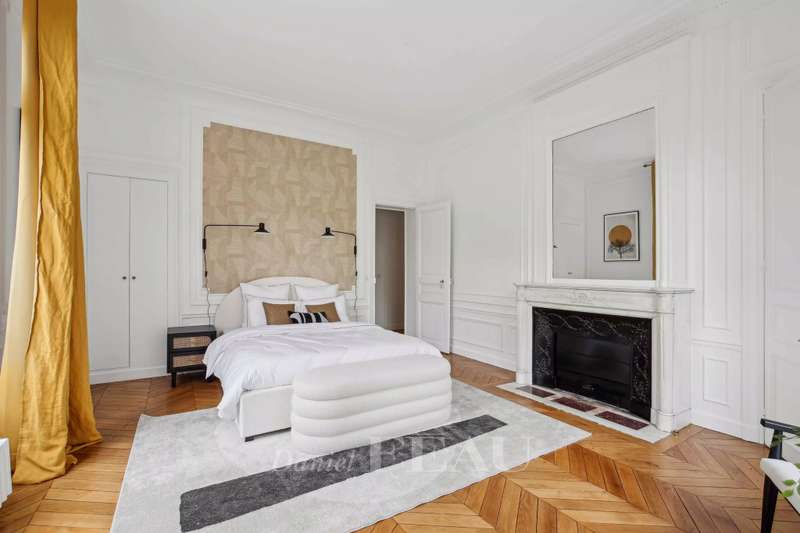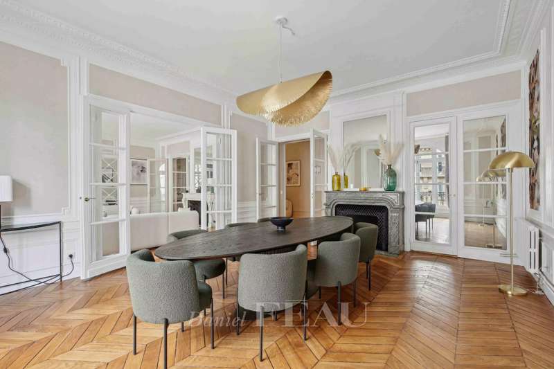 This exceptional family apartment commanding a superb view of the Eiffel Tower is on the 3rd floor of a magnificent Haussmannian corner building located in the immediate vicinity of the Champ-de-Mars in the heart of the capital’s prestigious Gros Caillou neighbourhood. Renovated throughout and bathed in sunshine, it includes an entrance hall, a triple living/reception room with a dining room and drawing room/library, a kitchen with dining facilities and a pantry, a master suite with a bathroom, four further bedrooms, a bathroom, two shower rooms and a utility room. Period features include parquet flooring, mouldings and fireplaces. With a cellar.
