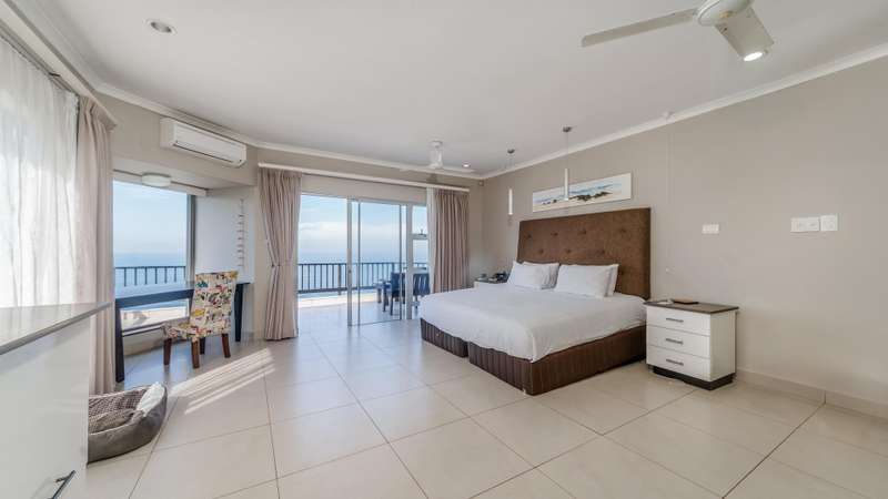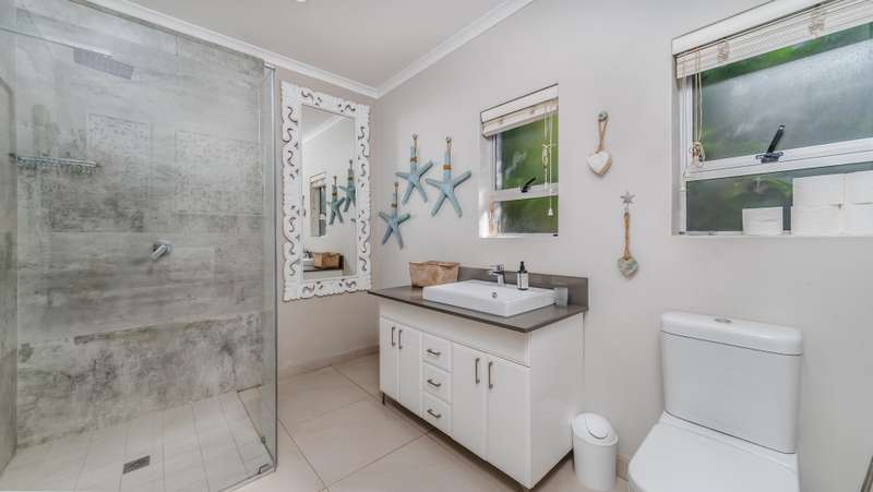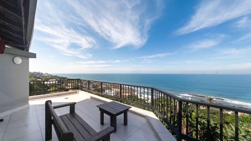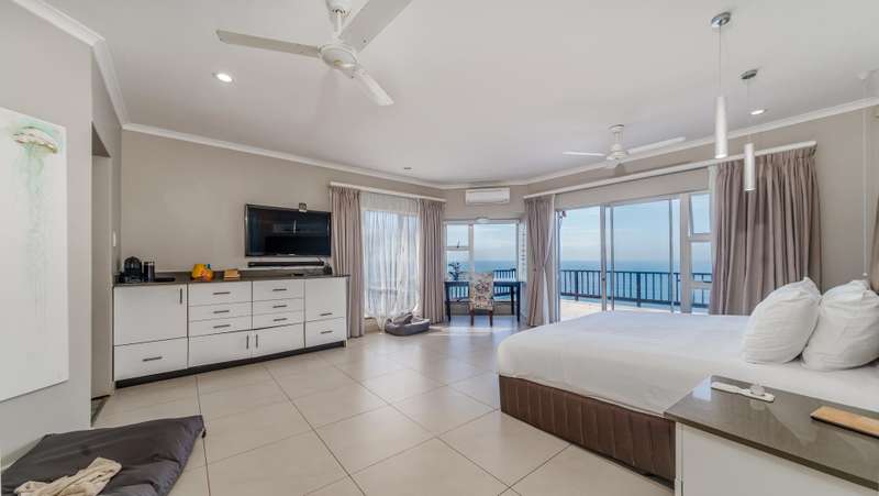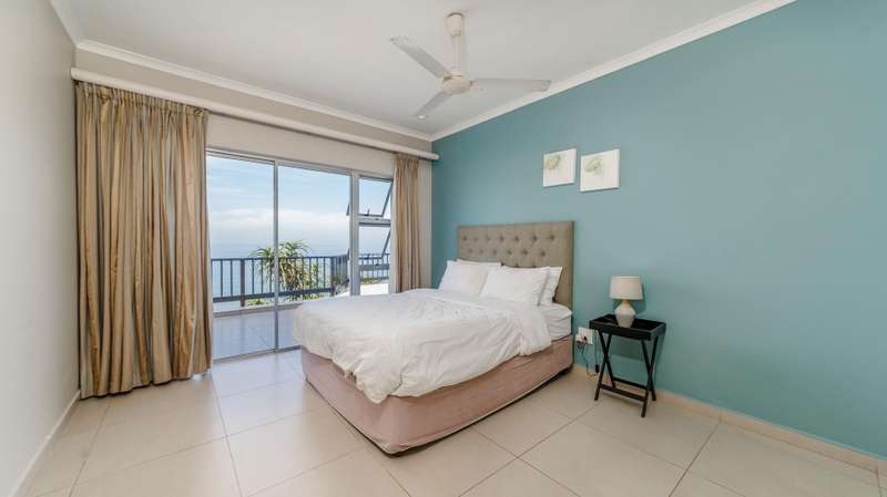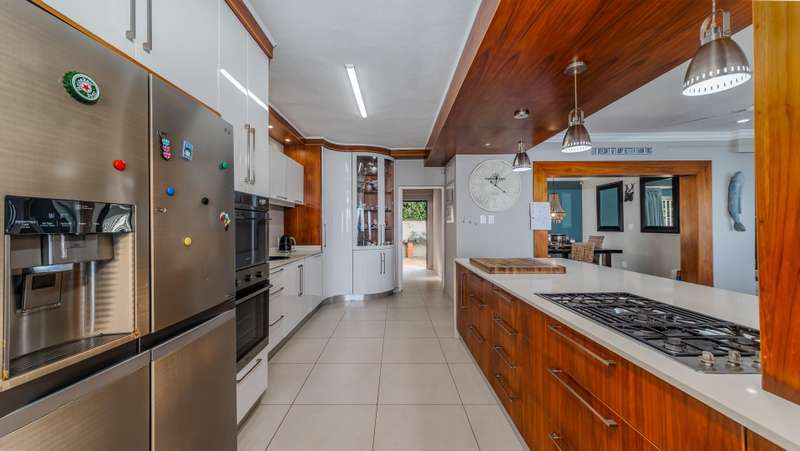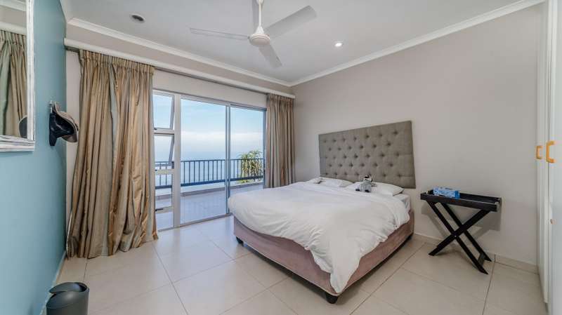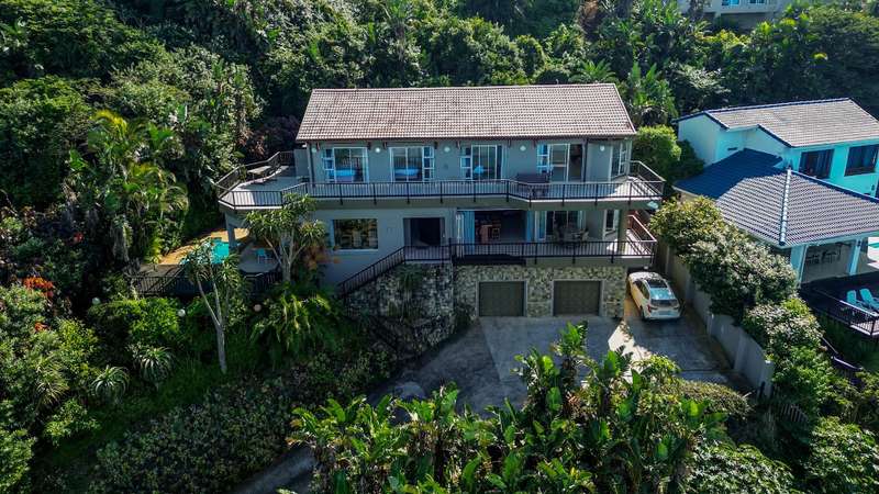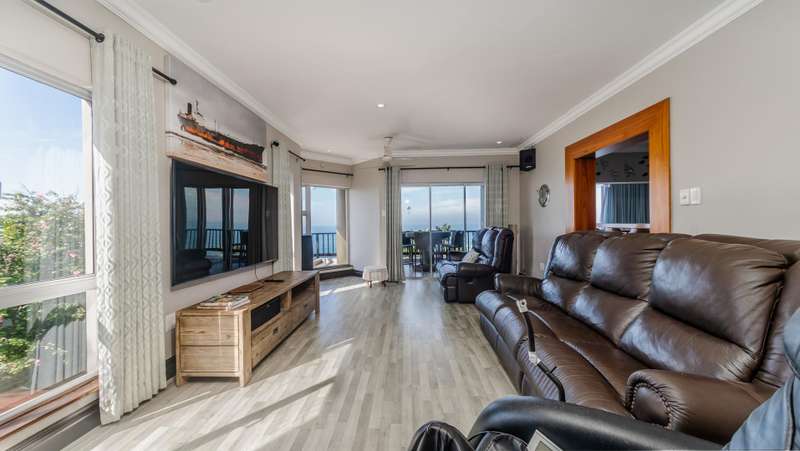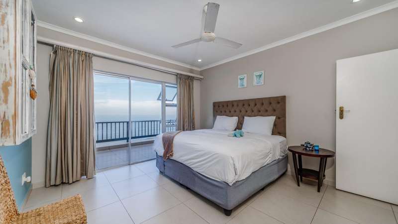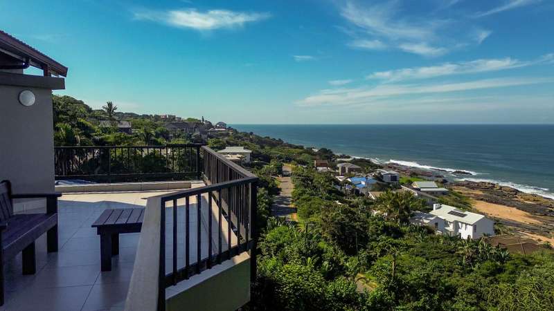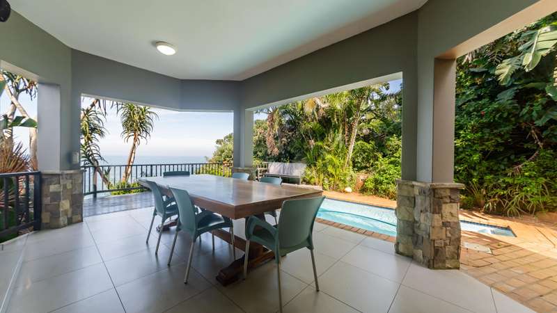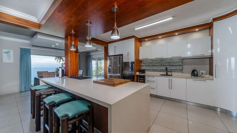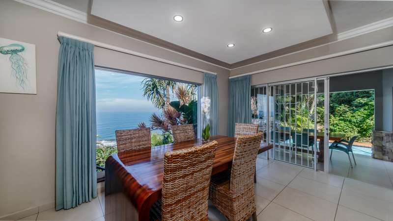 This exceptional five-bedroom coastal home, set in an elevated position, boasts sweeping panoramic ocean views and a design focused on relaxed luxury and seamless indoor-outdoor living. Perfectly suited for both family living and entertaining, the home?ÇÖs expansive layout is spread across multiple levels. The main living floor features spacious open-plan areas that flow effortlessly onto two shaded verandahs. One of these verandahs adjoins a protected pool area and includes a built-in braai, making it ideal for gatherings while soaking in the uninterrupted sea views. The heart of the home is a beautifully appointed kitchen, echoing a contemporary nautical style, and complemented by two separate dining areas and a fitted bar that opens to the outdoors. The upper level houses five generously sized bedrooms, four of which open onto a broad sea-facing balcony. The air-conditioned master suite offers luxurious proportions, complete with a dressing room, a double-vanity en-suite, and breathtaking ocean vistas. Two additional bathrooms serve the remaining bedrooms, ensuring comfort for family and guests alike. Further enhancing this home?ÇÖs appeal is a fully self-contained one-bedroom flatlet, ideal for guests or extended family. The basement level includes double garaging and an en-suite staff suite with internal access to the main house. Additional standout features include ceiling fans throughout, a 5kV solar system, JoJo water backup, a heated pool, and built-in braais. Offering a perfect blend of sophisticated design and coastal charm, this property is a rare opportunity for those seeking an idyllic seaside lifestyle.