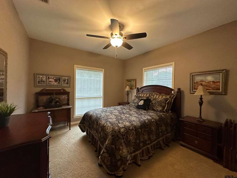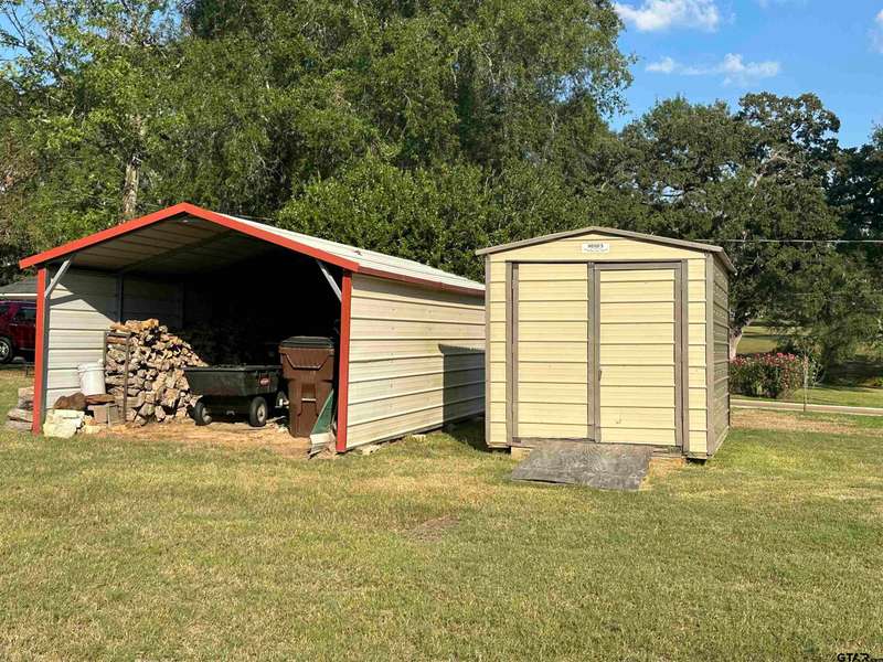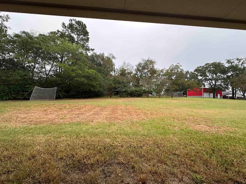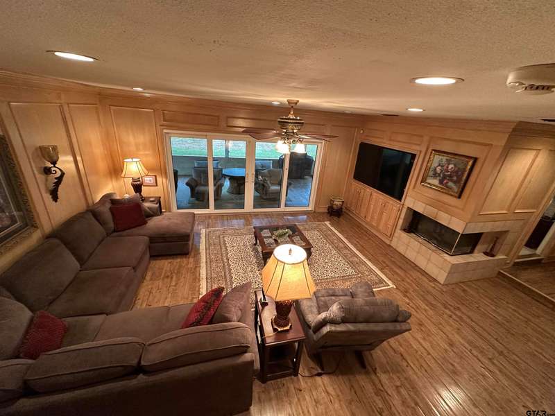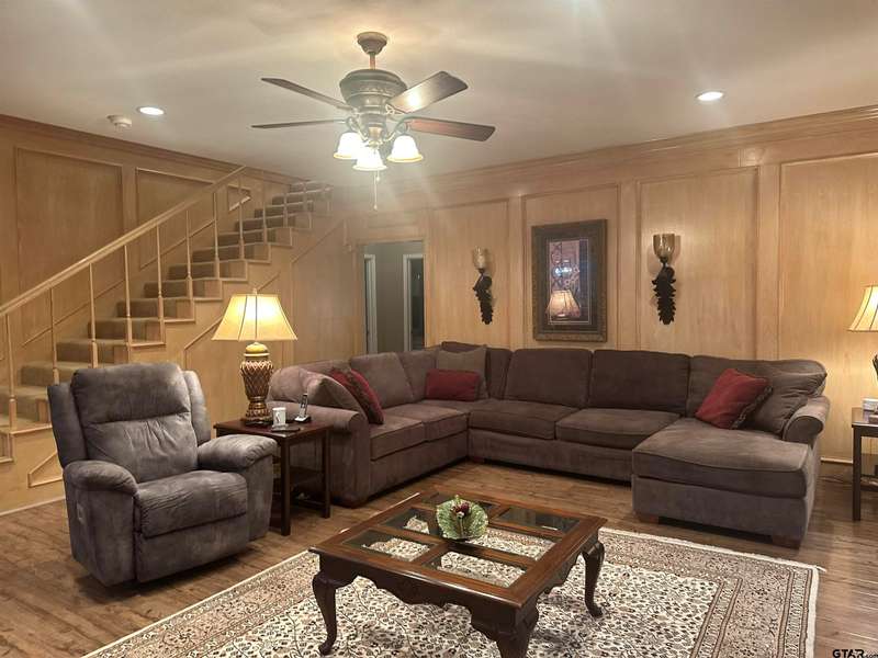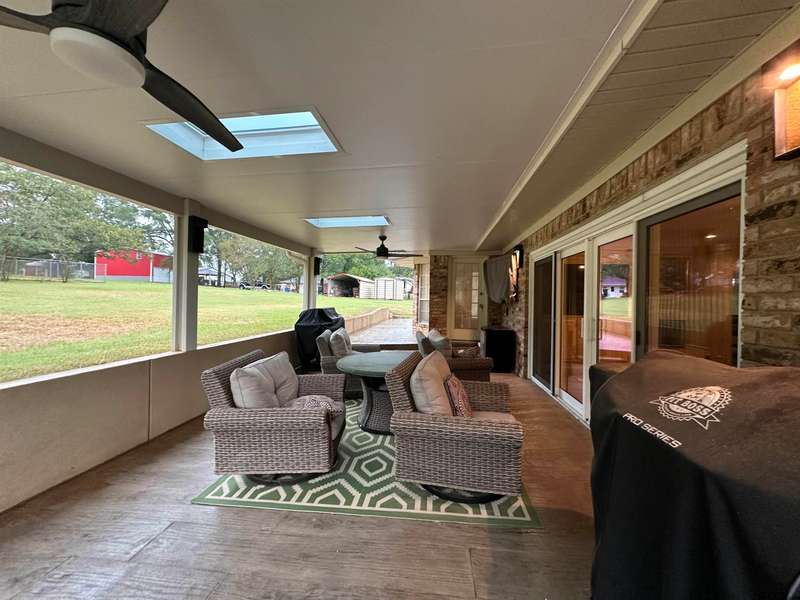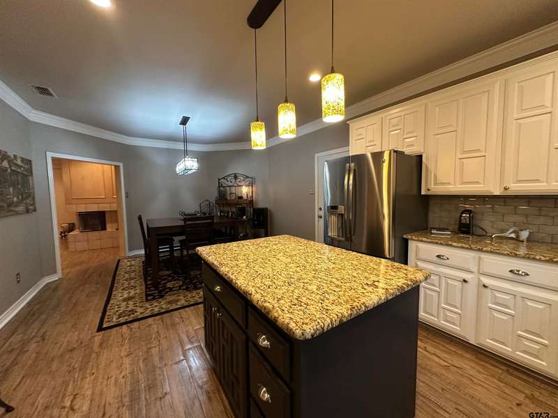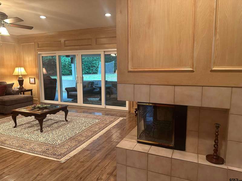 This spacious home features an inviting open floor plan with vinyl plank (laminate) flooring throught the main areas. The large kitchen boasts granite countertops, pullout drawers, timed lighting above cabinets for a nice ambience, abundant cabinet storage and counter space plus a cozy breakfast nook. The living room offers a 2 sided fireplace and a built-in entertainment center. Living room opens to a hurrican sliding 4 panel glass door to covered patio with concrete flooring and a large backyard. Included is a formal dining room with double french glass doors. Three total bedrooms (all carpet) and two full (tiled floor) bathrooms are located downstairs. A split master bedroom with sitting area....also featuring a fabulous updated master bath offering a super large walk in glass shower, double vanites as well as a super sized walk in closet . Upstairs you'll you find a versatile space that can serve as a fourth bedroom or game room, complete with a large closet and a full bath that is at the end of the hallway. Addn highlights include zoned heat and air, 2 water heaters and 2 car garage, storage building included.