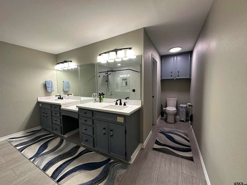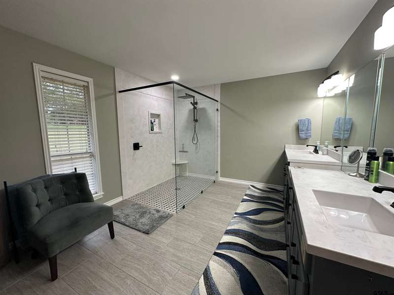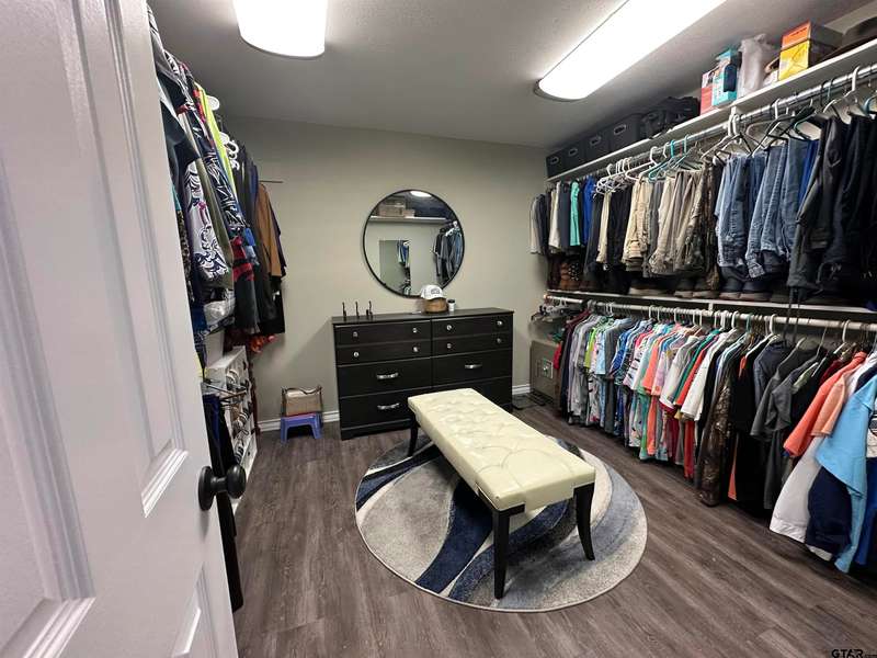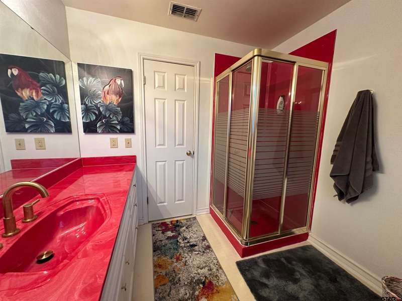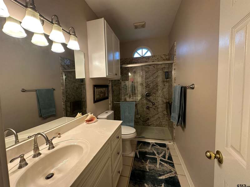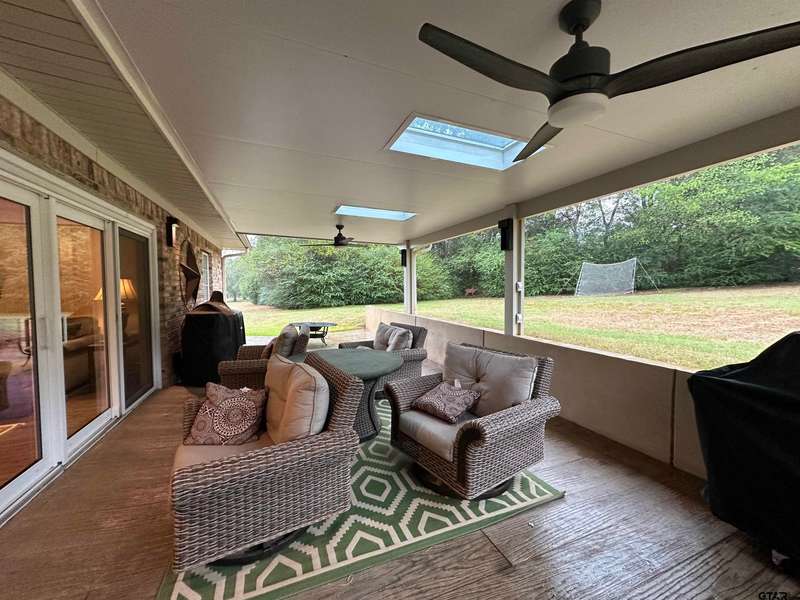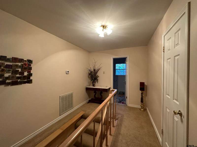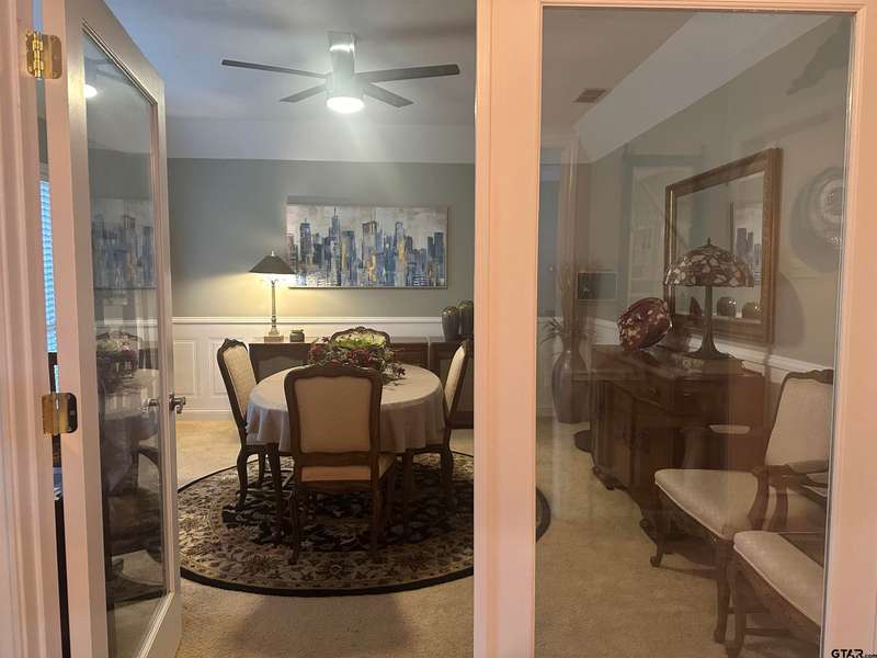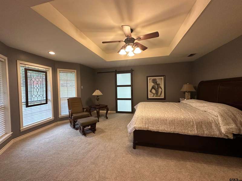 This spacious home features an inviting open floor plan with vinyl plank (laminate) flooring throught the main areas. The large kitchen boasts granite countertops, pullout drawers, timed lighting above cabinets for a nice ambience, abundant cabinet storage and counter space plus a cozy breakfast nook. The living room offers a 2 sided fireplace and a built-in entertainment center. Living room opens to a hurrican sliding 4 panel glass door to covered patio with concrete flooring and a large backyard. Included is a formal dining room with double french glass doors. Three total bedrooms (all carpet) and two full (tiled floor) bathrooms are located downstairs. A split master bedroom with sitting area....also featuring a fabulous updated master bath offering a super large walk in glass shower, double vanites as well as a super sized walk in closet . Upstairs you'll you find a versatile space that can serve as a fourth bedroom or game room, complete with a large closet and a full bath that is at the end of the hallway. Addn highlights include zoned heat and air, 2 water heaters and 2 car garage, storage building included.