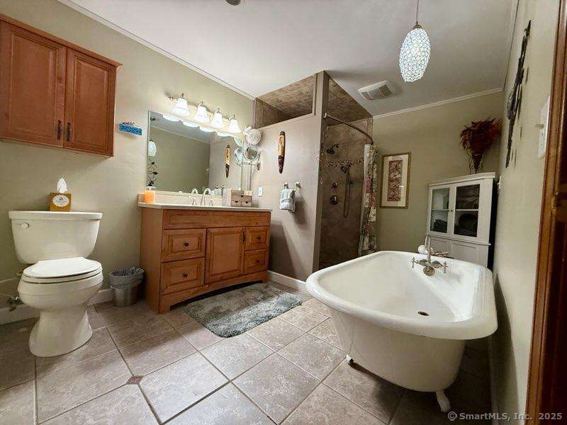 This oversized Raised Ranch does not waste an inch of space. It is simply spectacular! Welcome to the home where every day feels like a vacation. Located on a peaceful cul-de-sac, this fully renovated gem is located in a sought-after neighborhood only a mile from South Windsor High. This house was built for making memories. The open-concept design centers around an updated kitchen, featuring granite counters for miles and a brilliant flow that keeps the conversation going, whether you're indoors or stepping out onto the huge deck and lovely backyard. Need space? You got it! The spectacular, fully finished, walk-out lower level is an absolute game-changer. Featuring a flex room, full bath, laundry, living room, and a possible kitchen, this is the perfect space for an in-law apartment, ultimate media room, or dedicated space for multi-generational living. Find tranquility in the Primary Suite, a peaceful retreat with a walk-in closet and a luxurious en suite featuring both a step-in sh