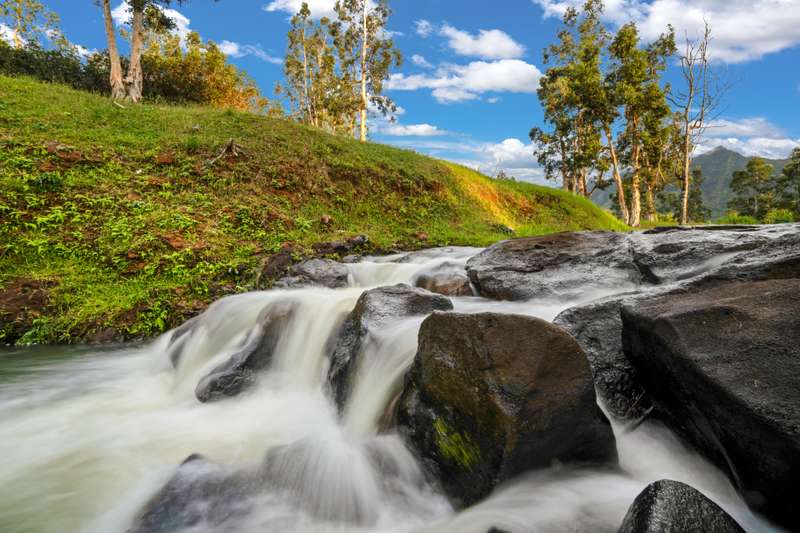 The stream flows year-round, wrapping gently around the edge of the property like a silken ribbon. Its cascading waters tumble over natural rock waterfalls, creating pristine, large crystal-clear swimming holes.