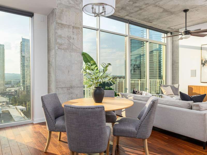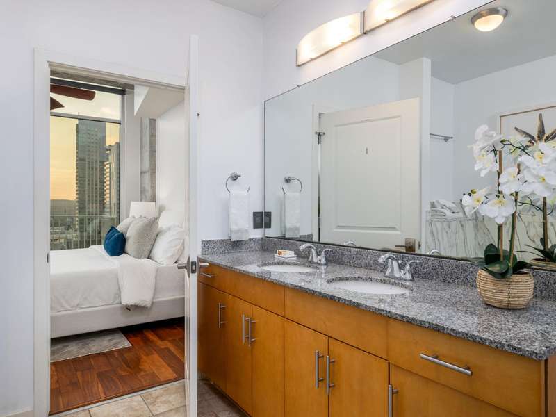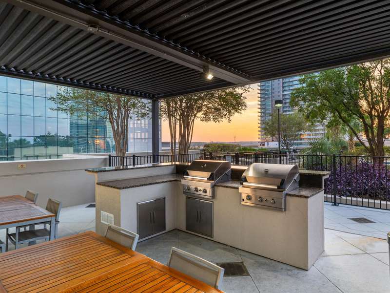 Located on the 16th floor, the residence features soaring 12-foot ceilings exclusive to this level, filling the open layout with natural light and dramatic skyline views. Two balconies with sliding glass doors provide seamless indoor-outdoor living. New HVAC and new water heater. Two parking spots are owned with this unit and are adjacent to the elevator on parking level 3. Prime downtown location: Right on the Hike & Bike Trail, a block from Trader Joe's and the Austin Public Library. Tucked onto a quiet dead-end street that minimizes traffic while offering walkability to Austin's best dining and nightlife, including Whole Foods Flagship, La Condesa, True Food Kitchen, Jo's Coffee, Fareground Food Hall, J. Carver's, Clark's Oyster Bar, North Italia, and ATX Cocina. Around the corner from Tiniest Bar in Texas, The Ginger Man, and the Seaholm District's restaurants and shops. Adjacent to Alpha School and close to Headwaters School on Rio Grande.Outstanding amenities at the 360 include:24/7 concierge services, media room, owners' lounge with full kitchen, pool, grills and outdoor cooking areas, and a pet area located on the 4th floor garage level.