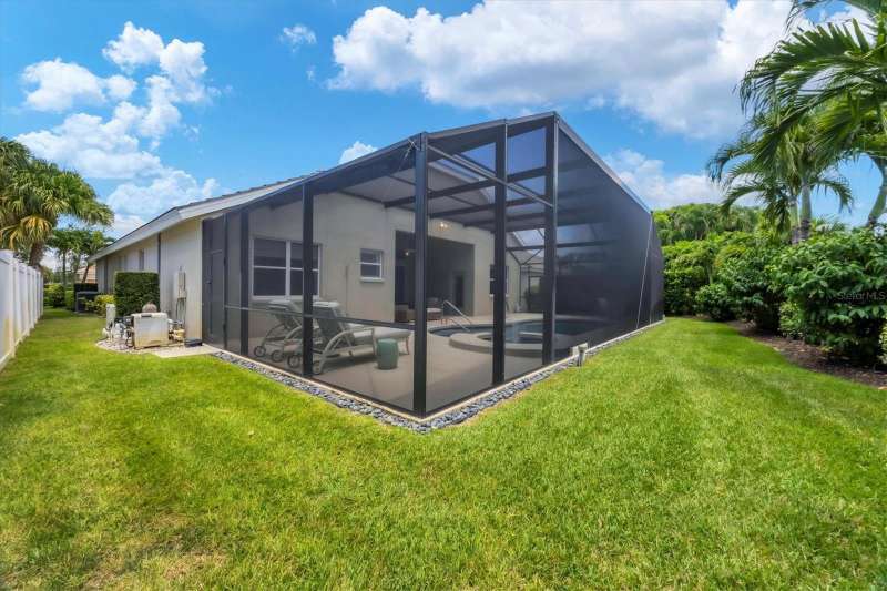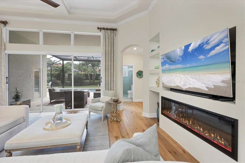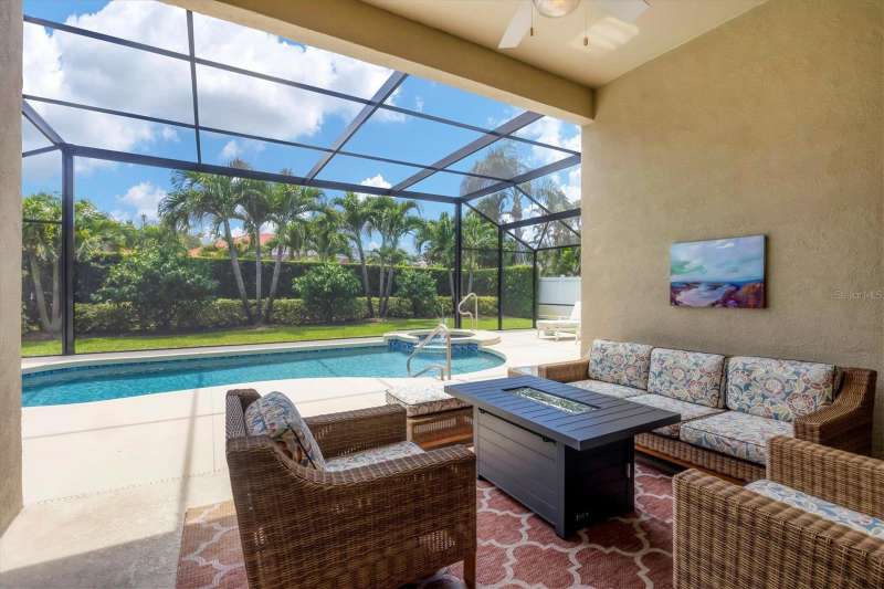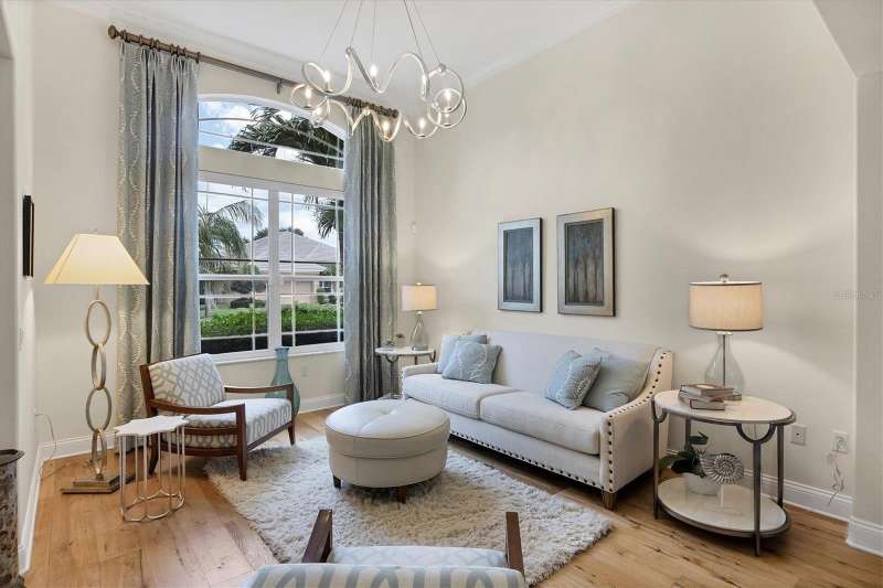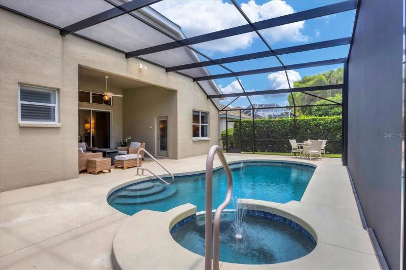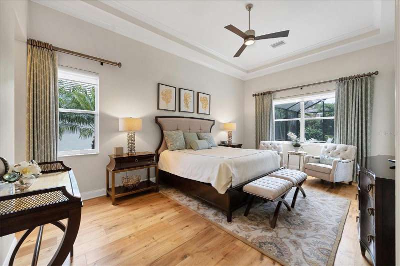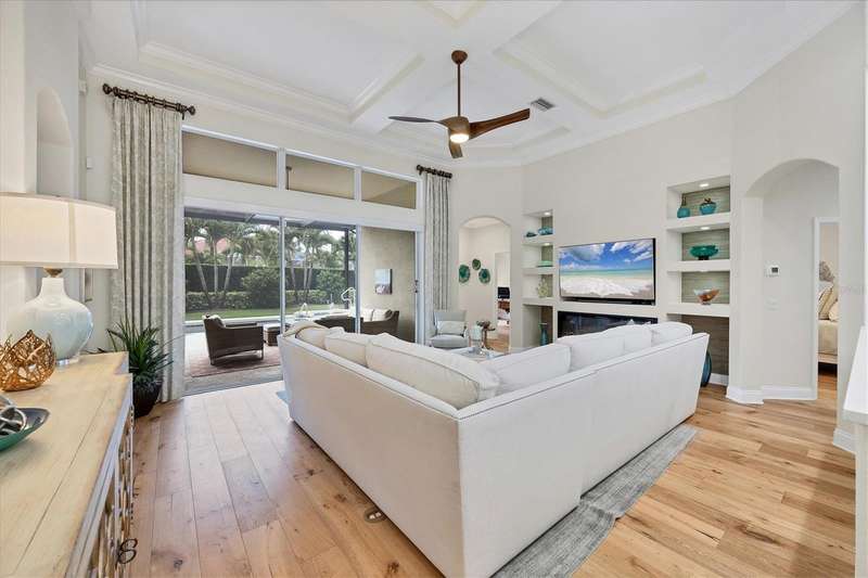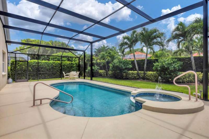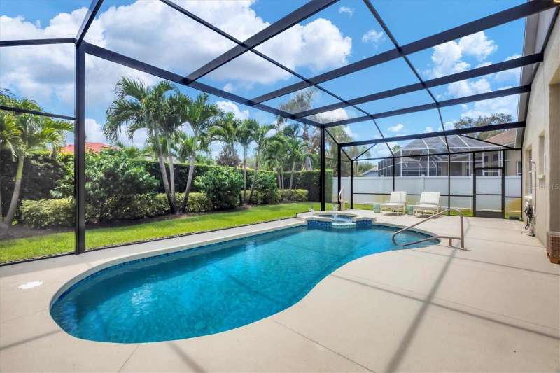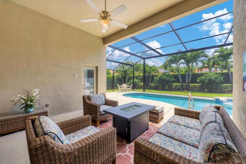 Absolutely Impeccable Designer Home in Edgewater Village! Step into this exquisite four-bedroom, three-bath residence, where every detail exudes sophistication. Featuring European French Oak flooring, custom window treatments, designer finishes and natural light throughout, this home offers both elegance and comfort. The chef’s kitchen offers an all-white cabinetry design, a modern gas cooktop, convenient beverage center, custom panel refrigerator - all with a spacious layout and perfect for cooking and gatherings. Designed for entertaining, this home boasts a large lanai with a sparkling pool, relaxing hot tub, fireplace and a panoramic pool cage for unobstructed views and privacy. The executive primary retreat is a sanctuary with a custom walk-in closet, intricate ceiling details, and a luxuriously appointed primary bath. With an ideal split floor plan, the three additional bedrooms and baths are equally well-appointed and complete with designer wall coverings and window treatments. In addition, you will have complete peace of mind with a Brand-new Generac full house generator! Adding all this to an immaculate three-car garage with built in cabinets and workspace. Located within the gated community of Edgewater Village, residents enjoy a LOW HOA FEE and are just a short walk away from dinner and a movie in downtown Lakewood Ranch! An exceptional property in all categories! Interior furnishings are available for purchase as a package, making this home move in ready!